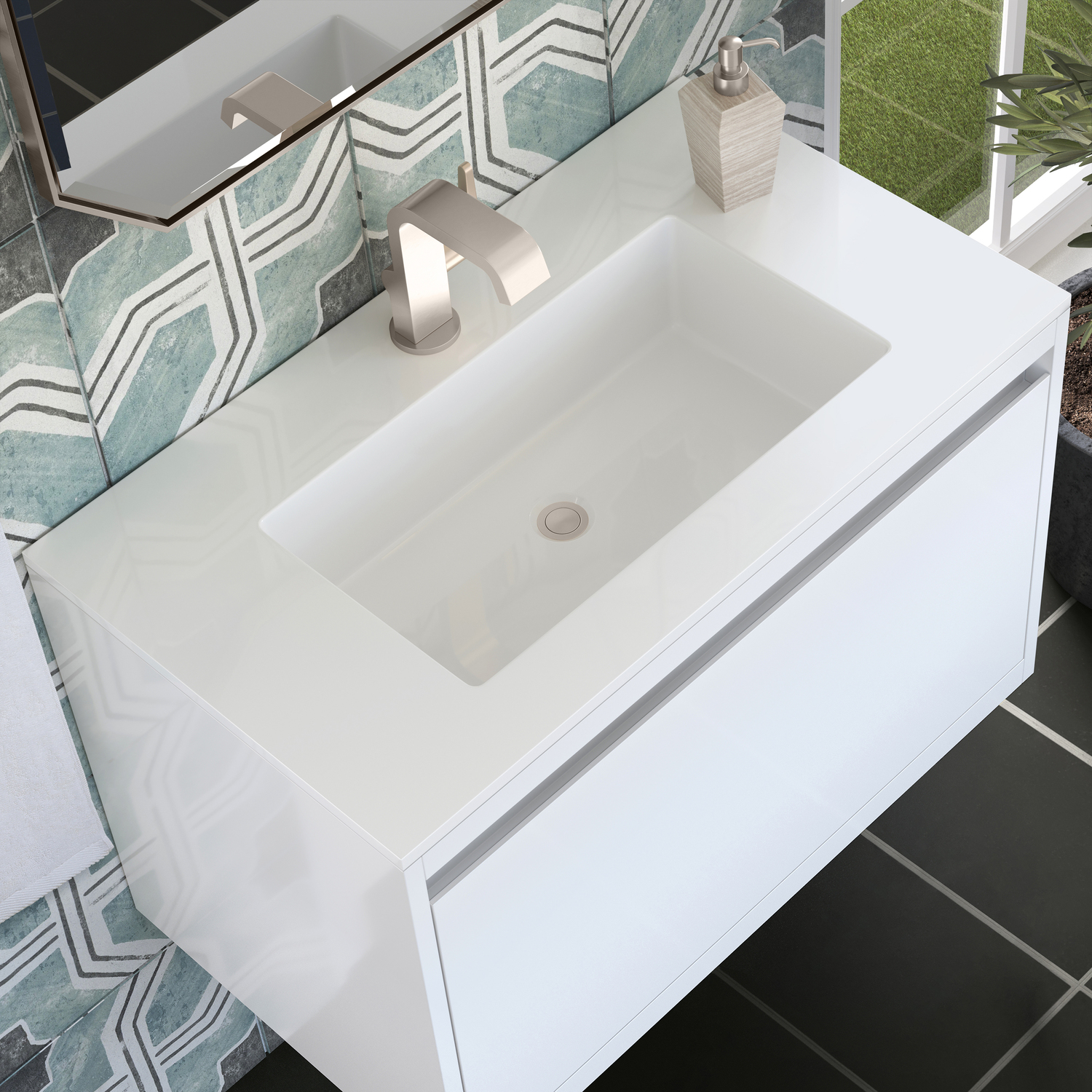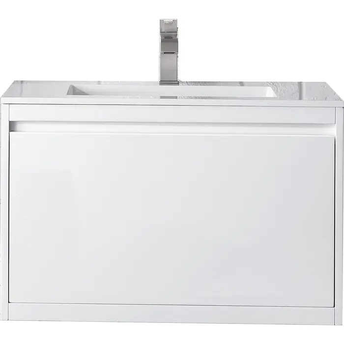 The Mantova 31.5” Glossy White Single Vanity by James Martin Vanities will elevate your space by adding a touch of timeless décor to your bathroom. This vanity combines a cutting-edge design with pristine craftmanship to bring your bathroom a clean modern look providing you with both style and functionality. Generous storage features include soft-close drawers with one removable drawer organizer. The look is completed with a Glossy White Composite Stone integrated top and sink.Glossy White single vanity with two interior drawersCabinet and integrated top and sink only, hardware/stand not includedSolid kiln-dried Grade A hardwoodCabinet is finished inside and out with a premium undercoat finish for superior moisture and UV resistanceSoft-close undermount drawer glidesDrawer bottoms are lined with our signature brushed aluminum laminateGlossy White Composite Stone integrated top and sink includedCountertop is pre-drilled for one single hole faucetFaucet sold separatelyThis cabinet can be wall-hung; mounting hardware includedIdeal for the modern home, the Mantova Collection by James Martin Vanities offers a clean, contemporary look. Superbly crafted out of durable wood, it is immediately recognizable by its inherent beauty and durability. A true masterpiece of elegance and style, that is available in either a freestanding or wall-mounted edition. Each drawer is soft closing with ample storage room, that does not impede the design aesthetic of the overall piece. Each vanity comes with your choice of composite sink color either a Glossy White or a Charcoal Black Matte, as well as two options in cabinet finishes, Mid-Century Walnut or Glossy White. To complete the look, choose between three options for the metal base; Brushed Nickel, Champagne Brass, or Matte Black. The Mantova collection is available in multiple sizes and will work with a wide variety of different styles and decors.1 year warranty against manufacturer's defects. We will repair or replace any defective product, if the product is defective in material or workmanship at our discretion. No warranty is expressed or implied regarding damages resulting from consumer misuse.