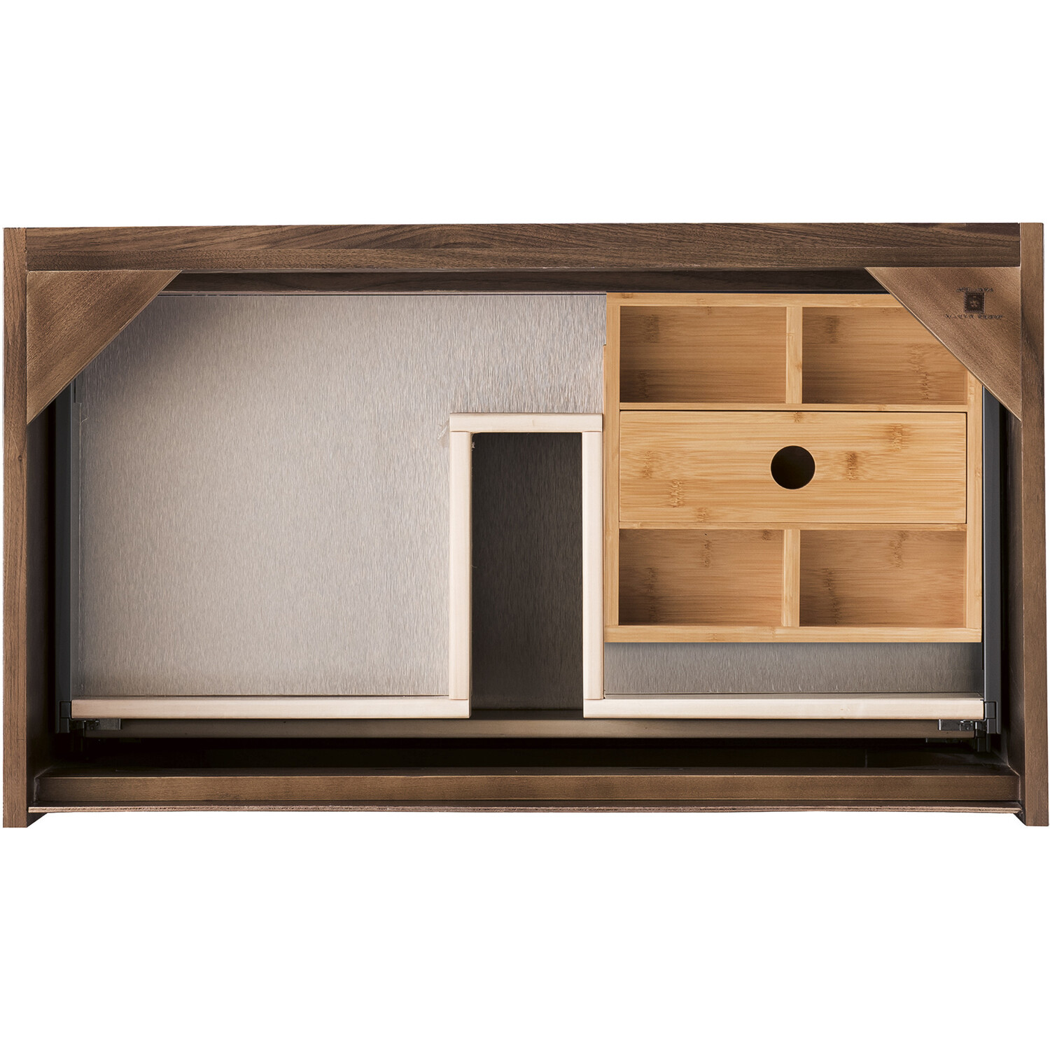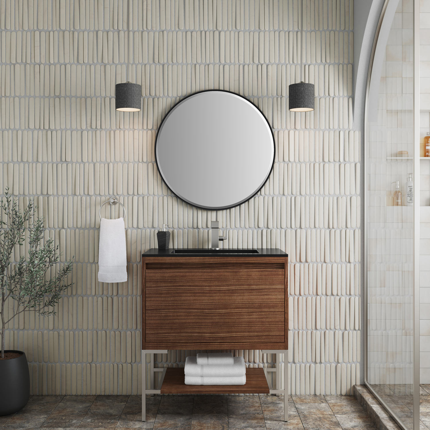 The Mantova 31.5” Mid-Century Walnut Single Vanity by James Martin Vanities will elevate your space by adding a touch of timeless décor to your bathroom. This vanity combines a cutting-edge design with pristine craftmanship to bring your bathroom a clean modern look providing you with both style and functionality. Generous storage features include soft-close drawers with one removable drawer organizer. The look is completed with Brushed Nickel finished Stainless Steel Base and a Charcoal Black Composite Stone integrated top and sink.Mid-Century Walnut single vanity with two interior drawers and lower open shelvingHardware/Stand Finish: Brushed NickelSolid kiln-dried Grade A hardwoodCabinet is finished inside and out with a premium undercoat finish for superior moisture and UV resistanceSoft-close undermount drawer glidesDrawer bottoms are lined with our signature brushed aluminum laminateCharcoal Black Composite Stone integrated top and sink includedCountertop is pre-drilled for one single hole faucetFaucet sold separatelyIdeal for the modern home, the Mantova Collection by James Martin Vanities offers a clean, contemporary look. Superbly crafted out of durable wood, it is immediately recognizable by its inherent beauty and durability. A true masterpiece of elegance and style, that is available in either a freestanding or wall-mounted edition. Each drawer is soft closing with ample storage room, that does not impede the design aesthetic of the overall piece. Each vanity comes with your choice of composite sink color either a Glossy White or a Charcoal Black Matte, as well as two options in cabinet finishes, Mid-Century Walnut or Glossy White. To complete the look, choose between three options for the metal base; Brushed Nickel, Champagne Brass, or Matte Black. The Mantova collection is available in multiple sizes and will work with a wide variety of different styles and decors.1 year warranty against manufacturer's defects. We will repair or replace any defective product, if the product is defective in material or workmanship at our discretion. No warranty is expressed or implied regarding damages resulting from consumer misuse.