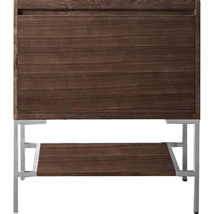 The Mantova 31.5” Mid-Century Walnut Single Vanity Cabinet by James Martin Vanities will elevate your space by adding a touch of timeless décor to your bathroom. This vanity combines a cutting-edge design with pristine craftmanship to bring your bathroom a clean modern look providing you with both style and functionality. Generous storage features include soft-close drawers with one removable drawer organizer. Brushed Nickel finished Stainless Steel Base is included.Mid-Century Walnut single vanity cabinet with two interior drawers and lower open shelvingHardware/Stand Finish: Brushed NickelSolid kiln-dried Grade A hardwoodCabinet is finished inside and out with a premium undercoat finish for superior moisture and UV resistanceSoft-close undermount drawer glidesDrawer bottoms are lined with our signature brushed aluminum laminateCabinet and hardware/stand only, Composite Stone integrated top and sink not includedIdeal for the modern home, the Mantova Collection by James Martin Vanities offers a clean, contemporary look. Superbly crafted out of durable wood, it is immediately recognizable by its inherent beauty and durability. A true masterpiece of elegance and style, that is available in either a freestanding or wall-mounted edition. Each drawer is soft closing with ample storage room, that does not impede the design aesthetic of the overall piece. Each vanity comes with your choice of composite sink color either a Glossy White or a Charcoal Black Matte, as well as two options in cabinet finishes, Mid-Century Walnut or Glossy White. To complete the look, choose between three options for the metal base; Brushed Nickel, Champagne Brass, or Matte Black. The Mantova collection is available in multiple sizes and will work with a wide variety of different styles and decors.1 year warranty against manufacturer's defects. We will repair or replace any defective product, if the product is defective in material or workmanship at our discretion. No warranty is expressed or implied regarding damages resulting from consumer misuse.