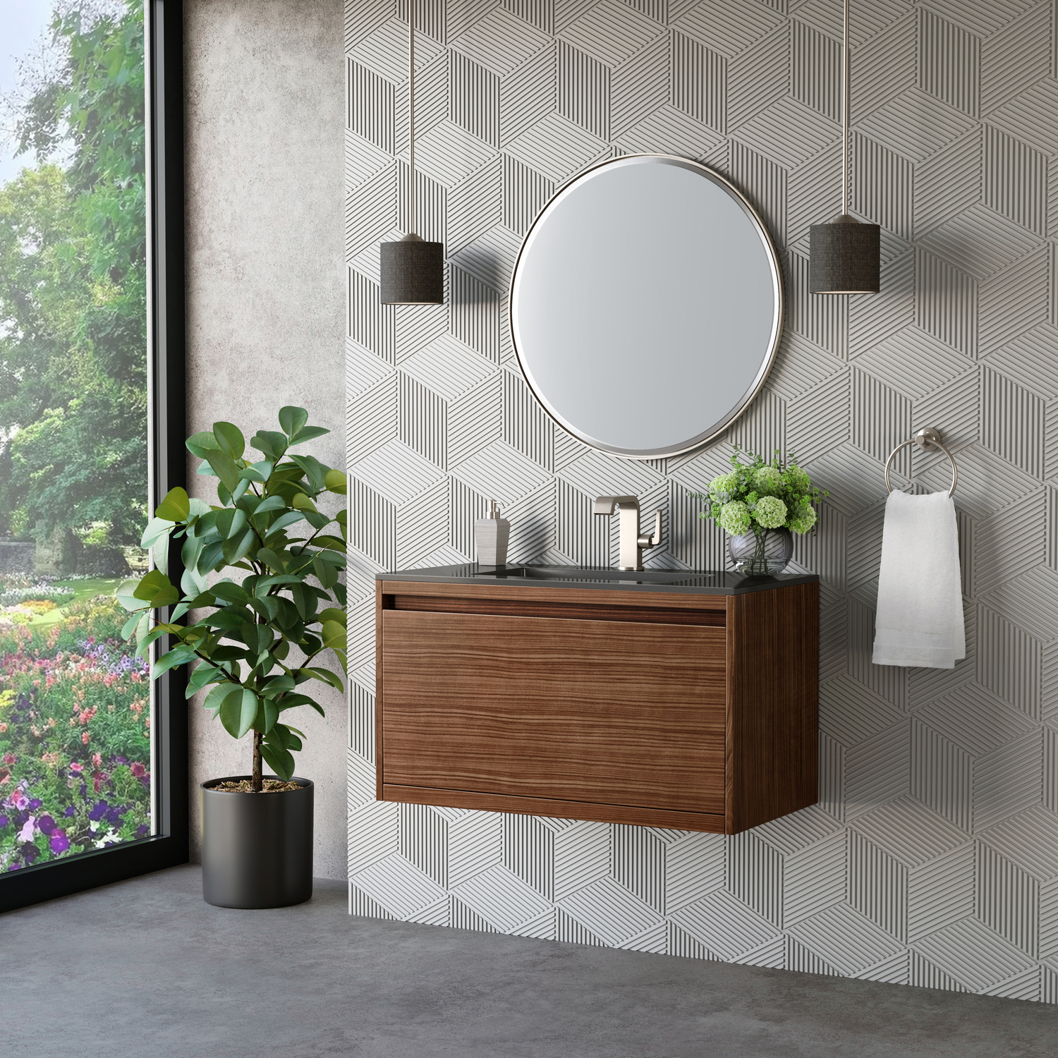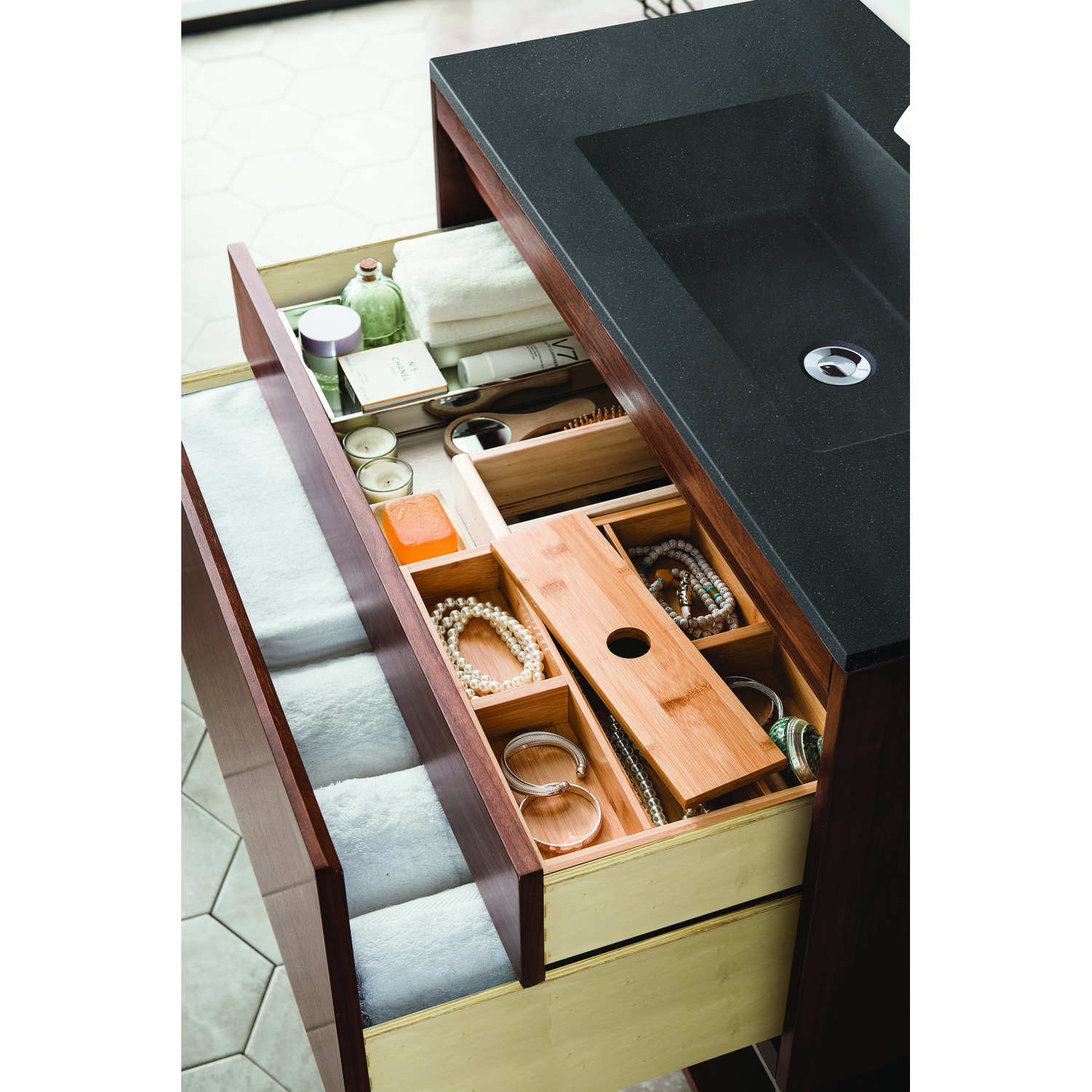 The Mantova 35.4” Mid-Century Walnut Single Vanity by James Martin Vanities will elevate your space by adding a touch of timeless décor to your bathroom. This vanity combines a cutting-edge design with pristine craftmanship to bring your bathroom a clean modern look providing you with both style and functionality. Generous storage features include soft-close drawers with one removable drawer organizer. The look is completed with Brushed Nickel finished Stainless Steel Base and a Charcoal Black Composite Stone integrated top and sink.Mid-Century Walnut single vanity with two interior drawers and lower open shelvingHardware/Stand Finish: Brushed NickelSolid kiln-dried Grade A hardwoodCabinet is finished inside and out with a premium undercoat finish for superior moisture and UV resistanceSoft-close undermount drawer glidesDrawer bottoms are lined with our signature brushed aluminum laminateCharcoal Black Composite Stone integrated top and sink includedCountertop is pre-drilled for one single hole faucetFaucet sold separatelyIdeal for the modern home, the Mantova Collection by James Martin Vanities offers a clean, contemporary look. Superbly crafted out of durable wood, it is immediately recognizable by its inherent beauty and durability. A true masterpiece of elegance and style, that is available in either a freestanding or wall-mounted edition. Each drawer is soft closing with ample storage room, that does not impede the design aesthetic of the overall piece. Each vanity comes with your choice of composite sink color either a Glossy White or a Charcoal Black Matte, as well as two options in cabinet finishes, Mid-Century Walnut or Glossy White. To complete the look, choose between three options for the metal base; Brushed Nickel, Champagne Brass, or Matte Black. The Mantova collection is available in multiple sizes and will work with a wide variety of different styles and decors.1 year warranty against manufacturer's defects. We will repair or replace any defective product, if the product is defective in material or workmanship at our discretion. No warranty is expressed or implied regarding damages resulting from consumer misuse.