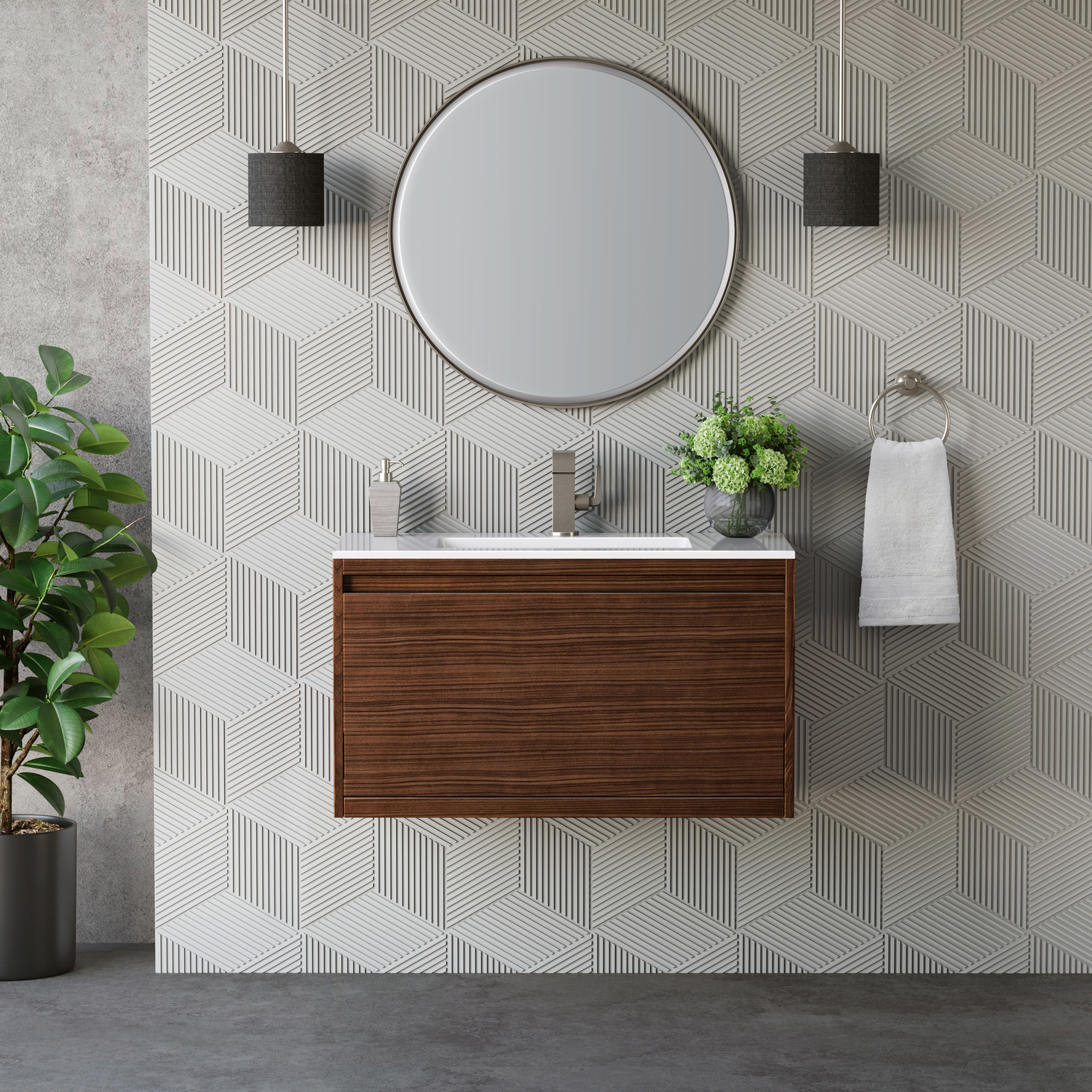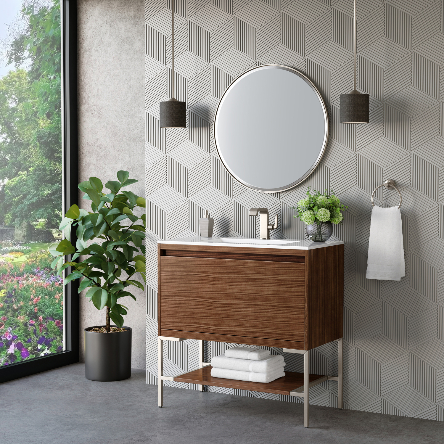 The Mantova 35.4” Mid-Century Walnut Single Vanity by James Martin Vanities will elevate your space by adding a touch of timeless décor to your bathroom. This vanity combines a cutting-edge design with pristine craftmanship to bring your bathroom a clean modern look providing you with both style and functionality. Generous storage features include soft-close drawers with one removable drawer organizer. The look is completed with Brushed Nickel finished Stainless Steel Base and a Glossy White Composite Stone integrated top and sink.Mid-Century Walnut single vanity with two interior drawers and lower open shelvingHardware/Stand Finish: Brushed NickelSolid kiln-dried Grade A hardwoodCabinet is finished inside and out with a premium undercoat finish for superior moisture and UV resistanceSoft-close undermount drawer glidesDrawer bottoms are lined with our signature brushed aluminum laminateGlossy White Composite Stone integrated top and sink includedCountertop is pre-drilled for one single hole faucetFaucet sold separatelyIdeal for the modern home, the Mantova Collection by James Martin Vanities offers a clean, contemporary look. Superbly crafted out of durable wood, it is immediately recognizable by its inherent beauty and durability. A true masterpiece of elegance and style, that is available in either a freestanding or wall-mounted edition. Each drawer is soft closing with ample storage room, that does not impede the design aesthetic of the overall piece. Each vanity comes with your choice of composite sink color either a Glossy White or a Charcoal Black Matte, as well as two options in cabinet finishes, Mid-Century Walnut or Glossy White. To complete the look, choose between three options for the metal base; Brushed Nickel, Champagne Brass, or Matte Black. The Mantova collection is available in multiple sizes and will work with a wide variety of different styles and decors.1 year warranty against manufacturer's defects. We will repair or replace any defective product, if the product is defective in material or workmanship at our discretion. No warranty is expressed or implied regarding damages resulting from consumer misuse.