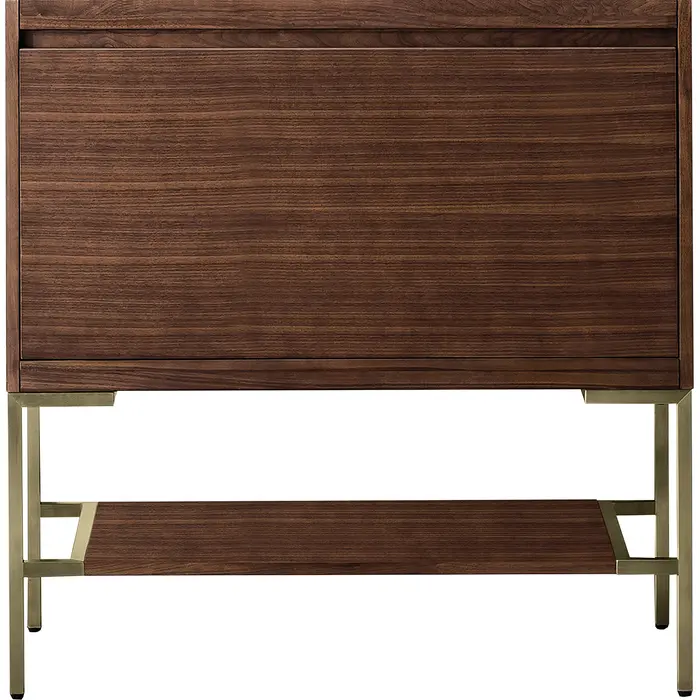 The Mantova 35.4” Mid-Century Walnut Single Vanity Cabinet by James Martin Vanities will elevate your space by adding a touch of timeless décor to your bathroom. This vanity combines a cutting-edge design with pristine craftmanship to bring your bathroom a clean modern look providing you with both style and functionality. Generous storage features include soft-close drawers with one removable drawer organizer. Champagne Brass finished Stainless Steel Base is included.Mid-Century Walnut single vanity cabinet with two interior drawers and lower open shelvingHardware/Stand Finish: Champagne BrassSolid kiln-dried Grade A hardwoodCabinet is finished inside and out with a premium undercoat finish for superior moisture and UV resistanceSoft-close undermount drawer glidesDrawer bottoms are lined with our signature brushed aluminum laminateCabinet and hardware/stand only, Composite Stone integrated top and sink not includedIdeal for the modern home, the Mantova Collection by James Martin Vanities offers a clean, contemporary look. Superbly crafted out of durable wood, it is immediately recognizable by its inherent beauty and durability. A true masterpiece of elegance and style, that is available in either a freestanding or wall-mounted edition. Each drawer is soft closing with ample storage room, that does not impede the design aesthetic of the overall piece. Each vanity comes with your choice of composite sink color either a Glossy White or a Charcoal Black Matte, as well as two options in cabinet finishes, Mid-Century Walnut or Glossy White. To complete the look, choose between three options for the metal base; Brushed Nickel, Champagne Brass, or Matte Black. The Mantova collection is available in multiple sizes and will work with a wide variety of different styles and decors.1 year warranty against manufacturer's defects. We will repair or replace any defective product, if the product is defective in material or workmanship at our discretion. No warranty is expressed or implied regarding damages resulting from consumer misuse.