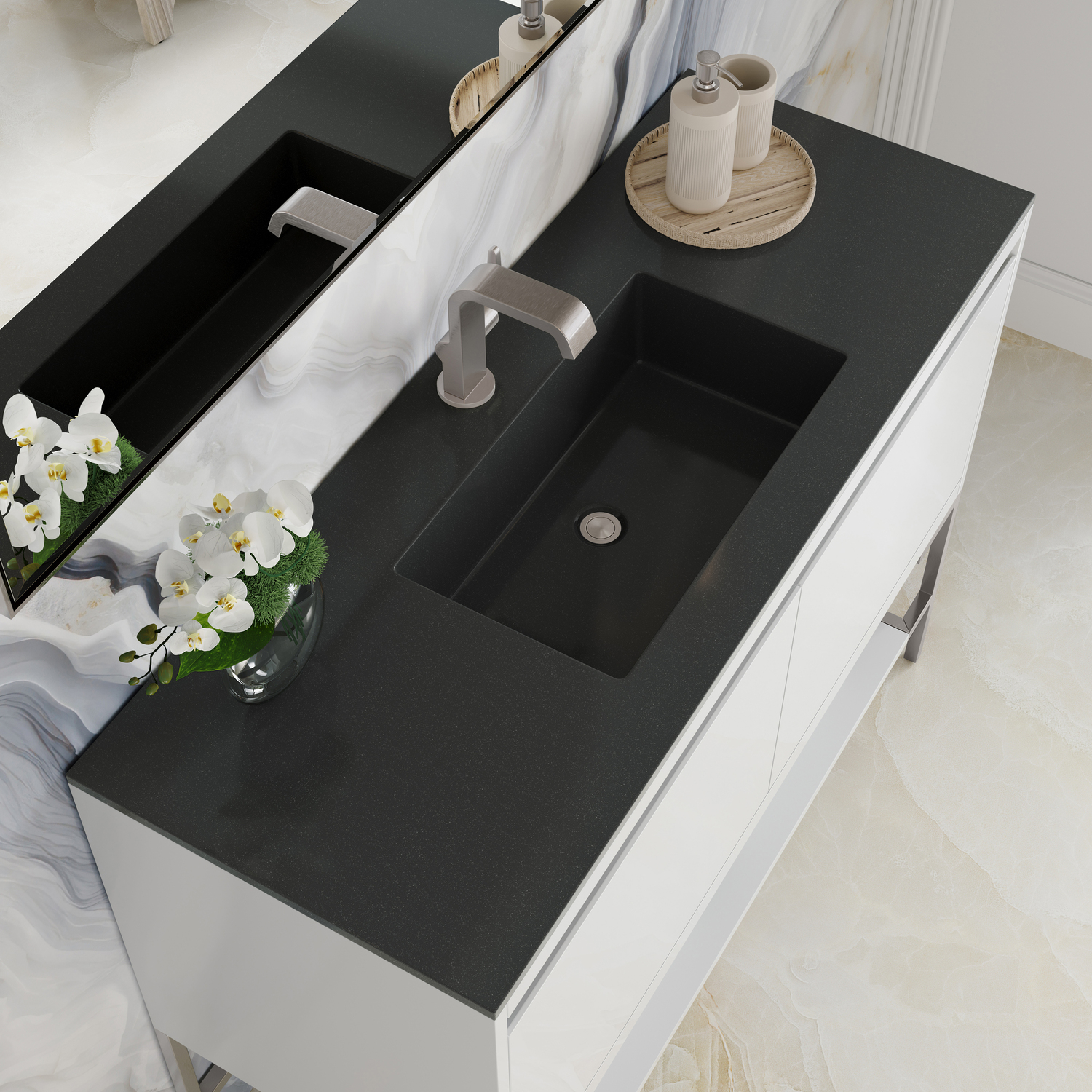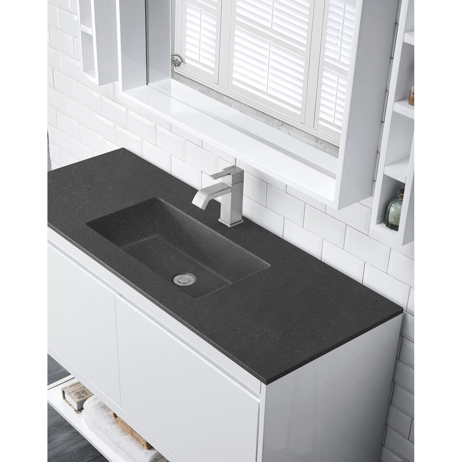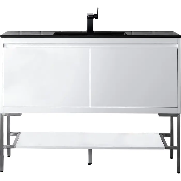 The Mantova 47.3” Glossy White Single Vanity by James Martin Vanities will elevate your space by adding a touch of timeless décor to your bathroom. This vanity combines a cutting-edge design with pristine craftmanship to bring your bathroom a clean modern look providing you with both style and functionality. Generous storage features include soft-close drawers with one removable drawer organizer. The look is completed with Brushed Nickel finished Stainless Steel Base and a Charcoal Black Composite Stone integrated top and sink.Glossy White single vanity with four interior drawers and lower open shelvingHardware/Stand Finish: Brushed NickelSolid kiln-dried Grade A hardwoodCabinet is finished inside and out with a premium undercoat finish for superior moisture and UV resistanceSoft-close undermount drawer glidesDrawer bottoms are lined with our signature brushed aluminum laminateCharcoal Black Composite Stone integrated top and sink includedCountertop is pre-drilled for one single hole faucetFaucet sold separatelyIdeal for the modern home, the Mantova Collection by James Martin Vanities offers a clean, contemporary look. Superbly crafted out of durable wood, it is immediately recognizable by its inherent beauty and durability. A true masterpiece of elegance and style, that is available in either a freestanding or wall-mounted edition. Each drawer is soft closing with ample storage room, that does not impede the design aesthetic of the overall piece. Each vanity comes with your choice of composite sink color either a Glossy White or a Charcoal Black Matte, as well as two options in cabinet finishes, Mid-Century Walnut or Glossy White. To complete the look, choose between three options for the metal base; Brushed Nickel, Champagne Brass, or Matte Black. The Mantova collection is available in multiple sizes and will work with a wide variety of different styles and decors.1 year warranty against manufacturer's defects. We will repair or replace any defective product, if the product is defective in material or workmanship at our discretion. No warranty is expressed or implied regarding damages resulting from consumer misuse.