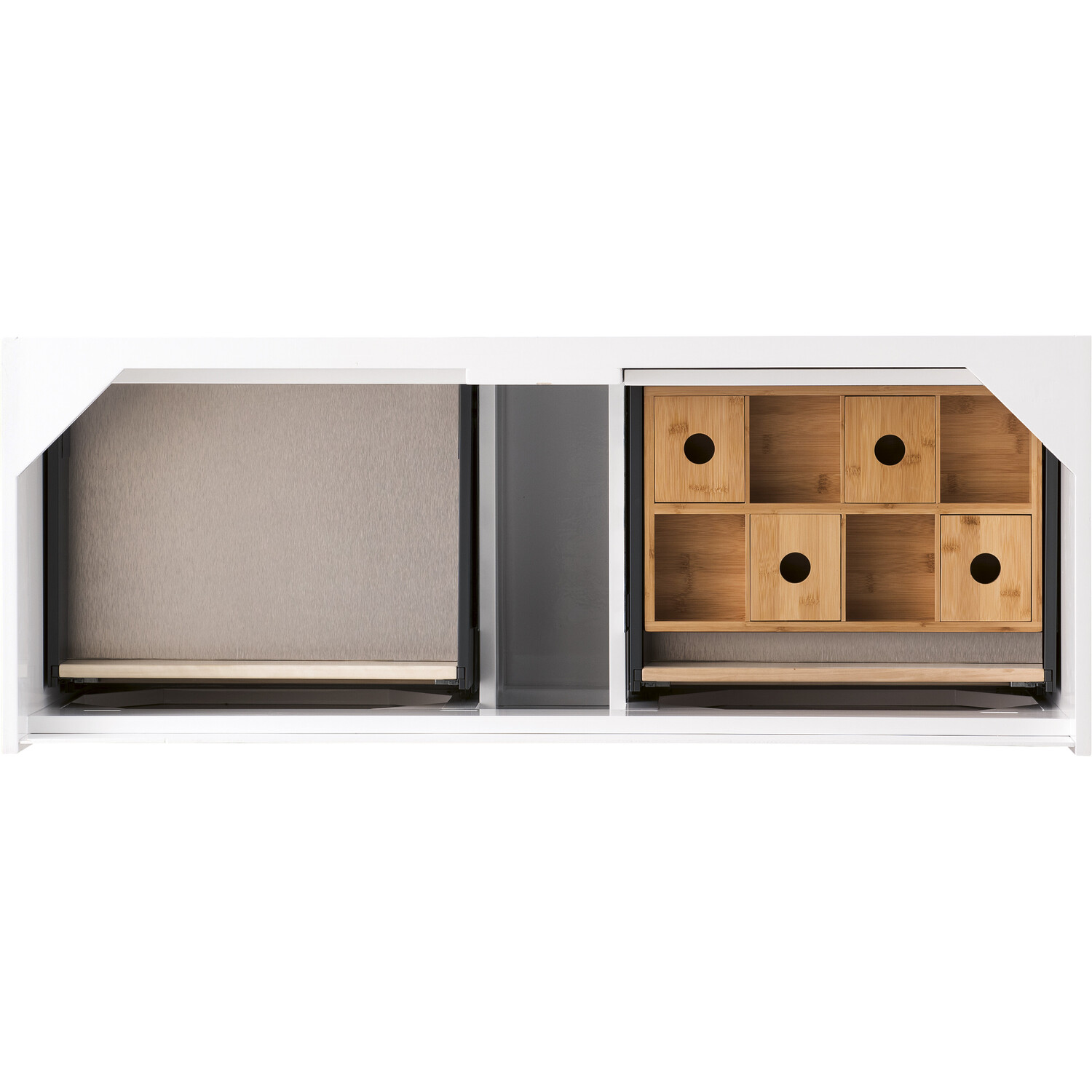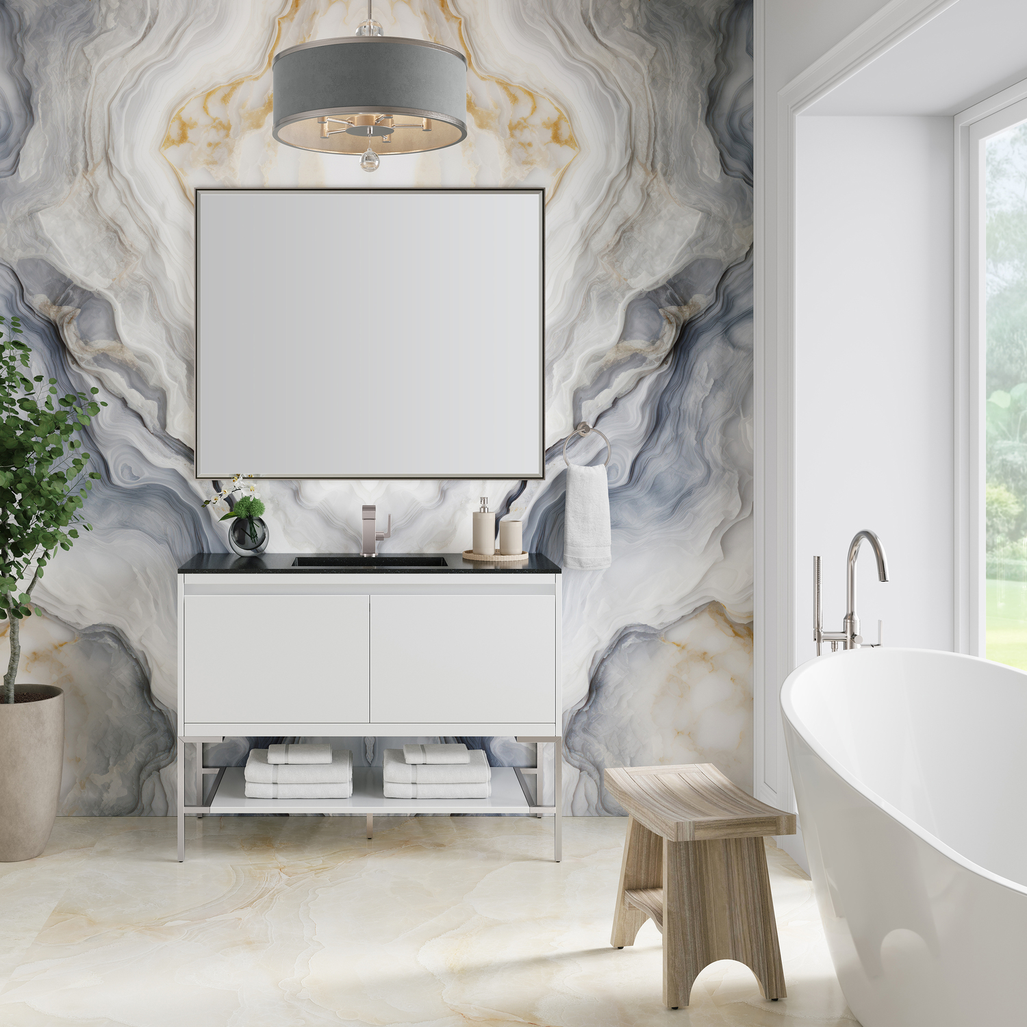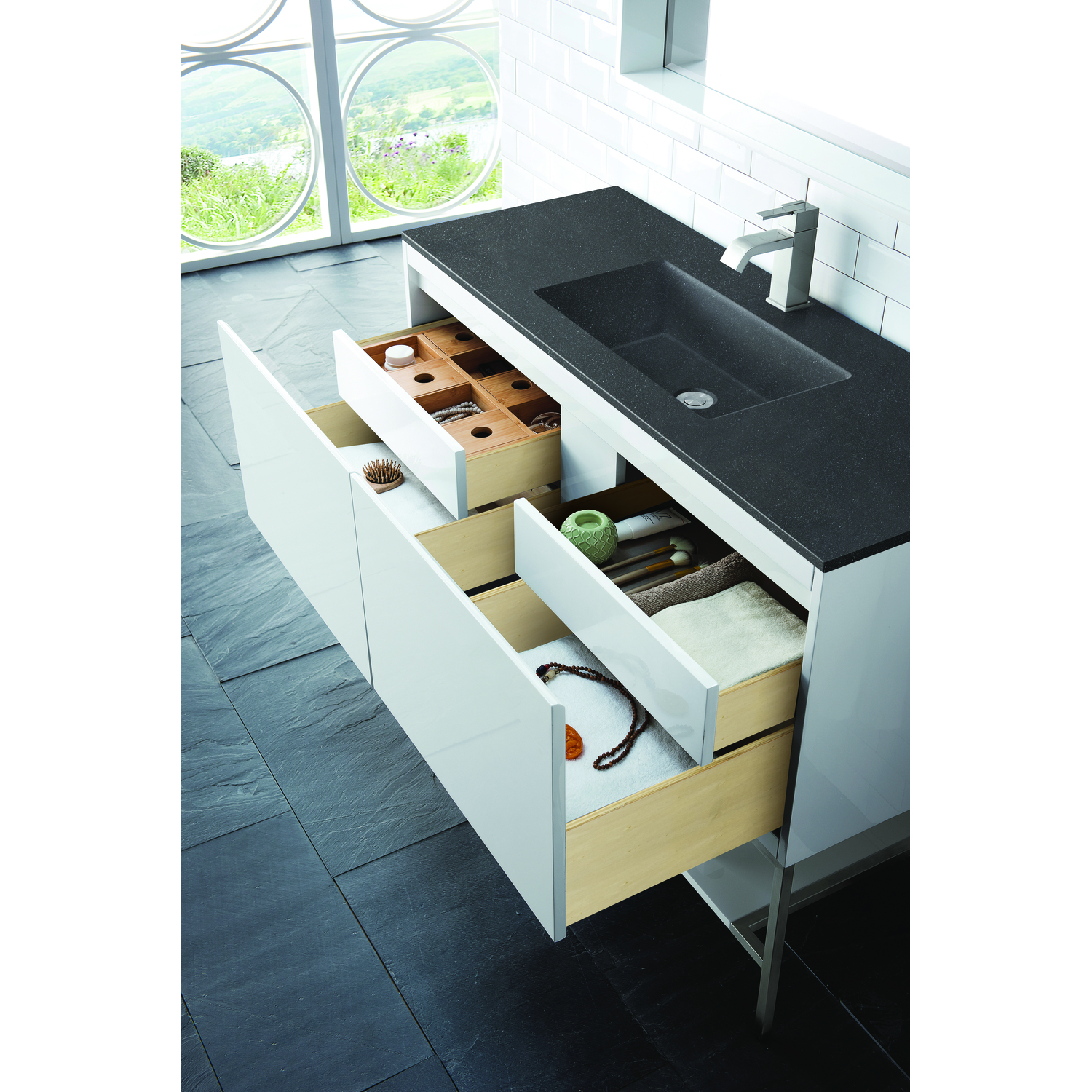 The Mantova 47.3” Glossy White Single Vanity by James Martin Vanities will elevate your space by adding a touch of timeless décor to your bathroom. This vanity combines a cutting-edge design with pristine craftmanship to bring your bathroom a clean modern look providing you with both style and functionality. Generous storage features include soft-close drawers with one removable drawer organizer. The look is completed with Brushed Nickel finished Stainless Steel Base and a Charcoal Black Composite Stone integrated top and sink.Glossy White single vanity with four interior drawers and lower open shelvingHardware/Stand Finish: Brushed NickelSolid kiln-dried Grade A hardwoodCabinet is finished inside and out with a premium undercoat finish for superior moisture and UV resistanceSoft-close undermount drawer glidesDrawer bottoms are lined with our signature brushed aluminum laminateCharcoal Black Composite Stone integrated top and sink includedCountertop is pre-drilled for one single hole faucetFaucet sold separatelyIdeal for the modern home, the Mantova Collection by James Martin Vanities offers a clean, contemporary look. Superbly crafted out of durable wood, it is immediately recognizable by its inherent beauty and durability. A true masterpiece of elegance and style, that is available in either a freestanding or wall-mounted edition. Each drawer is soft closing with ample storage room, that does not impede the design aesthetic of the overall piece. Each vanity comes with your choice of composite sink color either a Glossy White or a Charcoal Black Matte, as well as two options in cabinet finishes, Mid-Century Walnut or Glossy White. To complete the look, choose between three options for the metal base; Brushed Nickel, Champagne Brass, or Matte Black. The Mantova collection is available in multiple sizes and will work with a wide variety of different styles and decors.1 year warranty against manufacturer's defects. We will repair or replace any defective product, if the product is defective in material or workmanship at our discretion. No warranty is expressed or implied regarding damages resulting from consumer misuse.