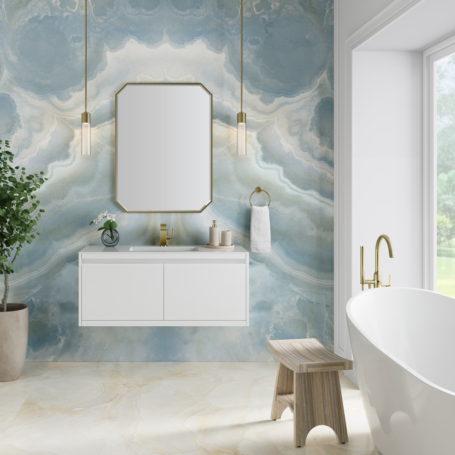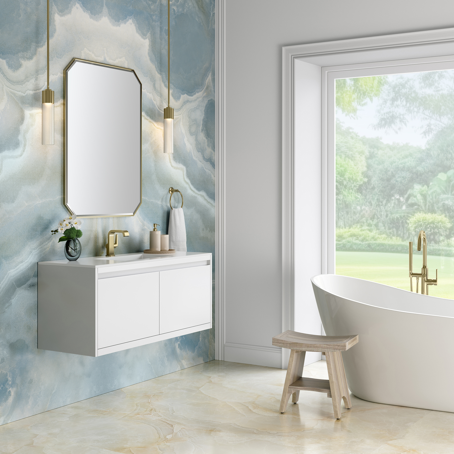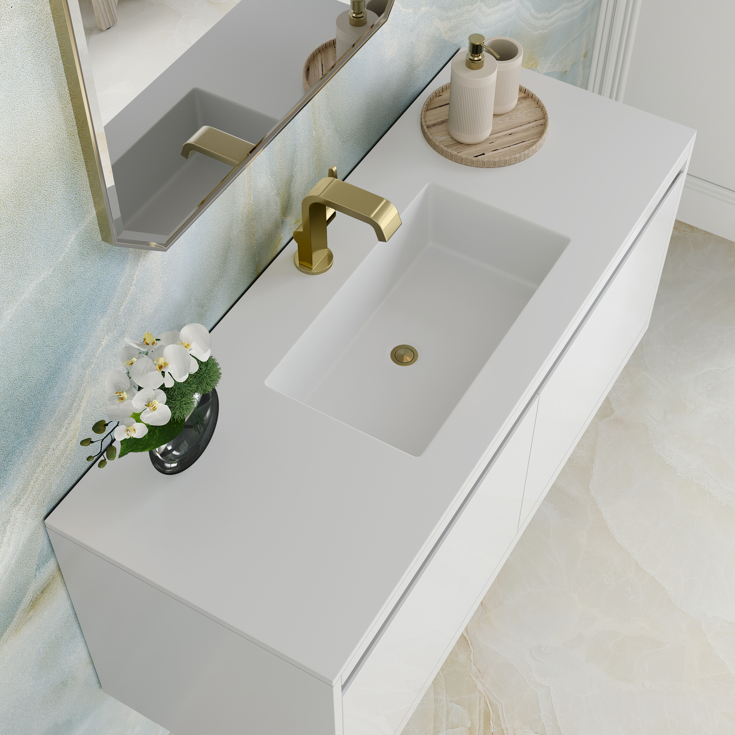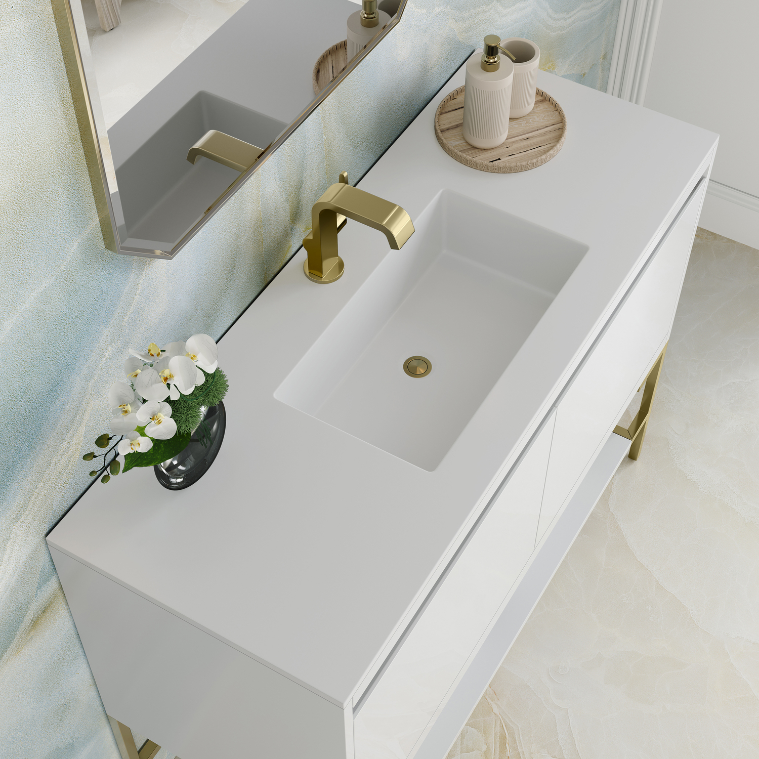 The Mantova 47.3” Glossy White Single Vanity by James Martin Vanities will elevate your space by adding a touch of timeless décor to your bathroom. This vanity combines a cutting-edge design with pristine craftmanship to bring your bathroom a clean modern look providing you with both style and functionality. Generous storage features include soft-close drawers with one removable drawer organizer. The look is completed with Champagne Brass finished Stainless Steel Base and a Glossy White Composite Stone integrated top and sink.Glossy White single vanity with four interior drawers and lower open shelvingHardware/Stand Finish: Champagne BrassSolid kiln-dried Grade A hardwoodCabinet is finished inside and out with a premium undercoat finish for superior moisture and UV resistanceSoft-close undermount drawer glidesDrawer bottoms are lined with our signature brushed aluminum laminateGlossy White Composite Stone integrated top and sink includedCountertop is pre-drilled for one single hole faucetFaucet sold separatelyIdeal for the modern home, the Mantova Collection by James Martin Vanities offers a clean, contemporary look. Superbly crafted out of durable wood, it is immediately recognizable by its inherent beauty and durability. A true masterpiece of elegance and style, that is available in either a freestanding or wall-mounted edition. Each drawer is soft closing with ample storage room, that does not impede the design aesthetic of the overall piece. Each vanity comes with your choice of composite sink color either a Glossy White or a Charcoal Black Matte, as well as two options in cabinet finishes, Mid-Century Walnut or Glossy White. To complete the look, choose between three options for the metal base; Brushed Nickel, Champagne Brass, or Matte Black. The Mantova collection is available in multiple sizes and will work with a wide variety of different styles and decors.1 year warranty against manufacturer's defects. We will repair or replace any defective product, if the product is defective in material or workmanship at our discretion. No warranty is expressed or implied regarding damages resulting from consumer misuse.