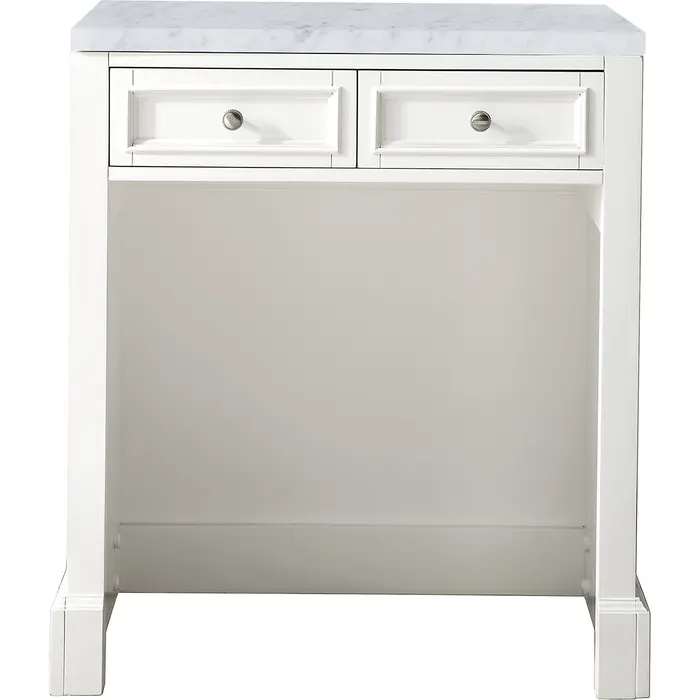 Elevate your master bathroom with the addition of the De Soto 30" Bright White Makeup Vanity with a Carrara White marble top by James Martin Vanities. This refined and elegant vanity has a transitional flair, while the Carrara Marble top is both luxurious and highly durable to handle daily usage. Provides ample storage for toiletries and other necessities, so you can reduce clutter on the sleek top. This delightful vanity is made with the finest materials and is sure to last. Able to coordinate with almost any aesthetic, this transitional styled vanity includes a soft-close drawer with English dovetail joinery and undermount glides, accentuated with Satin Nickel hardware.Two drawer Bright White countertop unit (makeup counter)Hardware Finish: Satin NickelSolid kiln-dried Grade A hardwoodCabinet is finished inside and out with a premium undercoat finish for superior moisture and UV resistanceSoft-close undermount drawer glidesOne faux shagreen drawer organizer3 CM eased edge Carrara Marble top includedThe De Soto Collection by James Martin Vanities was designed to fulfill a wide range of tasks. Storage and convenience are foremost in this collection. De Soto provides ample storage in each of its configurations. Cabinets are crafted from North American birch hardwoods and veneers. Interior space is generous, even in the smallest size. Low maintenance is provided with the full plinth base located behind the rounded bracket feet. Premium features include an electrical and USB outlet and beautiful faux-shagreen drawer organizers. Also available are optional 26” modular “make-up” counters, so you can connect vanities and create a grand bathroom1 year warranty against manufacturer's defects. We will repair or replace any defective product, if the product is defective in material or workmanship at our discretion. No warranty is expressed or implied regarding damages resulting from consumer misuse.