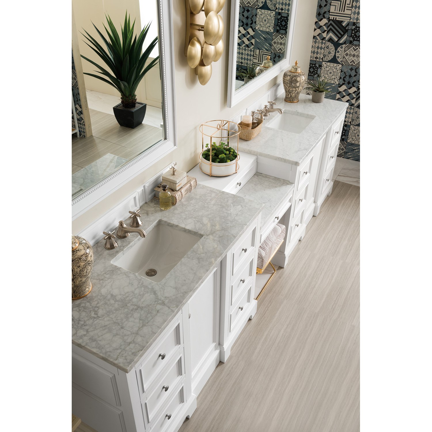 The De Soto 118" Bright White Double Vanity Set by James Martin Vanities features two 48" cabinets connected by a matching 22" make-up counter. The cabinet includes one faux shagreen drawer organizer, an electrical outlet with two USB ports, and interior shelf space. This cabinet also includes a decorative wood backsplash. The look is completed with a 3 CM eased edge Carrara Marble top and two white ceramic rectangular sinks.Two 48" Bright White single vanities, each with one door, six drawers and interior shelf space; one 22" Burnished Mahogany drawer unitHardware Finish: Satin NickelSolid kiln-dried Grade A hardwoodCabinet is finished inside and out with a premium undercoat finish for superior moisture and UV resistanceSoft-close undermount drawer glides and soft-close door hingesDrawer bottoms are lined with our signature brushed aluminum laminateOne 120 Volt UL rated electrical component with two electrical and two USB (2.0) outletsOne faux shagreen drawer organizerMatching decorative wood backsplash is includedCountertops are pre-drilled for one 3-hole 8" spreadsTwo 3 CM eased edge Carrara Marble tops, each with one white porcelain rectangular sinkFaucets sold separatelyMaximum Versatility De Soto was designed to fulfill a wide range of tasks. Storage and convenience are foremost in this collection. De Soto provides ample storage in each of the six available widths and configurations. Cabinets are crafted from North American Birch hardwoods and veneers. Interior space is generous, even in the smallest size. Low maintenance is provided with the full plinth base located behind the rounded bracket feet. Premium features include an electrical and USB outlet and beautiful faux-shagreen drawer organizers. Also available are optional 26” modular “make-up” counters, so you can connect vanities and create a grand bathroom. Offered in three finish colors: Bright White, Burnished Mahogany and Silver Gray.1 year warranty against manufacturer's defects. We will repair or replace any defective product, if the product is defective in material or workmanship at our discretion. No warranty is expressed or implied regarding damages resulting from consumer misuse.