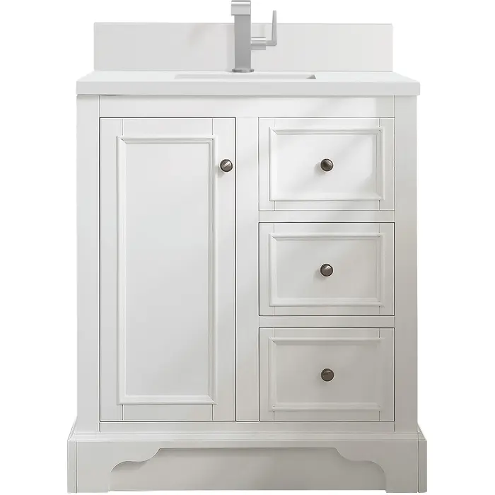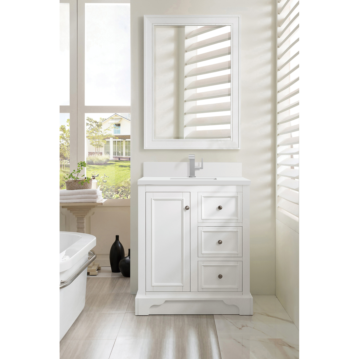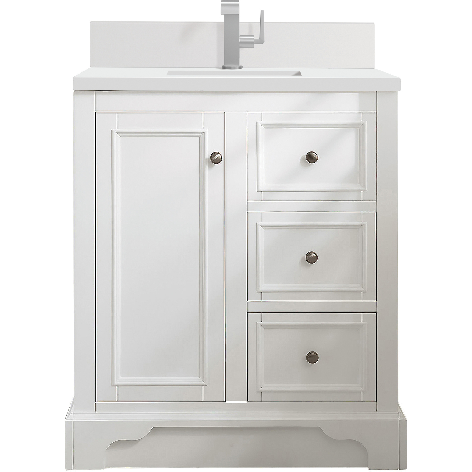James Martin De Soto 30 inch Single Vanity, Bright White w/ Single Hole 3 CM White Zeus Quartz Top & Backsplash, 840108975721, 825-V30-BW-1WZ