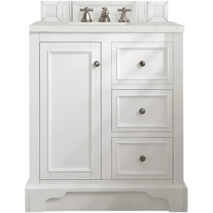 The De Soto 30" Bright White Single Vanity was designed to fulfill a wide range of tasks. Storage and convenience are foremost in this collection. The De Soto series provides ample storage in each of the six available widths and configurations. Cabinets are crafted from North American yellow Poplar hardwoods and veneers. Low maintenance is provided with the full plinth base located behind the rounded bracket feet. Premium features in this series include beautiful faux-shagreen drawer organizers. Optional wood backsplash included. Adding an elegant contrast to the Bright White finish, the Lime Delight Silestone top lends warm, textured beige tones to perfectly complement the design of the vanity.Vanity set includes a 3cm eased edge Limestone Delight Silestone top. Includes a white porcelain rectangular undermount sink that ships separately and mounting brackets for easy installation. Top is pre-drilled for 8" widespread faucet. Faucet not includeOne-door Bright White cabinet with one faux and two drawers.Crafted from Poplar solids and plywood and is sealed inside and outside with our premium moisture and UV resistant coatingDrawer boxes are constructed using English Dovetail joinery, feature soft-close undermount glides and a Brushed Aluminum laminate drawer bottom.Satin Nickel HardwareIncludes one faux shagreen drawer organizerMatching decorative wood backsplash is includedFaucet sold separatelyCountertop is pre-drilled for one 3-hole 8" spreadMaximum versatility. The De Soto was designed to fulfill a wide range of tasks. Storage and convenience are foremost in this collection. De Soto provides ample storage in each of the six available widths and configurations. Cabinets are crafted from North American Birch hardwoods and veneers. Interior space is generous, even in the smallest size. Low maintenance is provided with the full plinth base located behind the rounded bracket feet. Premium features include an electrical and USB outlet and beautiful faux-shagreen drawer organizers. Also available are optional 26” modular make-up counters, so you can connect vanities and create a grand bathroom.1 year warranty against manufacturer's defects. We will repair or replace any defective product, if the product is defective in material or workmanship at our discretion. No warranty is expressed or implied regarding damages resulting from consumer misuse.