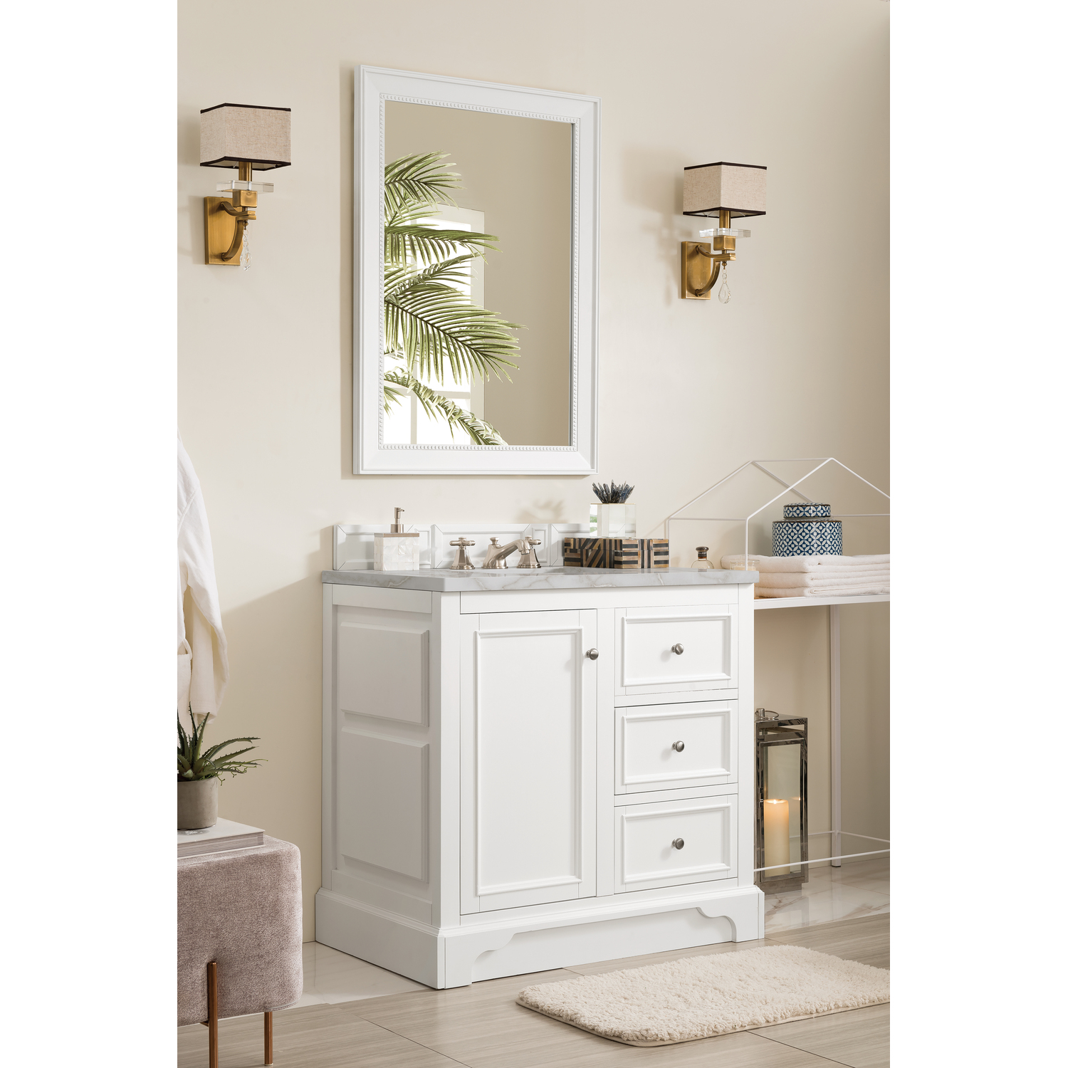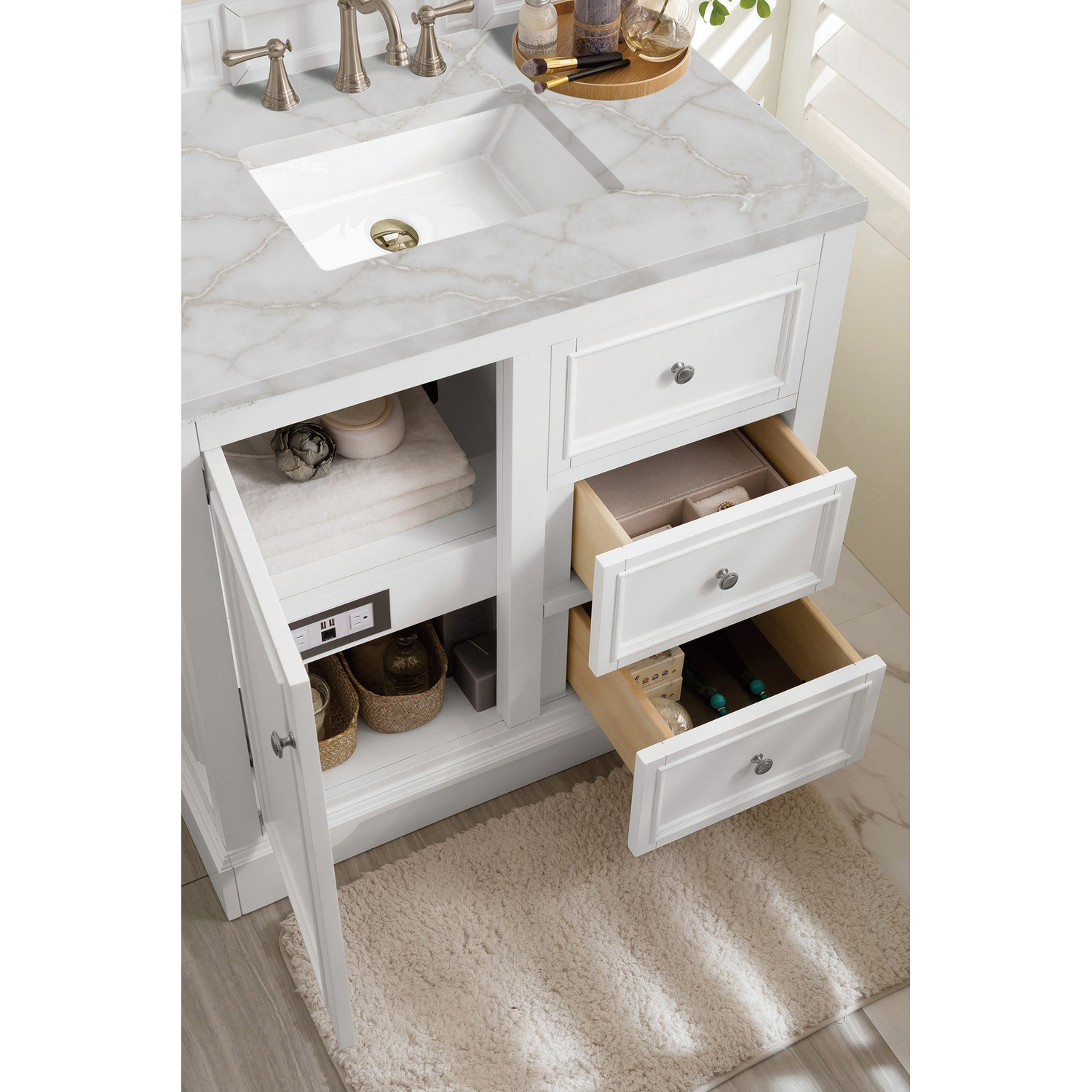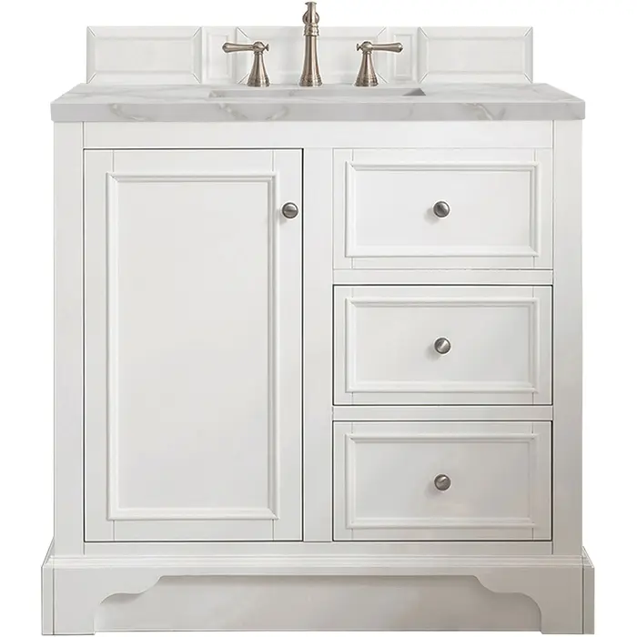 The De Soto 36" Bright White Single Vanity was designed to fulfill a wide range of tasks. Storage and convenience are foremost in this collection. The De Soto series provides ample storage in each of the six available widths and configurations. Cabinets are crafted from North American yellow Poplar hardwoods and veneers. Low maintenance is provided with the full plinth base located behind the rounded bracket feet. Premium features in this series include an electrical and USB outlet and beautiful faux-shagreen drawer organizers. Optional wood backsplash included. The Bright White finish is accented by the neutral background of the Victorian Silver Silestone top, boasting champagne metallic accents which seamlessly complete the look.Vanity set includes a 3cm eased edge Victorian Silver Silestone top, a white porcelain rectangular sink and mounting brackets for easy installation. Top is pre-drilled for an 8" widespread faucet. Faucet not included.One-door Bright White cabinet with one faux and two drawers.Crafted from Poplar solids and plywood and is sealed inside and outside with our premium moisture and UV resistant coatingDrawer boxes are constructed using English Dovetail joinery, feature soft-close undermount glides and a Brushed Aluminum laminate drawer bottom.Satin Nickel HardwareIncludes one faux shagreen drawer organizerMatching decorative wood backsplash is includedIncludes a 120 UL-rated electrical component with dual power outlets and USB (Type A) portsFaucet sold separatelyCountertop is pre-drilled for one 3-hole 8" spreadMaximum versatility. The De Soto was designed to fulfill a wide range of tasks. Storage and convenience are foremost in this collection. De Soto provides ample storage in each of the six available widths and configurations. Cabinets are crafted from North American Birch hardwoods and veneers. Interior space is generous, even in the smallest size. Low maintenance is provided with the full plinth base located behind the rounded bracket feet. Premium features include an electrical and USB outlet and beautiful faux-shagreen drawer organizers. Also available are optional 26” modular make-up counters, so you can connect vanities and create a grand bathroom.1 year warranty against manufacturer's defects. We will repair or replace any defective product, if the product is defective in material or workmanship at our discretion. No warranty is expressed or implied regarding damages resulting from consumer misuse.
