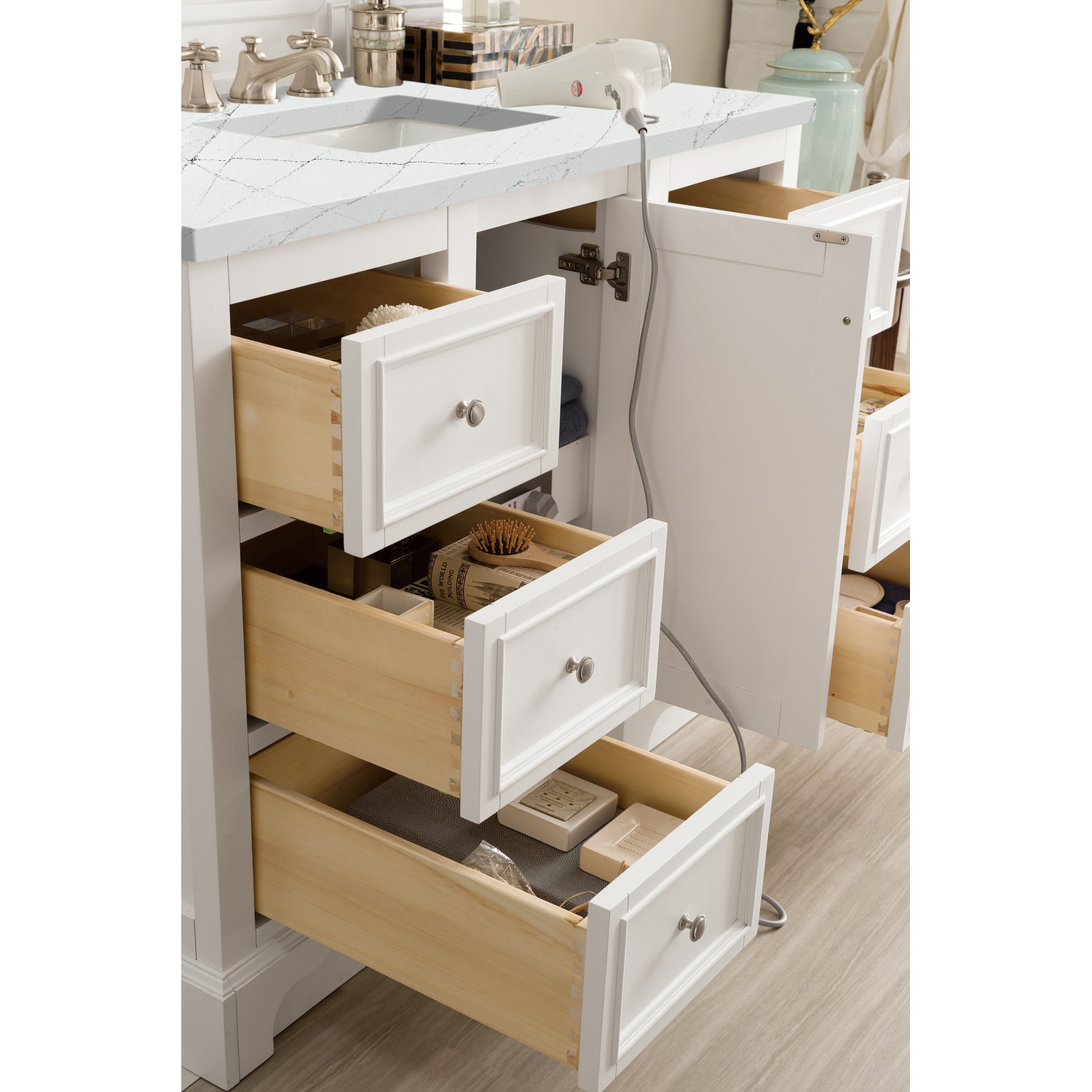 • Maximum versatility. The De Soto was designed to fulfill a wide range of tasks. Storage and convenience are foremost in this collection. De Soto provides ample storage in each of the six available widths and configurations. Cabinets are crafted from North American Birch hardwoods and veneers. Interior space is generous, even in the smallest size. Low maintenance is provided with the full plinth base located behind the rounded bracket feet. Premium features include an electrical and USB outlet and beautiful faux-shagreen drawer organizers. Also available are optional 26” modular make-up counters, so you can connect vanities and create a grand bathroom.