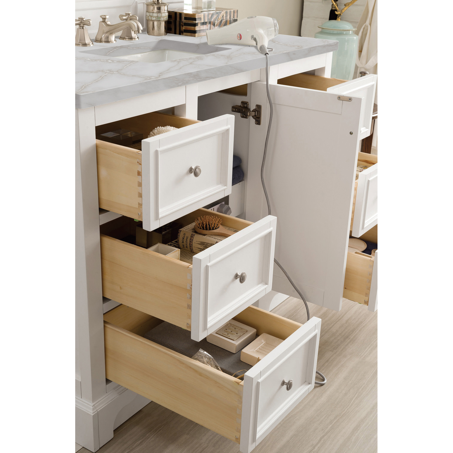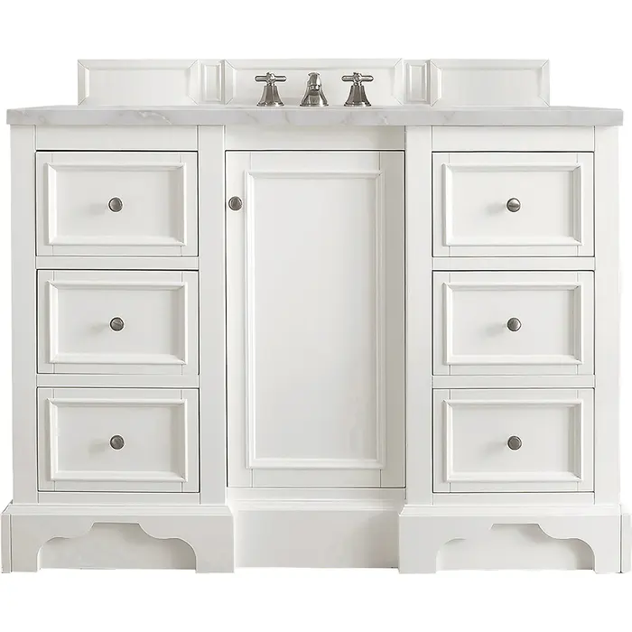 The De Soto 48" Bright White Single Vanity was designed to fulfill a wide range of tasks. Storage and convenience are foremost in this collection. The De Soto series provides ample storage in each of the six available widths and configurations. Cabinets are crafted from North American yellow Poplar hardwoods and veneers. Low maintenance is provided with the full plinth base located behind the rounded bracket feet. Premium features in this series include an electrical and USB outlet and beautiful faux-shagreen drawer organizers. The Bright White finish is accented by the neutral background of the Victorian Silver Silestone top, boasting champagne metallic accents which seamlessly complete the look.Vanity set includes a 3cm eased edge Victorian Silver Silestone top, a white porcelain rectangular sink and mounting brackets for easy installation. Top is pre-drilled for an 8" widespread faucet. Faucet not included.One-door Bright White cabinet with six drawers.Crafted from Poplar solids and plywood and is sealed inside and outside with our premium moisture and UV resistant coatingDrawer boxes are constructed using English Dovetail joinery, feature soft-close undermount glides and a Brushed Aluminum laminate drawer bottom.Satin Nickel HardwareIncludes one faux shagreen drawer organizerMatching decorative wood backsplash is includedIncludes a 120 UL-rated electrical component with dual power outlets and USB (Type A) portsFaucet sold separatelyCountertop is pre-drilled for one 3-hole 8" spreadMaximum versatility. The De Soto was designed to fulfill a wide range of tasks. Storage and convenience are foremost in this collection. De Soto provides ample storage in each of the six available widths and configurations. Cabinets are crafted from North American Birch hardwoods and veneers. Interior space is generous, even in the smallest size. Low maintenance is provided with the full plinth base located behind the rounded bracket feet. Premium features include an electrical and USB outlet and beautiful faux-shagreen drawer organizers. Also available are optional 26” modular make-up counters, so you can connect vanities and create a grand bathroom.1 year warranty against manufacturer's defects. We will repair or replace any defective product, if the product is defective in material or workmanship at our discretion. No warranty is expressed or implied regarding damages resulting from consumer misuse.