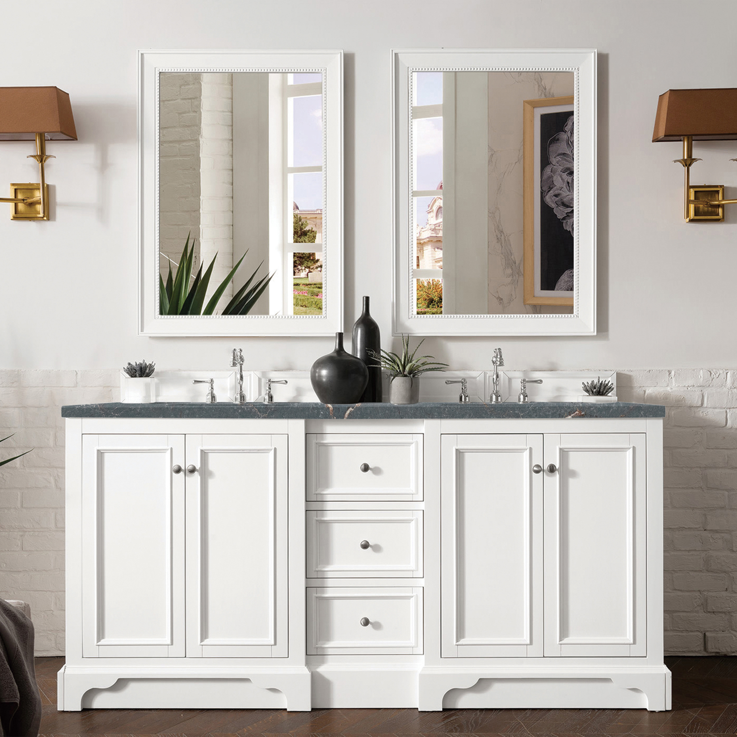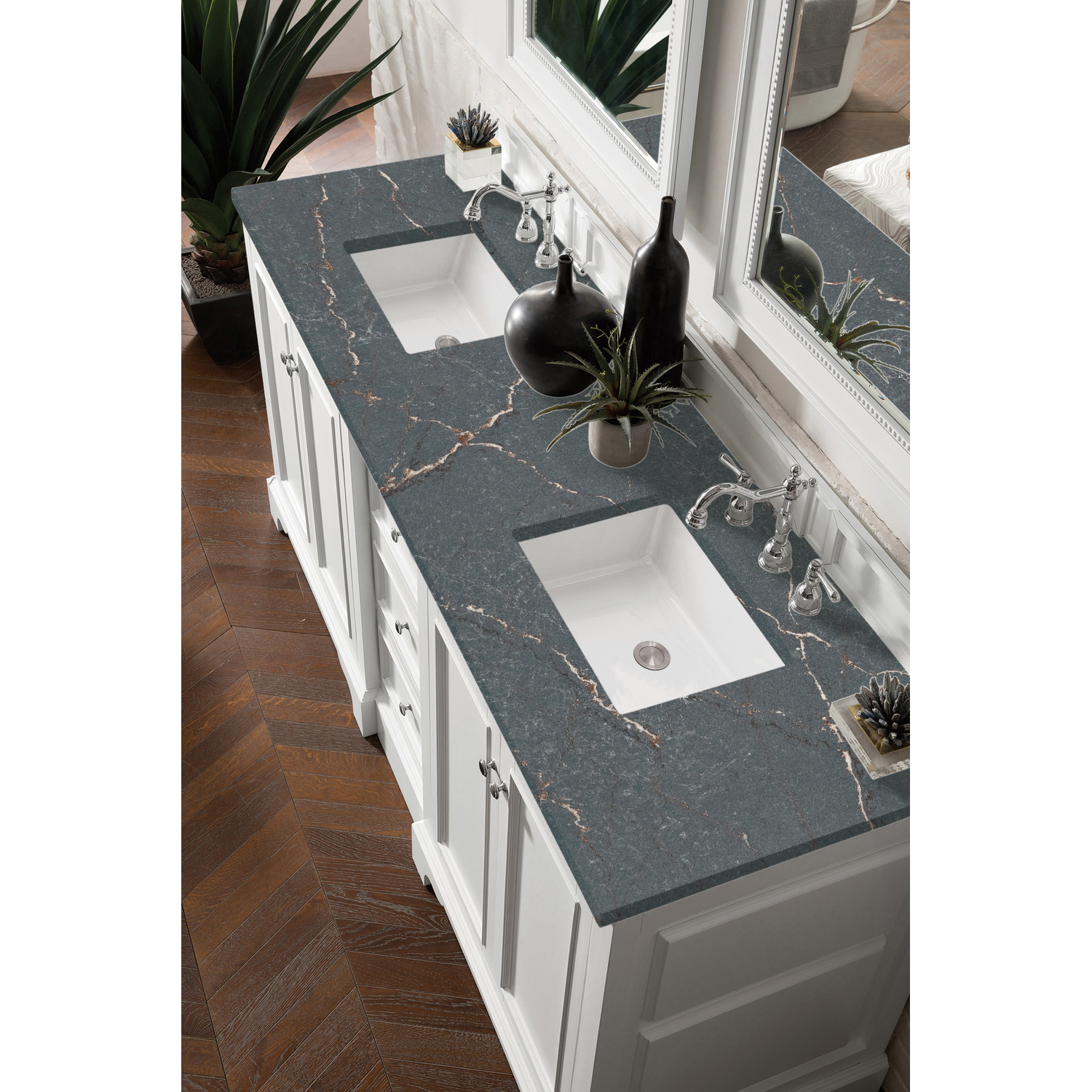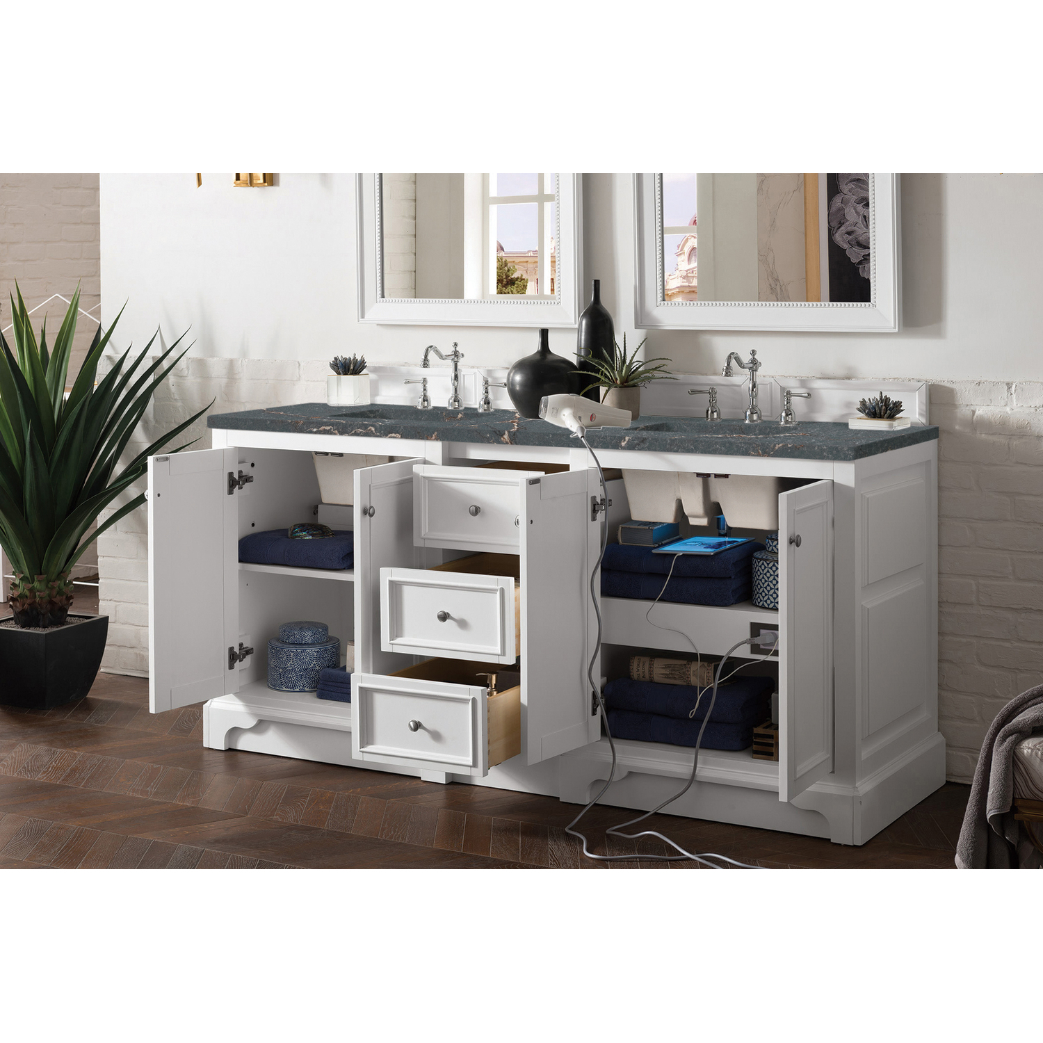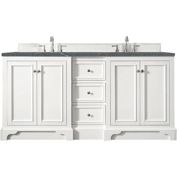 The De Soto 72" Bright White Double Vanity was designed to fulfill a wide range of tasks. Storage and convenience are foremost in this collection. The De Soto series provides ample storage in each of the six available widths and configurations. Cabinets are crafted from North American yellow Poplar hardwoods and veneers. Low maintenance is provided with the full plinth base located behind the rounded bracket feet. Premium features in this series include an electrical and USB outlet and beautiful faux-shagreen drawer organizers. Optional wood backsplash included. Adding an elegant contrast to the Bright White finish is the Parisien Bleu Silestone top, offering a deep bluish hue with broad and intricate neutral veins highlighted by fine coppery accents which perfectly complete this beautiful vanity.Vanity set includes a 3cm eased edge Parisien Bleu Silestone top, which includes two white porcelain rectangular undermount sinks that ship separately, as well as mounting brackets for easy installation. The top is pre-drilled for two 8" widespread faucetFour-door Bright White cabinet with three drawers.Crafted from Poplar solids and plywood and is sealed inside and outside with our premium moisture and UV resistant coatingDrawer boxes are constructed using English Dovetail joinery, feature soft-close undermount glides and a Brushed Aluminum laminate drawer bottom.Satin Nickel HardwareIncludes one faux shagreen drawer organizerMatching decorative wood backsplash is includedIncludes a 120 UL-rated electrical component with dual power outlets and USB (Type A) portsFaucets sold separatelyCountertop is pre-drilled for two 3-hole 8" spreadsMaximum versatility. The De Soto was designed to fulfill a wide range of tasks. Storage and convenience are foremost in this collection. De Soto provides ample storage in each of the six available widths and configurations. Cabinets are crafted from North American Birch hardwoods and veneers. Interior space is generous, even in the smallest size. Low maintenance is provided with the full plinth base located behind the rounded bracket feet. Premium features include an electrical and USB outlet and beautiful faux-shagreen drawer organizers. Also available are optional 26” modular make-up counters, so you can connect vanities and create a grand bathroom.1 year warranty against manufacturer's defects. We will repair or replace any defective product, if the product is defective in material or workmanship at our discretion. No warranty is expressed or implied regarding damages resulting from consumer misuse.