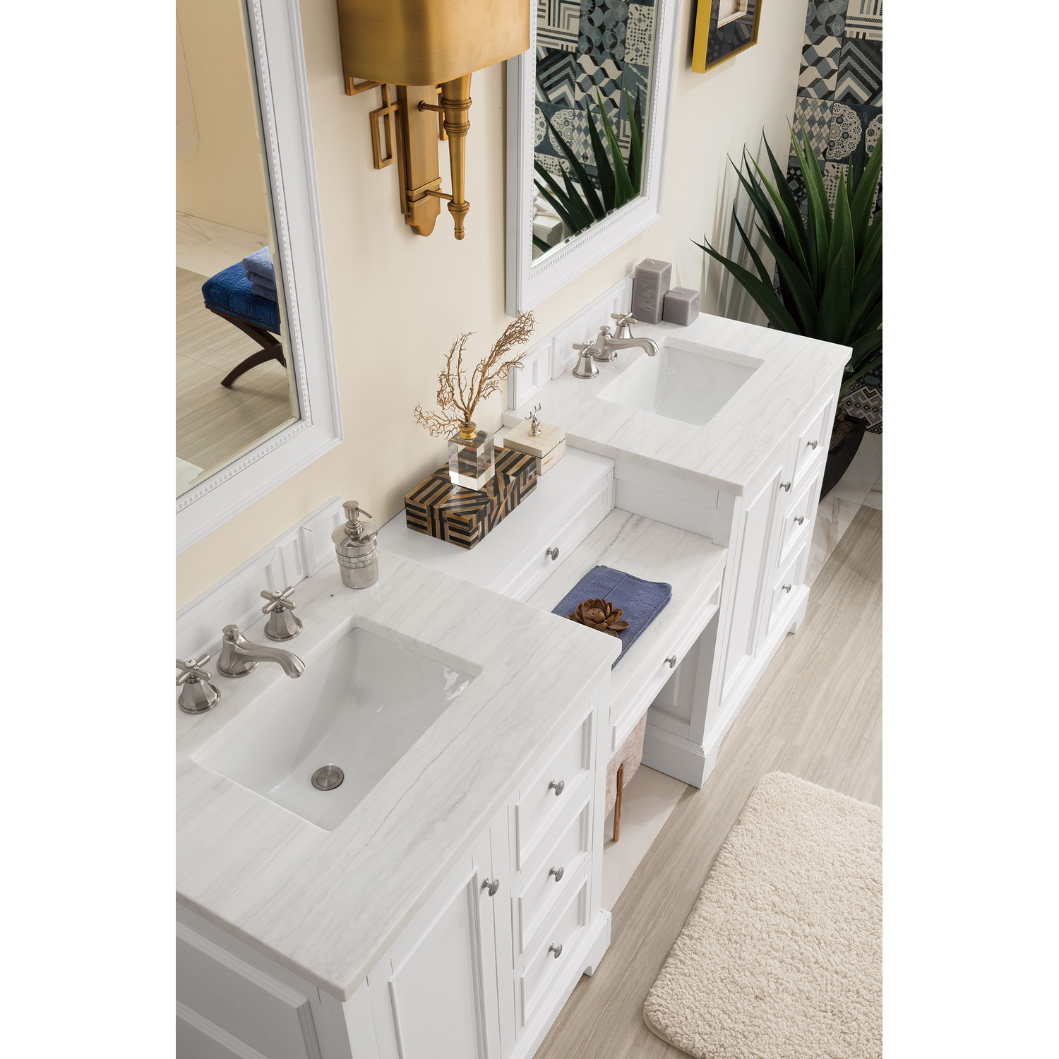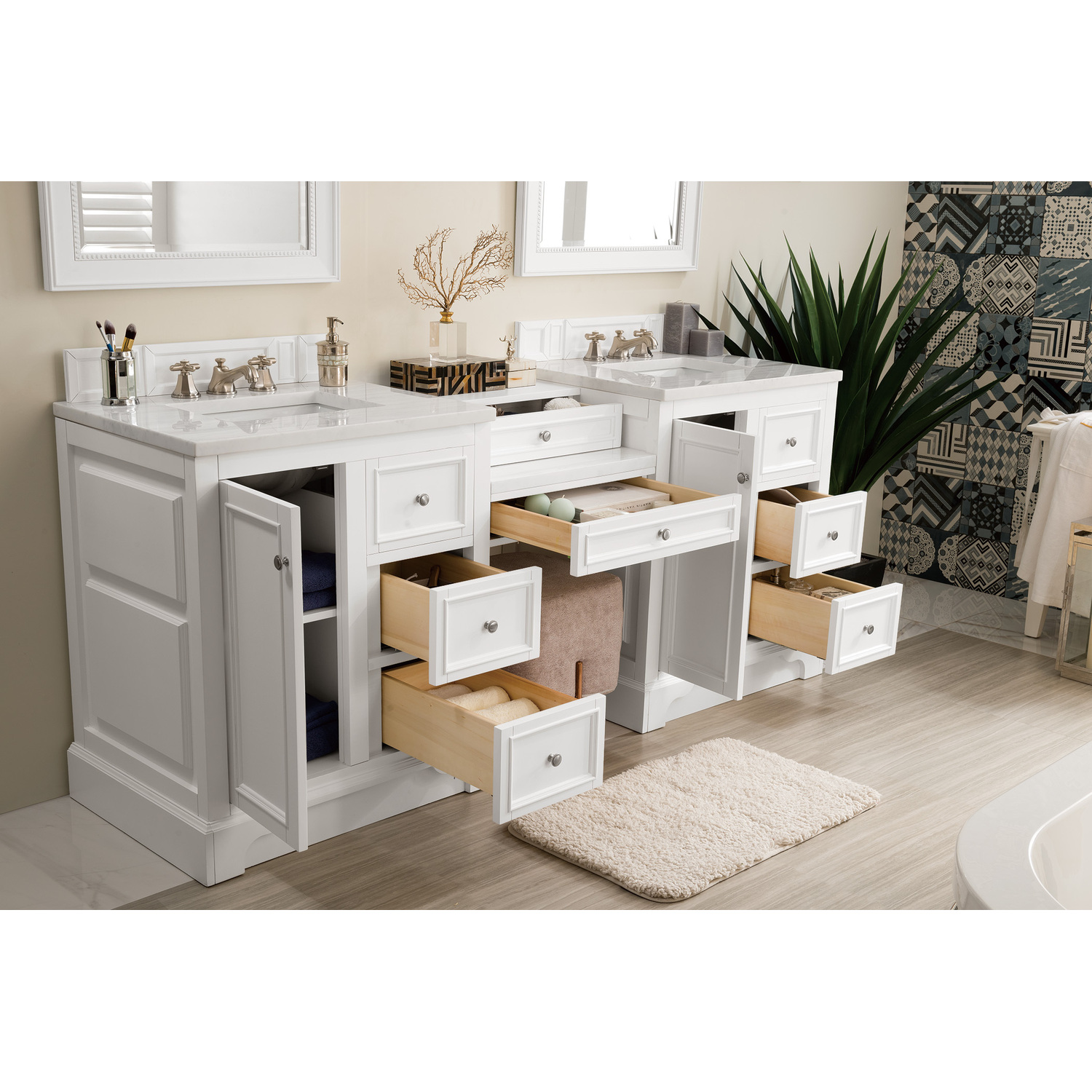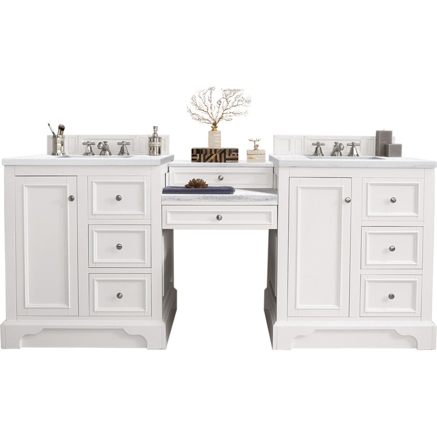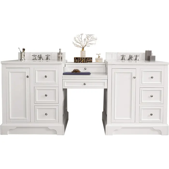 The De Soto 82" Bright White Double Vanity Set by James Martin Vanities features two 30" cabinets connected by a matching 22" make-up counter. The cabinet includes one faux shagreen drawer organizer and interior shelf space. This cabinet also includes a decorative wood backsplash. The look is completed with a 3 CM eased edge Arctic Fall Solid Surface top and two white ceramic rectangular sinks.Two 30" Bright White single vanities, each with one door, two drawers and interior shelf space; top drawer is false; one 22" Bright White drawer unitHardware Finish: Satin NickelSolid kiln-dried Grade A hardwoodCabinet is finished inside and out with a premium undercoat finish for superior moisture and UV resistanceSoft-close undermount drawer glides and soft-close door hingesDrawer bottoms are lined with our signature brushed aluminum laminateOne faux shagreen drawer organizerMatching decorative wood backsplash is includedTwo 3 CM eased edge Arctic Fall Solid Surface tops, each with one white porcelain rectangular sinkFaucets sold separatelyCountertops are pre-drilled for one 3-hole 8" spreadsMaximum Versatility De Soto was designed to fulfill a wide range of tasks. Storage and convenience are foremost in this collection. De Soto provides ample storage in each of the six available widths and configurations. Cabinets are crafted from North American Birch hardwoods and veneers. Interior space is generous, even in the smallest size. Low maintenance is provided with the full plinth base located behind the rounded bracket feet. Premium features include an electrical and USB outlet and beautiful faux-shagreen drawer organizers. Also available are optional 26” modular “make-up” counters, so you can connect vanities and create a grand bathroom. Offered in three finish colors: Bright White, Burnished Mahogany and Silver Gray.1 year warranty against manufacturer's defects. We will repair or replace any defective product, if the product is defective in material or workmanship at our discretion. No warranty is expressed or implied regarding damages resulting from consumer misuse.