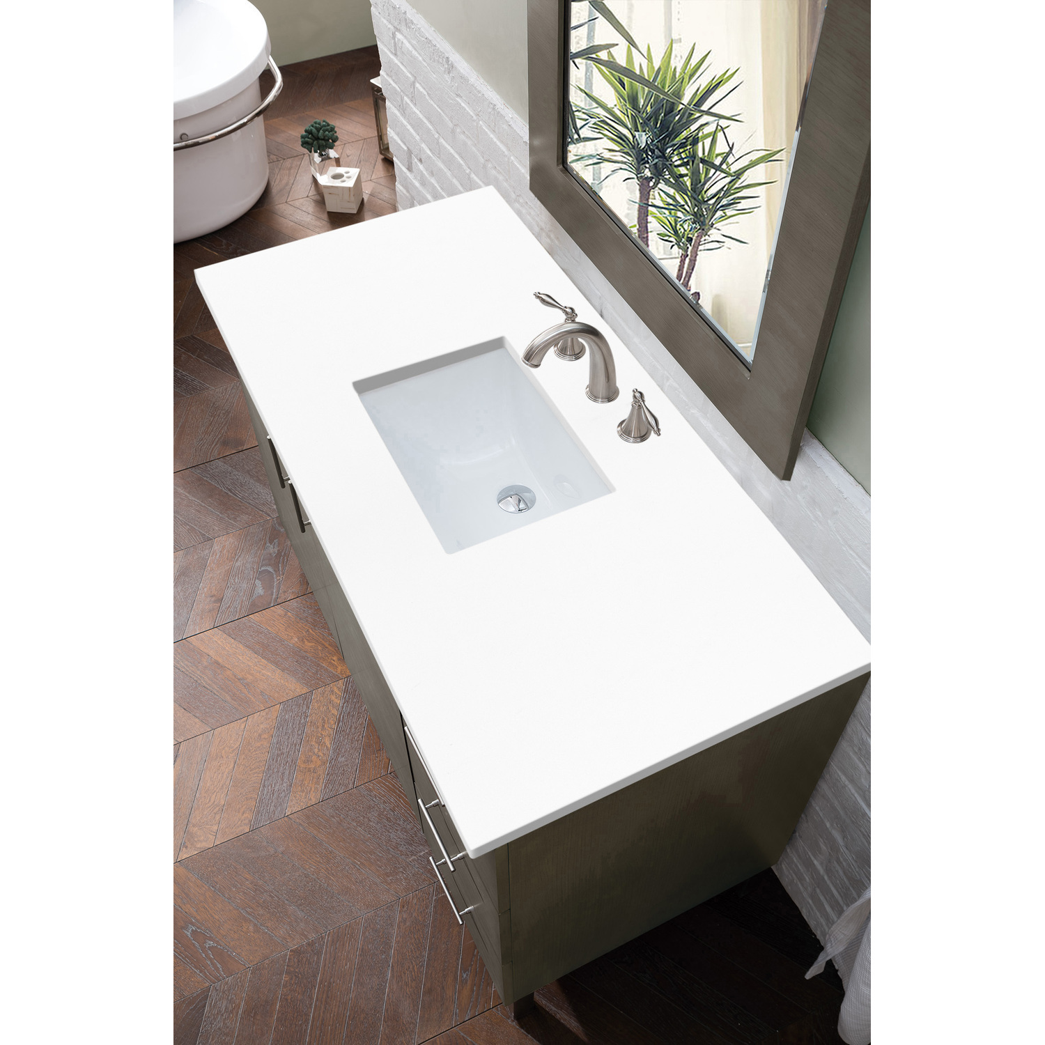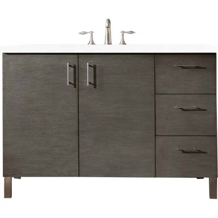 The Metropolitan 48" Silver Oak Single Vanity by James Martin Vanities is a wall-mount optional cabinet with mounting brackets and removable Brushed Nickel legs. This cabinet offers ample storage space and soft-close doors and drawers. The look is completed with a 3 CM eased edge White Zeus Silestone top and one white ceramic rectangular sink.Two door Silver Oak single vanity with three drawers and interior shelf spaceHardware Finish: Brushed NickelSolid kiln-dried Grade A hardwoodCabinet is finished inside and out with a premium undercoat finish for superior moisture and UV resistanceSoft-close undermount drawer glides and soft-close door hingesDrawer bottoms are lined with our signature brushed aluminum laminateCountertop is pre-drilled for one 3-hole 8" spreadCountertop is pre-drilled for a 3-hole 8" spreadFaucet sold separatelyThis cabinet can be wall-hung, legs are removable; mounting hardware includedMinimal Modern style is featured in Metropolitan Series. Very clean lines and ample storage make these vanities a welcome addition to your bathroom. Hand-crafted from North American Birch hardwoods and featuring exotic veneers like American Walnut and Silver Oak, the Metropolitan series compliment todays modern interiors. The sleek drawer and door pulls are finished in a soft brushed satin silver color. This series also features premium soft-close drawer glides and door hinges. The cabinets ship with chrome finished metal legs for standard installation. The Metropolitan cabinets may also be wall mounted, for a “floating” vanity look. Heavy-duty brackets for wall mounting are included with the cabinet.1 year warranty against manufacturer's defects. We will repair or replace any defective product, if the product is defective in material or workmanship at our discretion. No warranty is expressed or implied regarding damages resulting from consumer misuse.