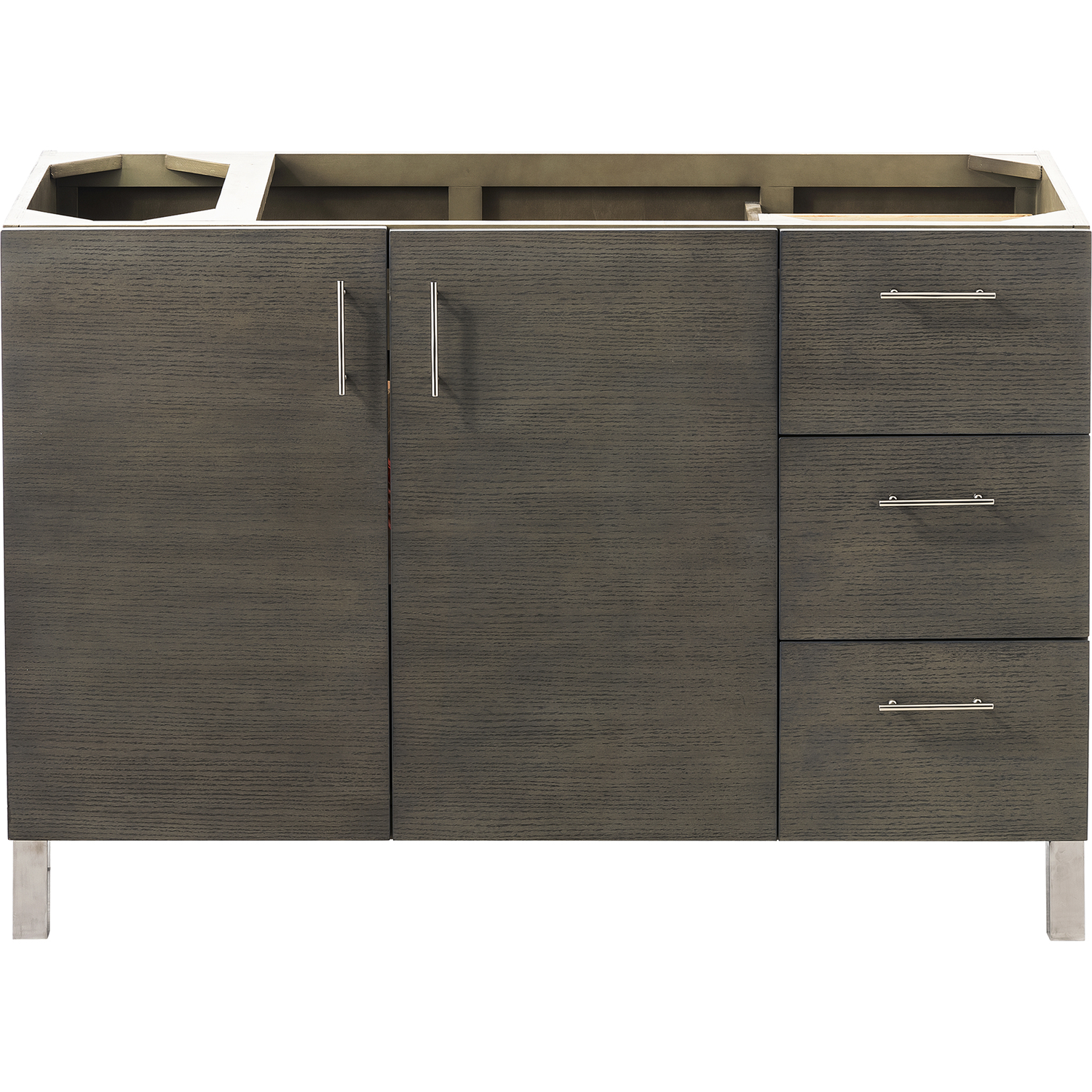 The Metropolitan 48" Silver Oak Single Vanity Cabinet by James Martin Vanities is a wall-mount optional cabinet with mounting brackets and removable Brushed Nickel legs. This cabinet offers ample storage space and soft-close doors and drawers.Two door Silver Oak single vanity cabinet with three drawers and interior shelf spaceHardware Finish: Brushed NickelSolid kiln-dried Grade A hardwoodCabinet is finished inside and out with a premium undercoat finish for superior moisture and UV resistanceSoft-close undermount drawer glides and soft-close door hingesDrawer bottoms are lined with our signature brushed aluminum laminateCabinet only, countertop and sink not includedThis cabinet can be wall-hung, legs are removable; mounting hardware includedMinimal Modern style is featured in Metropolitan Series. Very clean lines and ample storage make these vanities a welcome addition to your bathroom. Hand-crafted from North American Birch hardwoods and featuring exotic veneers like American Walnut and Silver Oak, the Metropolitan series compliment todays modern interiors. The sleek drawer and door pulls are finished in a soft brushed satin silver color. This series also features premium soft-close drawer glides and door hinges. The cabinets ship with chrome finished metal legs for standard installation. The Metropolitan cabinets may also be wall mounted, for a “floating” vanity look. Heavy-duty brackets for wall mounting are included with the cabinet.1 year warranty against manufacturer's defects. We will repair or replace any defective product, if the product is defective in material or workmanship at our discretion. No warranty is expressed or implied regarding damages resulting from consumer misuse.