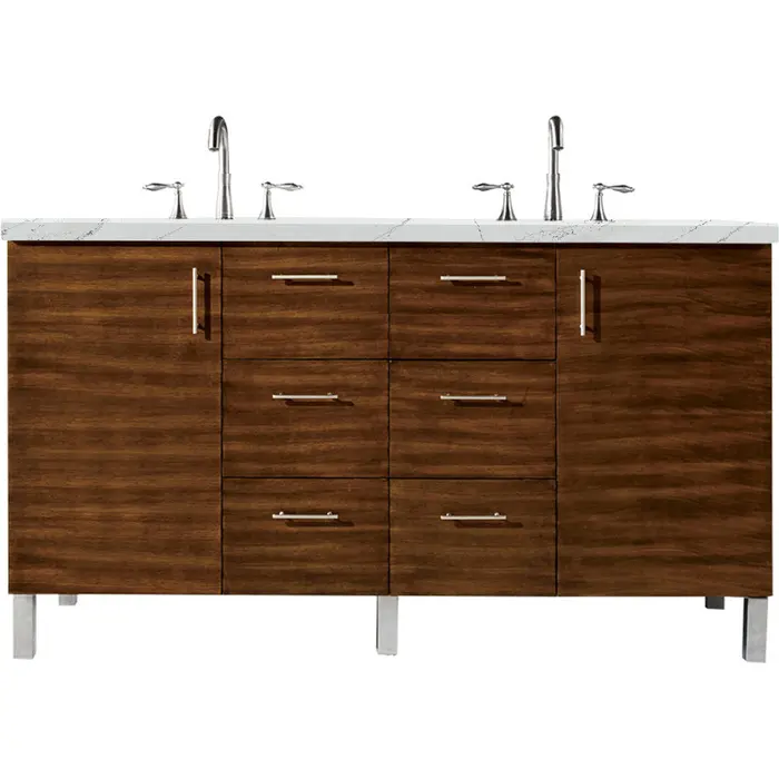 The Metropolitan 60" American Walnut Double Vanity by James Martin Vanities is a wall-mount optional cabinet with mounting brackets and removable Brushed Nickel legs. This cabinet offers ample storage space and soft-close doors and drawers. The look is completed with a 3 CM eased edge Ethereal Noctis Silestone top and one white ceramic rectangular sink.Two door American Walnut single vanity with six drawers and interior shelf spaceHardware Finish: Brushed NickelSolid kiln-dried Grade A hardwoodCabinet is finished inside and out with a premium undercoat finish for superior moisture and UV resistanceSoft-close undermount drawer glides and soft-close door hingesDrawer bottoms are lined with our signature brushed aluminum laminate3 CM eased edge Ethereal Noctis Silestone top and two white porcelain rectangular sinksCountertop is pre-drilled for two 3-hole 8" spreadsFaucets sold separatelyThis cabinet can be wall-hung, legs are removable; mounting hardware includedMinimal Modern style is featured in Metropolitan Series. Very clean lines and ample storage make these vanities a welcome addition to your bathroom. Hand-crafted from North American Birch hardwoods and featuring exotic veneers like American Walnut and Silver Oak, the Metropolitan series compliment todays modern interiors. The sleek drawer and door pulls are finished in a soft brushed satin silver color. This series also features premium soft-close drawer glides and door hinges. The cabinets ship with chrome finished metal legs for standard installation. The Metropolitan cabinets may also be wall mounted, for a “floating” vanity look. Heavy-duty brackets for wall mounting are included with the cabinet.1 year warranty against manufacturer's defects. We will repair or replace any defective product, if the product is defective in material or workmanship at our discretion. No warranty is expressed or implied regarding damages resulting from consumer misuse.