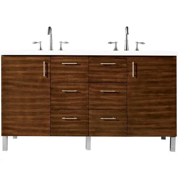 The Metropolitan 60" American Walnut Double Vanity by James Martin Vanities is a wall-mount optional cabinet with mounting brackets and removable Brushed Nickel legs. This cabinet offers ample storage space and soft-close doors and drawers. The look is completed with a 3 CM eased edge White Zeus Silestone top and one white ceramic rectangular sink.Two door American Walnut single vanity with six drawers and interior shelf spaceHardware Finish: Brushed NickelSolid kiln-dried Grade A hardwoodCabinet is finished inside and out with a premium undercoat finish for superior moisture and UV resistanceSoft-close undermount drawer glides and soft-close door hingesDrawer bottoms are lined with our signature brushed aluminum laminate3 CM eased edge White Zeus Silestone top and two white porcelain rectangular sinksCountertop is pre-drilled for two 3-hole 8" spreadsFaucets sold separatelyThis cabinet can be wall-hung, legs are removable; mounting hardware includedMinimal Modern style is featured in Metropolitan Series. Very clean lines and ample storage make these vanities a welcome addition to your bathroom. Hand-crafted from North American Birch hardwoods and featuring exotic veneers like American Walnut and Silver Oak, the Metropolitan series compliment todays modern interiors. The sleek drawer and door pulls are finished in a soft brushed satin silver color. This series also features premium soft-close drawer glides and door hinges. The cabinets ship with chrome finished metal legs for standard installation. The Metropolitan cabinets may also be wall mounted, for a “floating” vanity look. Heavy-duty brackets for wall mounting are included with the cabinet.1 year warranty against manufacturer's defects. We will repair or replace any defective product, if the product is defective in material or workmanship at our discretion. No warranty is expressed or implied regarding damages resulting from consumer misuse.