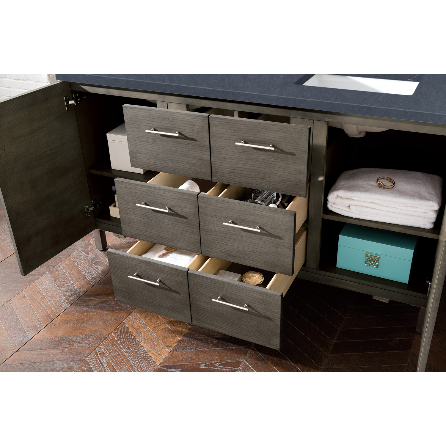 - Two door Silver Oak single vanity with six drawers and interior shelf space