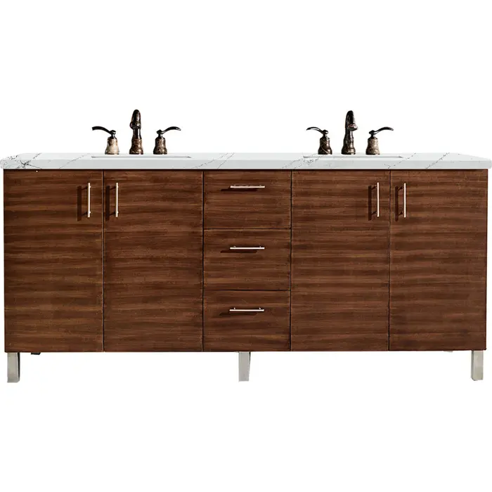 The Metropolitan 72" American Walnut Double Vanity by James Martin Vanities is a wall-mount optional cabinet with mounting brackets and removable Brushed Nickel legs. This cabinet offers ample storage space and soft-close doors and drawers. The look is completed with a 3 CM eased edge Ethereal Noctis Silestone top and one white ceramic rectangular sink.Four door American Walnut single vanity with three drawers and interior shelf spaceHardware Finish: Brushed NickelSolid kiln-dried Grade A hardwoodCabinet is finished inside and out with a premium undercoat finish for superior moisture and UV resistanceSoft-close undermount drawer glides and soft-close door hingesDrawer bottoms are lined with our signature brushed aluminum laminate3 CM eased edge Ethereal Noctis Silestone top and two white porcelain rectangular sinksCountertop is pre-drilled for two 3-hole 8" spreadsFaucets sold separatelyThis cabinet can be wall-hung, legs are removable; mounting hardware includedMinimal Modern style is featured in Metropolitan Series. Very clean lines and ample storage make these vanities a welcome addition to your bathroom. Hand-crafted from North American Birch hardwoods and featuring exotic veneers like American Walnut and Silver Oak, the Metropolitan series compliment todays modern interiors. The sleek drawer and door pulls are finished in a soft brushed satin silver color. This series also features premium soft-close drawer glides and door hinges. The cabinets ship with chrome finished metal legs for standard installation. The Metropolitan cabinets may also be wall mounted, for a “floating” vanity look. Heavy-duty brackets for wall mounting are included with the cabinet.1 year warranty against manufacturer's defects. We will repair or replace any defective product, if the product is defective in material or workmanship at our discretion. No warranty is expressed or implied regarding damages resulting from consumer misuse.