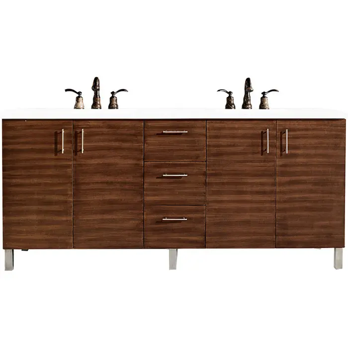 The Metropolitan 72" American Walnut Double Vanity by James Martin Vanities is a wall-mount optional cabinet with mounting brackets and removable Brushed Nickel legs. This cabinet offers ample storage space and soft-close doors and drawers. The look is completed with a 3 CM eased edge White Zeus Silestone top and one white ceramic rectangular sink.Four door American Walnut single vanity with three drawers and interior shelf spaceHardware Finish: Brushed NickelSolid kiln-dried Grade A hardwoodCabinet is finished inside and out with a premium undercoat finish for superior moisture and UV resistanceSoft-close undermount drawer glides and soft-close door hingesDrawer bottoms are lined with our signature brushed aluminum laminate3 CM eased edge White Zeus Silestone top and two white porcelain rectangular sinksCountertop is pre-drilled for two 3-hole 8" spreadsFaucets sold separatelyThis cabinet can be wall-hung, legs are removable; mounting hardware includedMinimal Modern style is featured in Metropolitan Series. Very clean lines and ample storage make these vanities a welcome addition to your bathroom. Hand-crafted from North American Birch hardwoods and featuring exotic veneers like American Walnut and Silver Oak, the Metropolitan series compliment todays modern interiors. The sleek drawer and door pulls are finished in a soft brushed satin silver color. This series also features premium soft-close drawer glides and door hinges. The cabinets ship with chrome finished metal legs for standard installation. The Metropolitan cabinets may also be wall mounted, for a “floating” vanity look. Heavy-duty brackets for wall mounting are included with the cabinet.1 year warranty against manufacturer's defects. We will repair or replace any defective product, if the product is defective in material or workmanship at our discretion. No warranty is expressed or implied regarding damages resulting from consumer misuse.