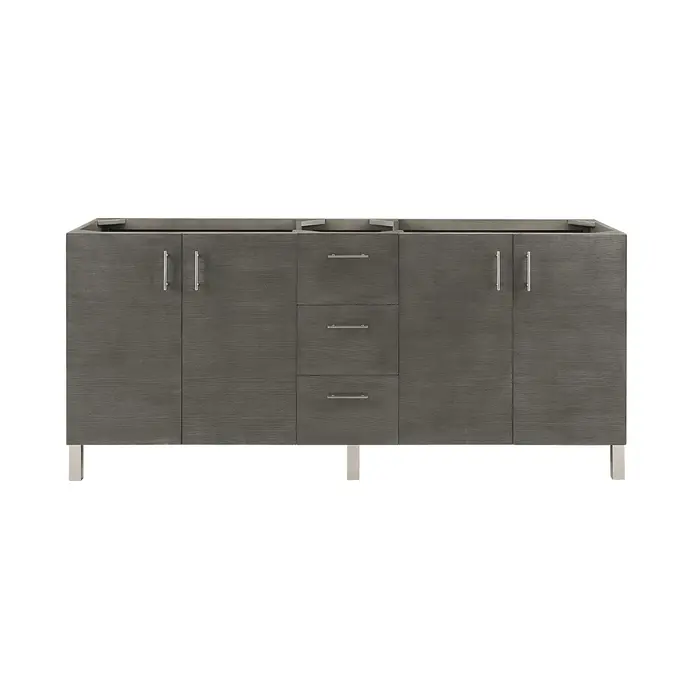 The Metropolitan 72" Silver Oak Double Vanity Cabinet by James Martin Vanities is a wall-mount optional cabinet with mounting brackets and removable Brushed Nickel legs. This cabinet offers ample storage space and soft-close doors and drawers.Four door Silver Oak single vanity cabinet with three drawers and interior shelf spaceHardware Finish: Brushed NickelSolid kiln-dried Grade A hardwoodCabinet is finished inside and out with a premium undercoat finish for superior moisture and UV resistanceSoft-close undermount drawer glides and soft-close door hingesDrawer bottoms are lined with our signature brushed aluminum laminateCabinet only, countertop and sinks not includedThis cabinet can be wall-hung, legs are removable; mounting hardware includedMinimal Modern style is featured in Metropolitan Series. Very clean lines and ample storage make these vanities a welcome addition to your bathroom. Hand-crafted from North American Birch hardwoods and featuring exotic veneers like American Walnut and Silver Oak, the Metropolitan series compliment todays modern interiors. The sleek drawer and door pulls are finished in a soft brushed satin silver color. This series also features premium soft-close drawer glides and door hinges. The cabinets ship with chrome finished metal legs for standard installation. The Metropolitan cabinets may also be wall mounted, for a “floating” vanity look. Heavy-duty brackets for wall mounting are included with the cabinet.1 year warranty against manufacturer's defects. We will repair or replace any defective product, if the product is defective in material or workmanship at our discretion. No warranty is expressed or implied regarding damages resulting from consumer misuse.