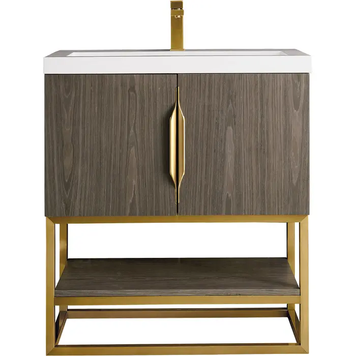 James Martin Columbia 31.5 inch Single Vanity, Ash Gray, Radiant Gold, w/ White Glossy Composite Stone Top, 840108963490, 883-V31.5-AG-RG-WG