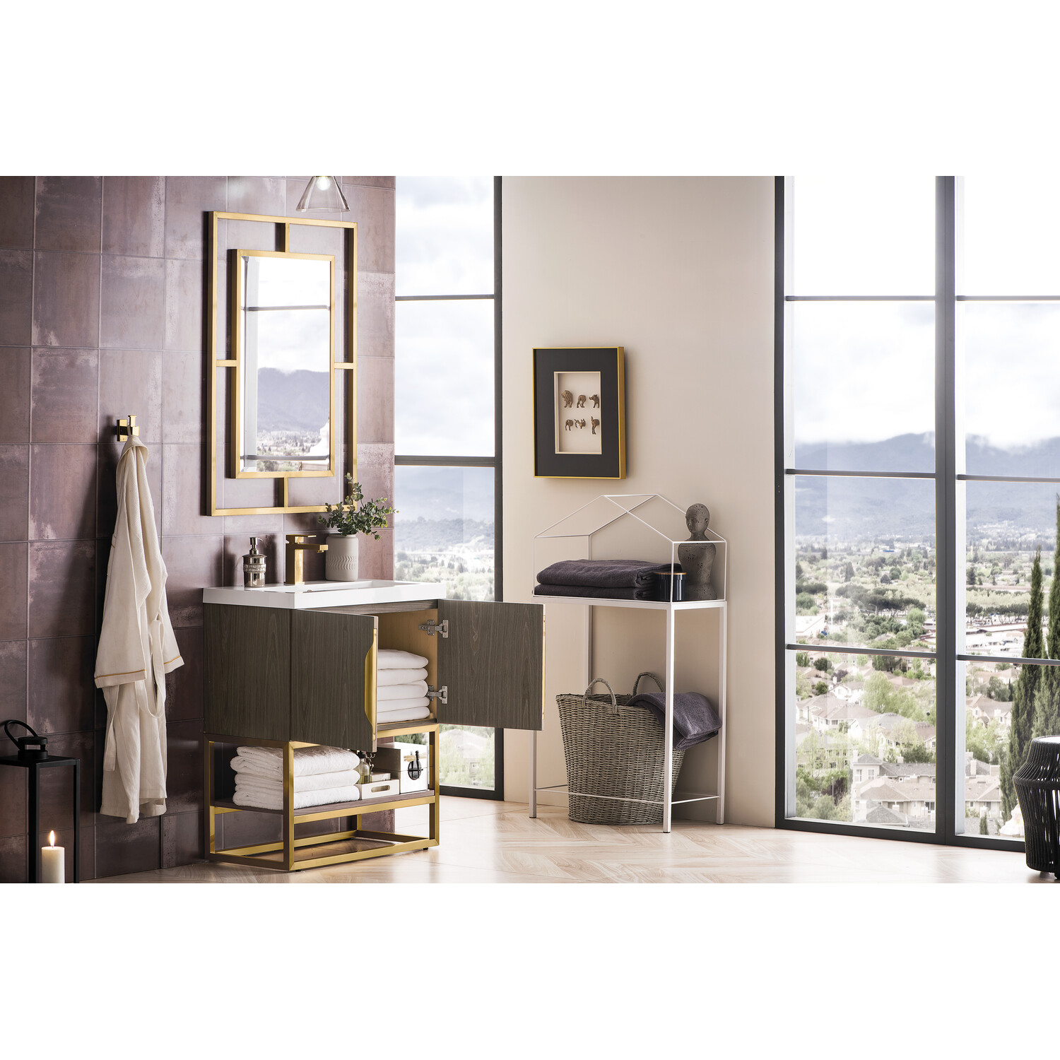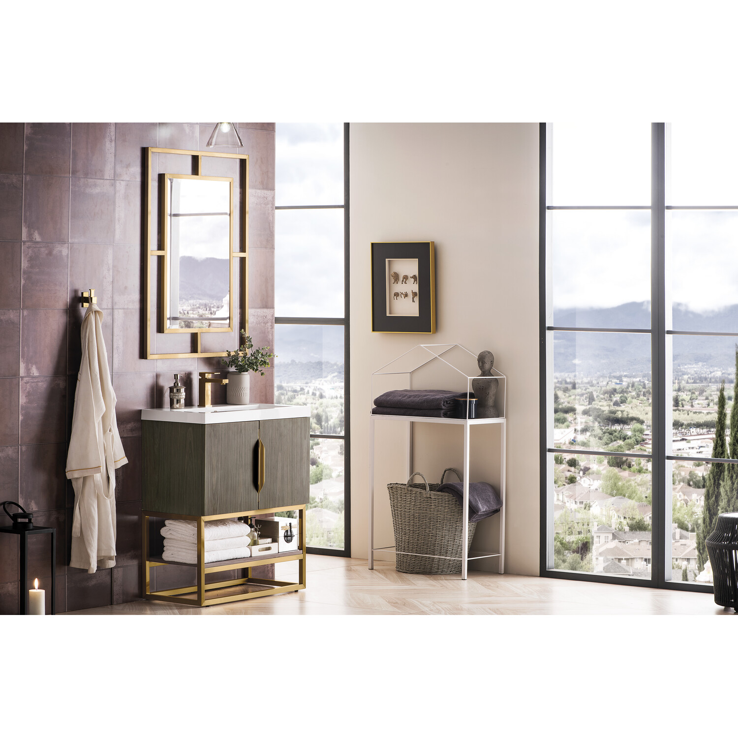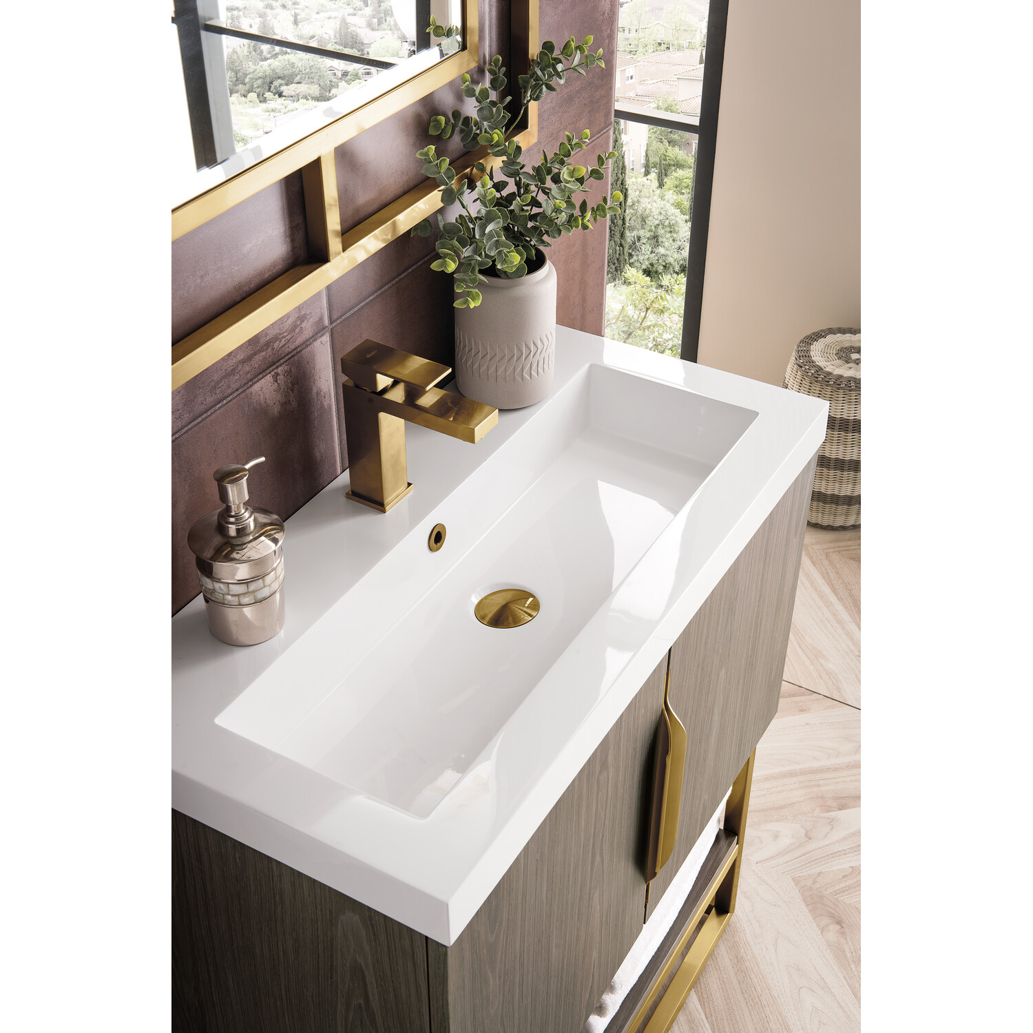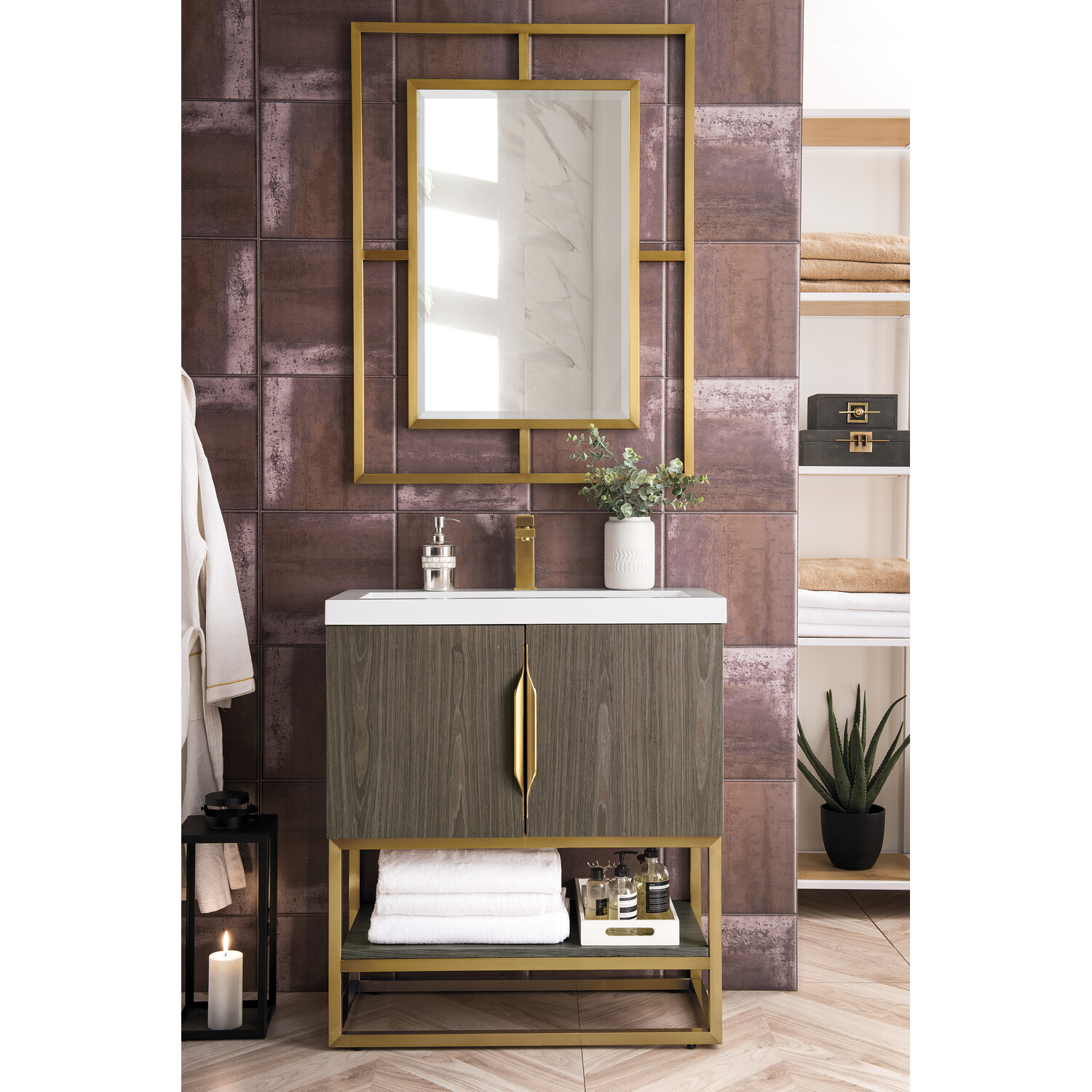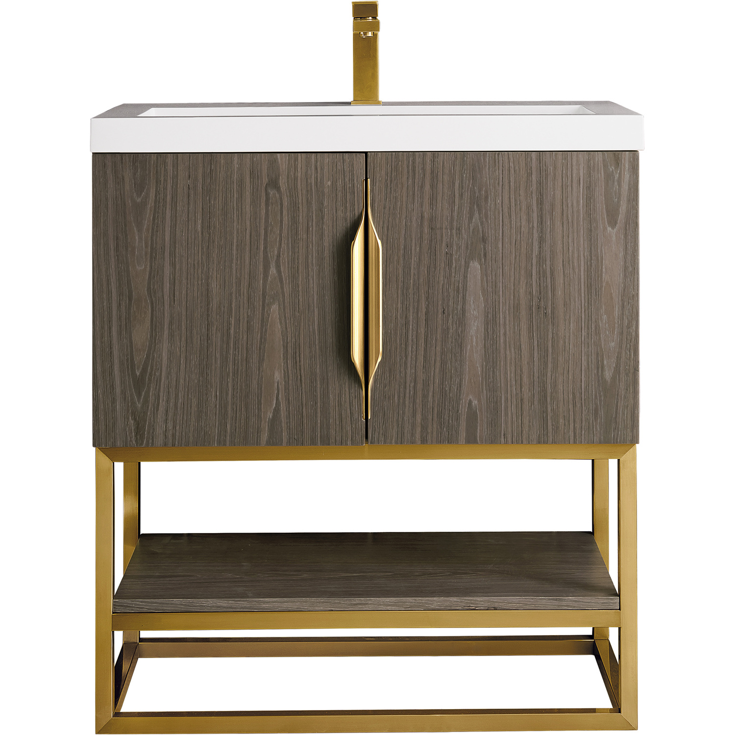 Add a fresh, contemporary touch to your bathroom with the elegant 31.5" Columbia Single Vanity by James Martin Vanities. Includes two soft-closing cabinet doors in a lovely Ash Gray weathered wood look, this stylish bathroom cabinet features clean lines and a simple metal base with tons of storage in a Radiant Gold finish. The door opens to an under-sink storage space with one adjustable shelf that will allow you to store your bathroom essentials. The Radiant Gold pulls are included, giving this cabinet the perfect finishing touch. The cabinet is finished inside and out with a premium finish for superior moisture and UV resistance. This versatile cabinet includes an integrated White Glossy Composite Stone top that is pre-drilled for your convenience.Composite stone integrated sink top in White GlossySolid plywood with engineered veneer meticulously created using real wood fibers carefully selected and dyed to create this unique pattern and warm gray color combination120 Volt UL rated electrical component with two electrical and two USB (2.0) outletsTwo doors, one exterior shelfDrawer bottoms are lined with our signature brushed aluminum laminate.Decorative furniture grade vanity gives your bathroom an elegant touchThree options of stainless steel hardware included -Brushed Nickel, Matte Black, Radiant GoldPremium soft-close hingesSuperior Moisture and UV resistanceDiscover elegance redefined with the Columbia Vanity Collection by James Martin Vanities. A testament to modern luxury, this collection brings a transformative touch to your bathroom space. With a choice of three cabinet finishes, each piece in the Columbia collection is a blend of minimalist aesthetics and functional brilliance, featuring sleek, clean lines and sculpted hardware in three metal finish options. Whether you prefer a striking, free-standing statement piece or a sleek, space-saving wall-mounted design, the Columbia collection caters to your unique style. Its innovative installation options, including an optional metal base, ensure a seamless fit into any bathroom layout. The beautiful yet durable composite stone integrated sinktop is impact-resistant with an antibacterial nano-coat surface."1 year warranty against manufacturer's defects. We will repair or replace any defective product, if the product is defective in material or workmanship at our discretion. No warranty is expressed or implied regarding damages resulting from consumer misuse.