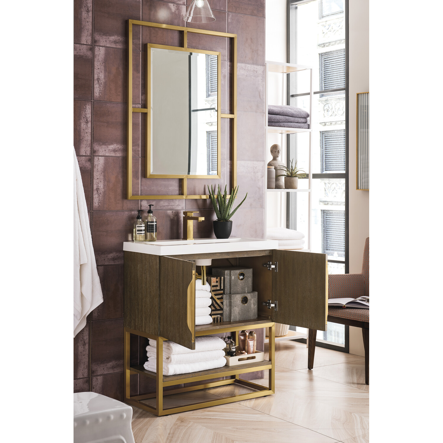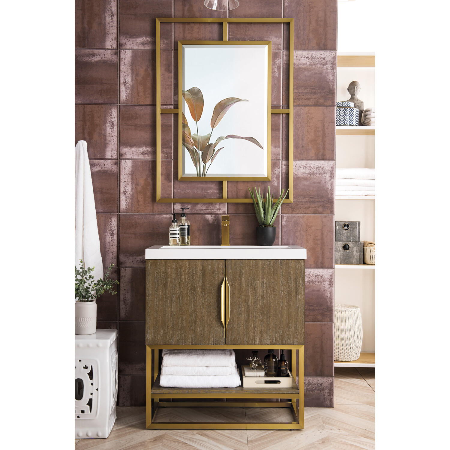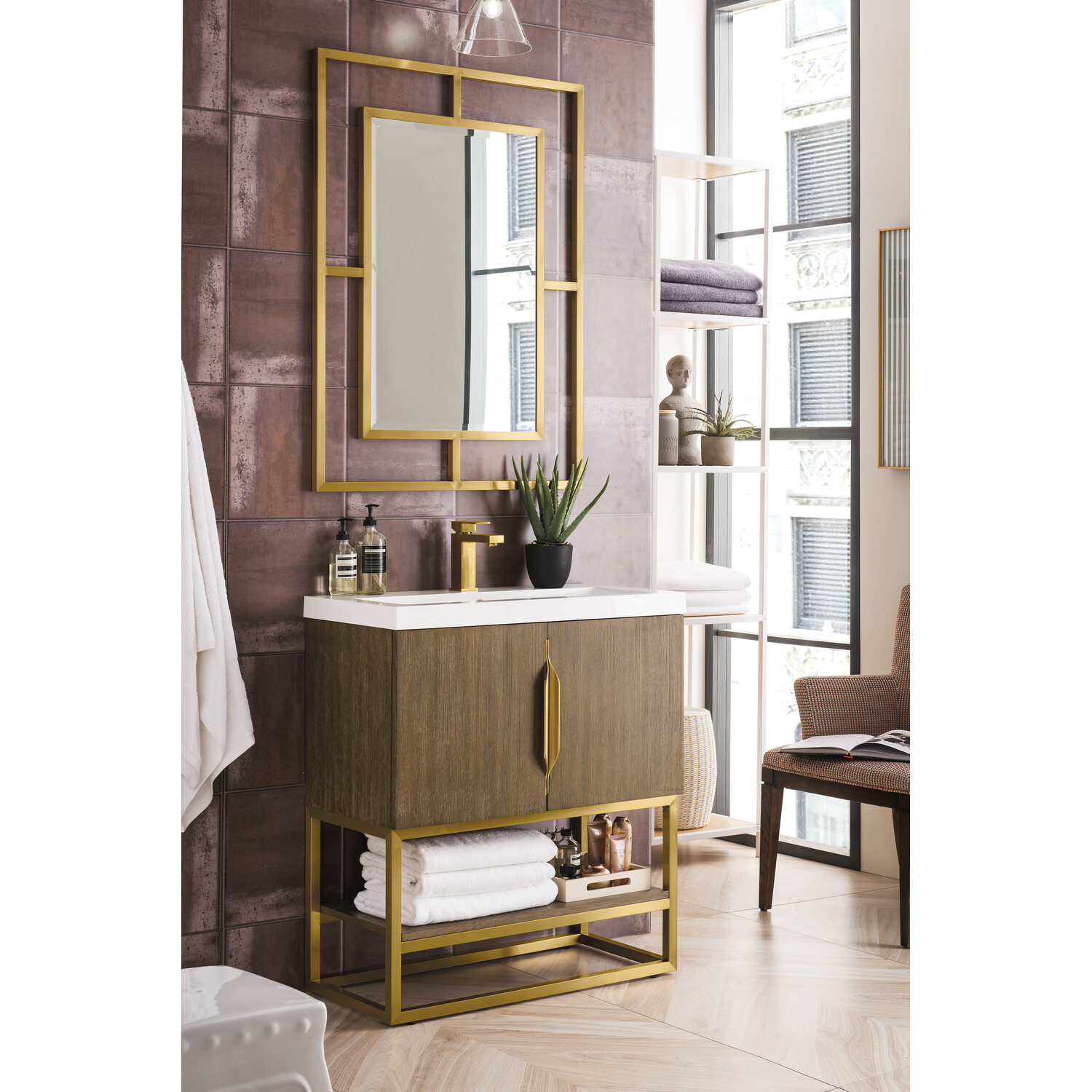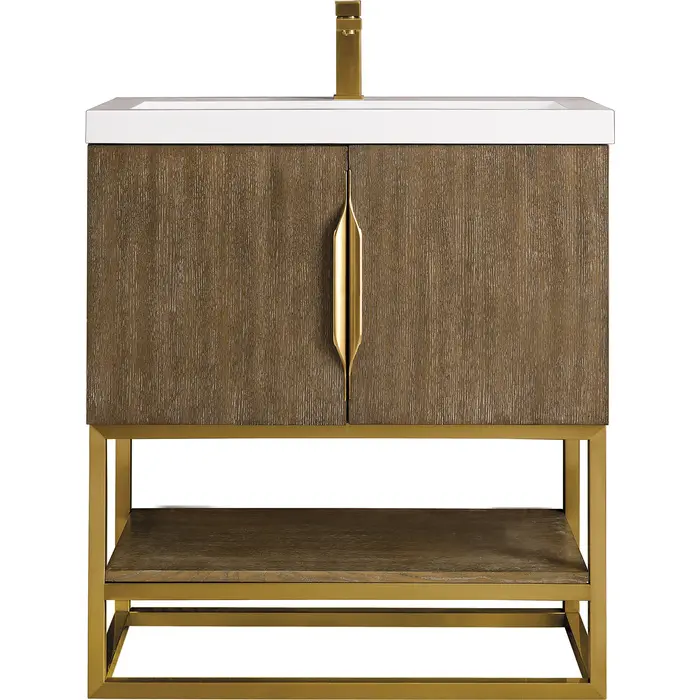 James Martin Columbia 31.5 inch Single Vanity, Latte Oak, Radiant Gold, w/ White Glossy Composite Stone Top, 840108963636, 883-V31.5-LO-RG-WG