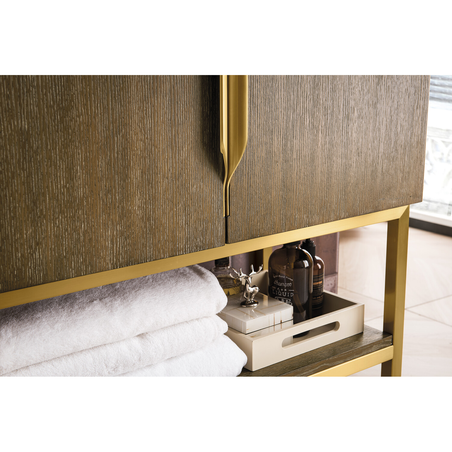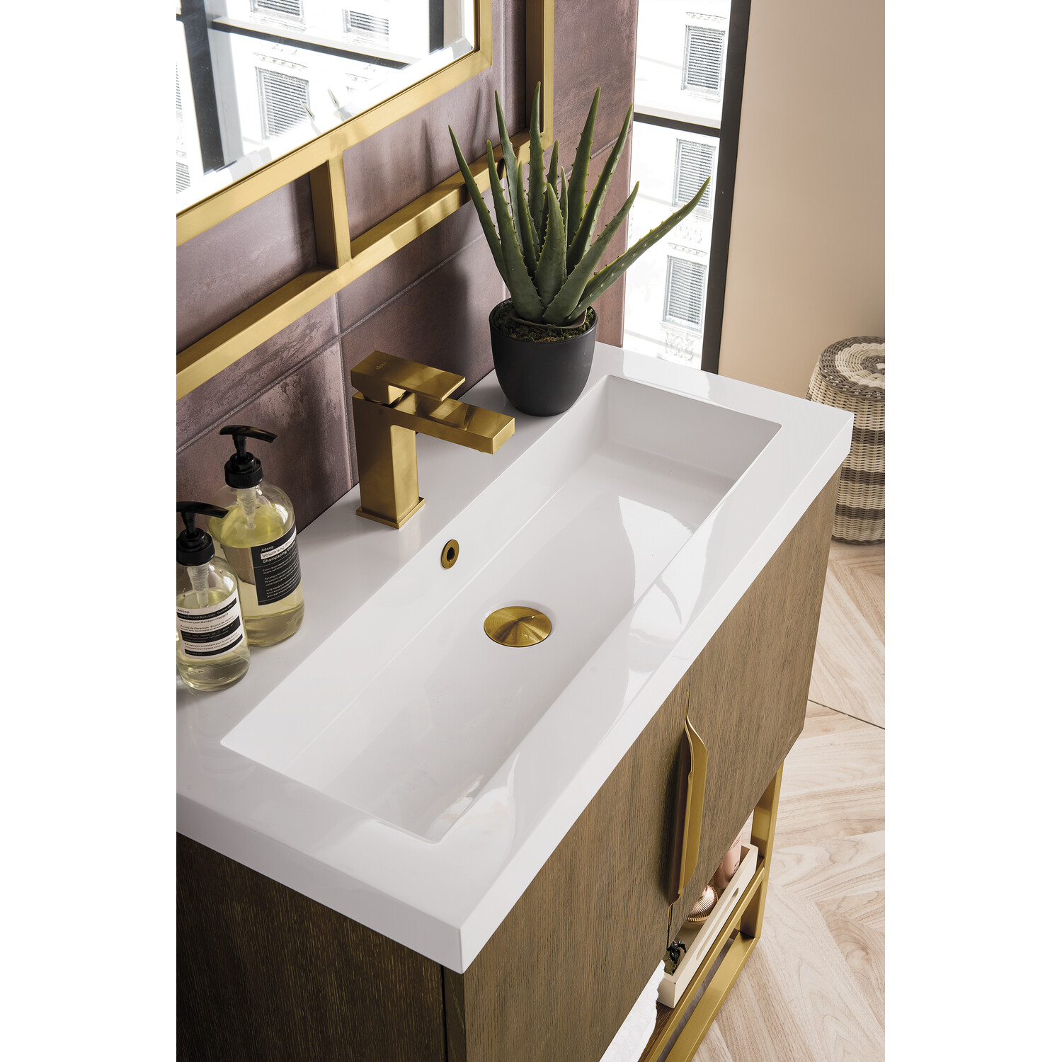 Add a fresh, contemporary touch to your bathroom with the elegant 31.5" Columbia Single Vanity by James Martin Vanities. Includes two soft-closing cabinet doors in a lovely Latte Oak finish, this stylish bathroom cabinet features clean lines and a simple metal base with tons of storage in a Radiant Gold finish. The door opens to an under-sink storage space with one adjustable shelf that will allow you to store your bathroom essentials. The Radiant Gold pulls are included, giving this cabinet the perfect finishing touch. The cabinet is finished inside and out with a premium finish for superior moisture and UV resistance. This versatile cabinet includes an integrated White Glossy Composite Stone top that is pre-drilled for your convenience.Composite stone integrated sink top in White GlossySolid plywood with Red Oak Veneers120 Volt UL rated electrical component with two electrical and two USB (2.0) outletsTwo doors, one exterior shelfDrawer bottoms are lined with our signature brushed aluminum laminate.Decorative furniture grade vanity gives your bathroom an elegant touchThree options of stainless steel hardware included -Brushed Nickel, Matte Black, Radiant GoldPremium soft-close hingesSuperior Moisture and UV resistanceDiscover elegance redefined with the Columbia Vanity Collection by James Martin Vanities. A testament to modern luxury, this collection brings a transformative touch to your bathroom space. With a choice of three cabinet finishes, each piece in the Columbia collection is a blend of minimalist aesthetics and functional brilliance, featuring sleek, clean lines and sculpted hardware in three metal finish options. Whether you prefer a striking, free-standing statement piece or a sleek, space-saving wall-mounted design, the Columbia collection caters to your unique style. Its innovative installation options, including an optional metal base, ensure a seamless fit into any bathroom layout. The beautiful yet durable composite stone integrated sinktop is impact-resistant with an antibacterial nano-coat surface."1 year warranty against manufacturer's defects. We will repair or replace any defective product, if the product is defective in material or workmanship at our discretion. No warranty is expressed or implied regarding damages resulting from consumer misuse.