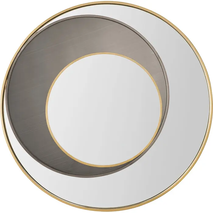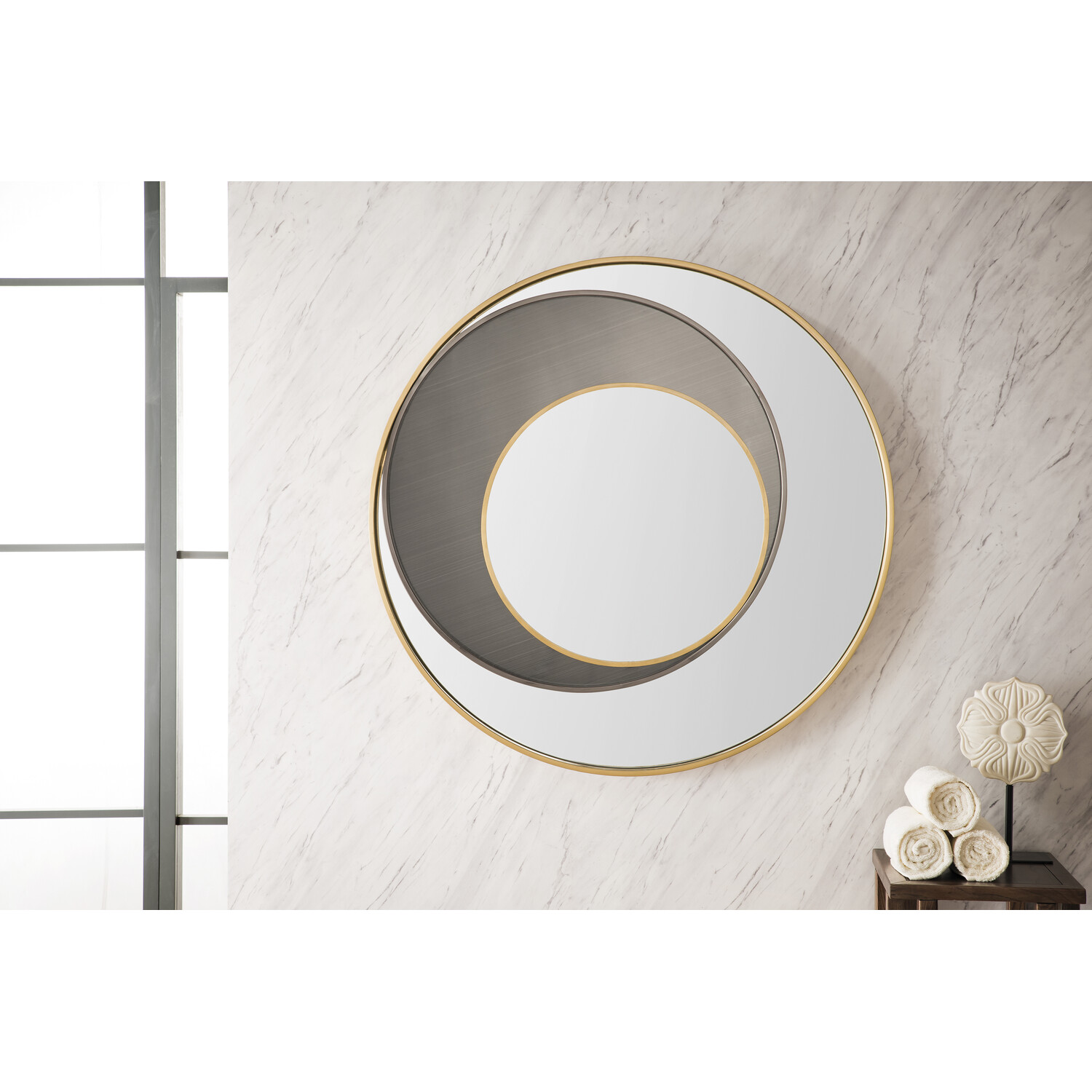 Add a modern element to your bathroom vanity with the Cosmos Mirror by James Martin Vanities. This modern mirror with its layered look gives you an updated twist on a classic round mirror with its simple use of geometric forms. The frame is made of stainless-steel metal that has a Radiant Gold finish on it that is accented not only by the premium glass itself but with a playfully off-center brushed Smokey Onyx colored half-moon. This unique mirror will make a wonderful addition to not only your bathroom vanity but can be used in any room as a wonderful focal point. This gorgeous mirror makes an impressive statement that is perfect for any living space in your home.Outer dimensions measure: 35.38" W x 1.63" D x 35.38" HRadiant Gold and Onyx frame is constructed of stainless steel making it both durable and moisture resistantMounting hardware includedMirrors are just as useful for decoration as they are for their functional applications. James Martin Vanities has a wide selection of mirrors featuring different sizes, shapes, styles, and colors, just about anything you might be looking for. We feel that a mirror gives you the potential to transform you home, making a room lighter and brighter and even giving you the illusion of a larger space. We offer a selection of both vanity and wall mirrors many of which are hand finished. So, take a minute to review our selection and find the perfect way to add that finishing touch that makes a house a home.1 year warranty against manufacturer's defects. We will repair or replace any defective product, if the product is defective in material or workmanship at our discretion. No warranty is expressed or implied regarding damages resulting from consumer misuse.