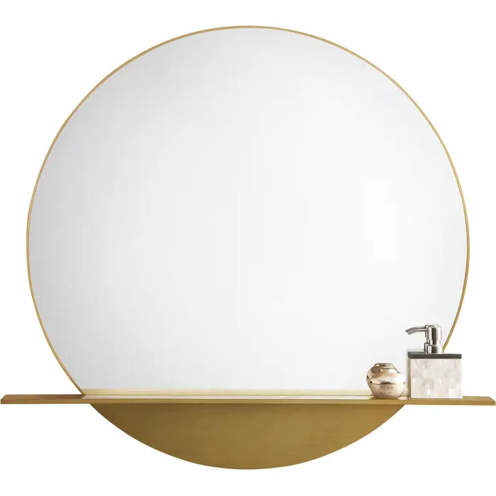 The 36" Radiant Gold Platform Mirror by James Martin Vanities is contemporary in design, yet brings a primal energy to any room you put it in. This round shaped mirror is surrounded by a gleaming gold frame. The integrated shelf is ideal for holding toiletries in the bathroom, key in your entry way or even decorative accents in the living room. The raw metal finish will easily pair with any of your existing décor and it comes ready to hang. For your convenience, the mirror includes mounting hardware in the package.Outer dimensions measure: 39.38" W x 4.0" D x 36.0" HRadiant Gold frame is constructed of stainless steel making it both durable and moisture resistantMounting hardware includedMirrors are just as useful for decoration as they are for their functional applications. James Martin Vanities has a wide selection of mirrors featuring different sizes, shapes, styles, and colors, just about anything you might be looking for. We feel that a mirror gives you the potential to transform you home, making a room lighter and brighter and even giving you the illusion of a larger space. We offer a selection of both vanity and wall mirrors many of which are hand finished. So, take a minute to review our selection and find the perfect way to add that finishing touch that makes a house a home.1 year warranty against manufacturer's defects. We will repair or replace any defective product, if the product is defective in material or workmanship at our discretion. No warranty is expressed or implied regarding damages resulting from consumer misuse.
