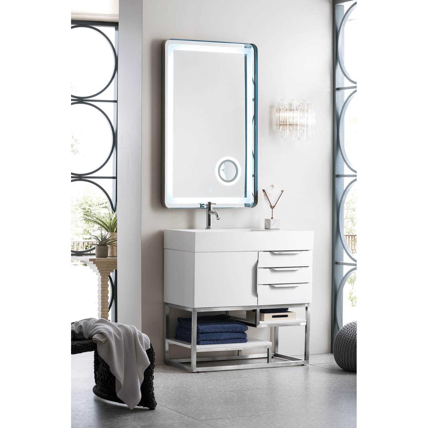 James Martin Columbia 36 inch Single Vanity, Glossy White, Brushed Nickel w/ Glossy White Composite Stone Top, 840108963728, 983-V36-GW-BN-GW