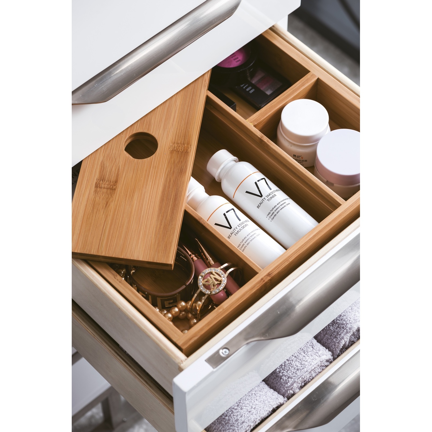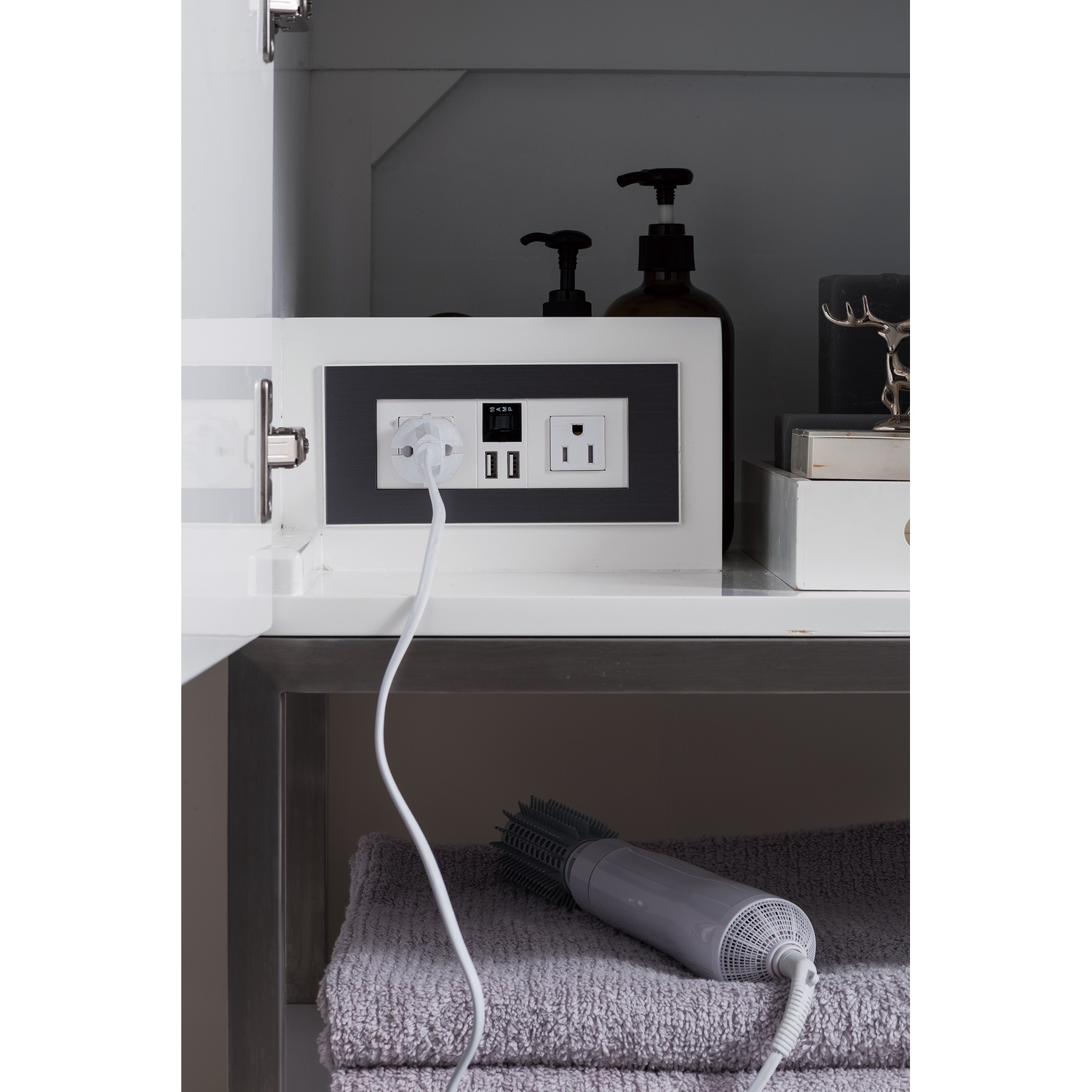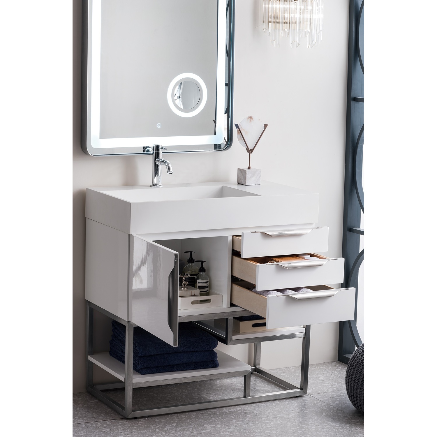 The Columbia 36" Glossy White Single Vanity offers maximum storage with one soft-closing door, three soft-closing drawers, and lower shelf space. This cabinet includes premium features such as one solid bamboo drawer organizer and one 120 Volt UL Rated electrical component with two electrical and two USB outlets. The Brushed Nickel finished base coordinates with the pulls. Glossy White Composite Stone countertop with integrated left side offset sink.Composite stone integrated sink top in Glossy WhiteSolid plywood120 Volt UL rated electrical component with two electrical and two USB (2.0) outletsOne door, three drawers, and two exterior shelvesDrawer bottoms are lined with our signature brushed aluminum laminate.Solid bamboo in-drawer organizerStainless Steel Hardware in Brushed NickelDiscover elegance redefined with the Columbia Vanity Collection by James Martin Vanities. A testament to modern luxury, this collection brings a transformative touch to your bathroom space. With a choice of three cabinet finishes, each piece in the Columbia collection is a blend of minimalist aesthetics and functional brilliance, featuring sleek, clean lines and sculpted hardware in three metal finish options. Whether you prefer a striking, free-standing statement piece or a sleek, space-saving wall-mounted design, the Columbia collection caters to your unique style. Its innovative installation options, including an optional metal base, ensure a seamless fit into any bathroom layout. The beautiful yet durable composite stone integrated sinktop is impact-resistant with an antibacterial nano-coat surface."1 year warranty against manufacturer's defects. We will repair or replace any defective product, if the product is defective in material or workmanship at our discretion. No warranty is expressed or implied regarding damages resulting from consumer misuse.