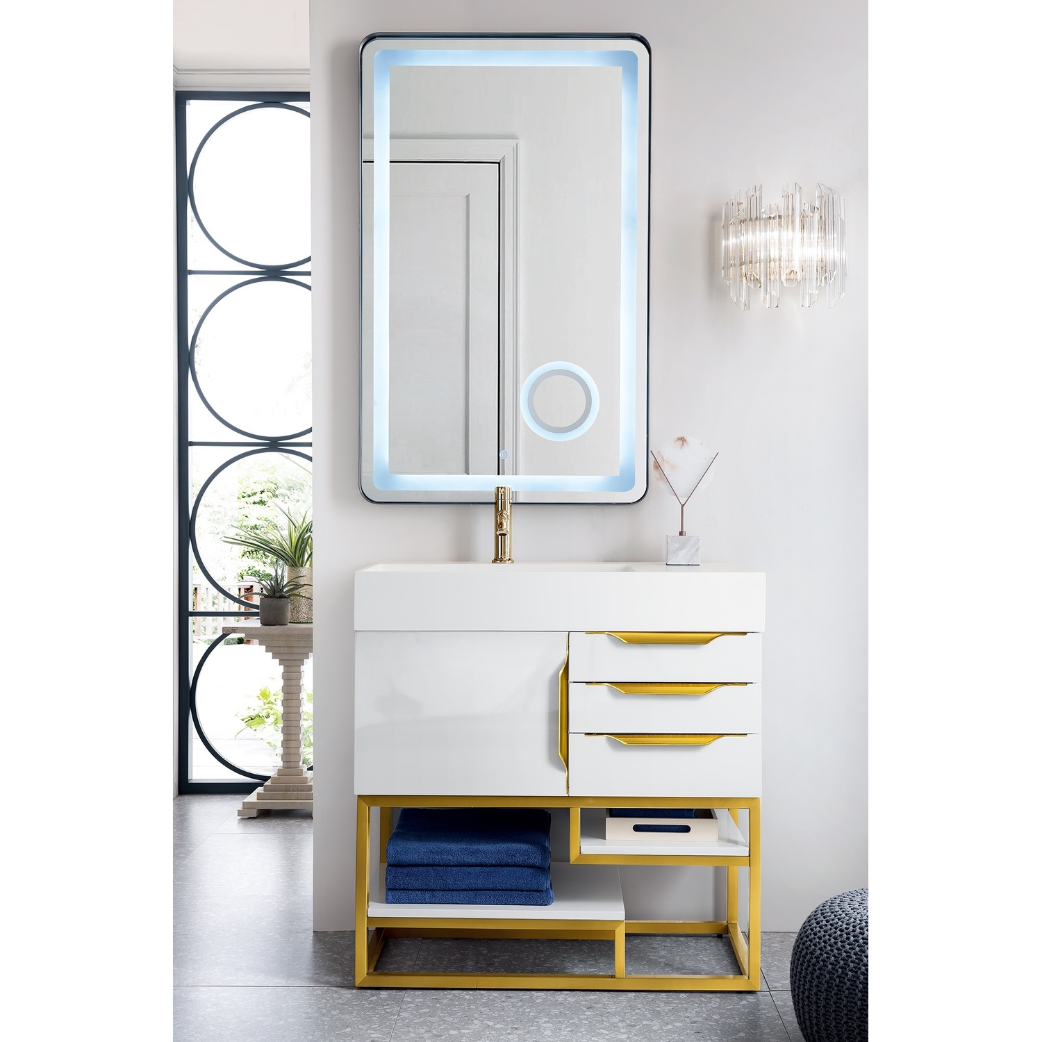 James Martin Columbia 36 inch Single Vanity, Glossy White, Radiant Gold w/ Glossy White Composite Stone Top, 840108963766, 983-V36-GW-RG-GW