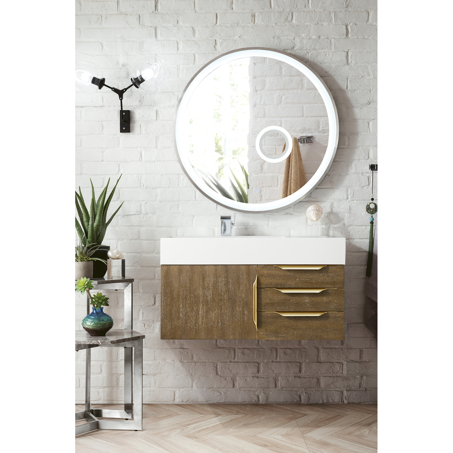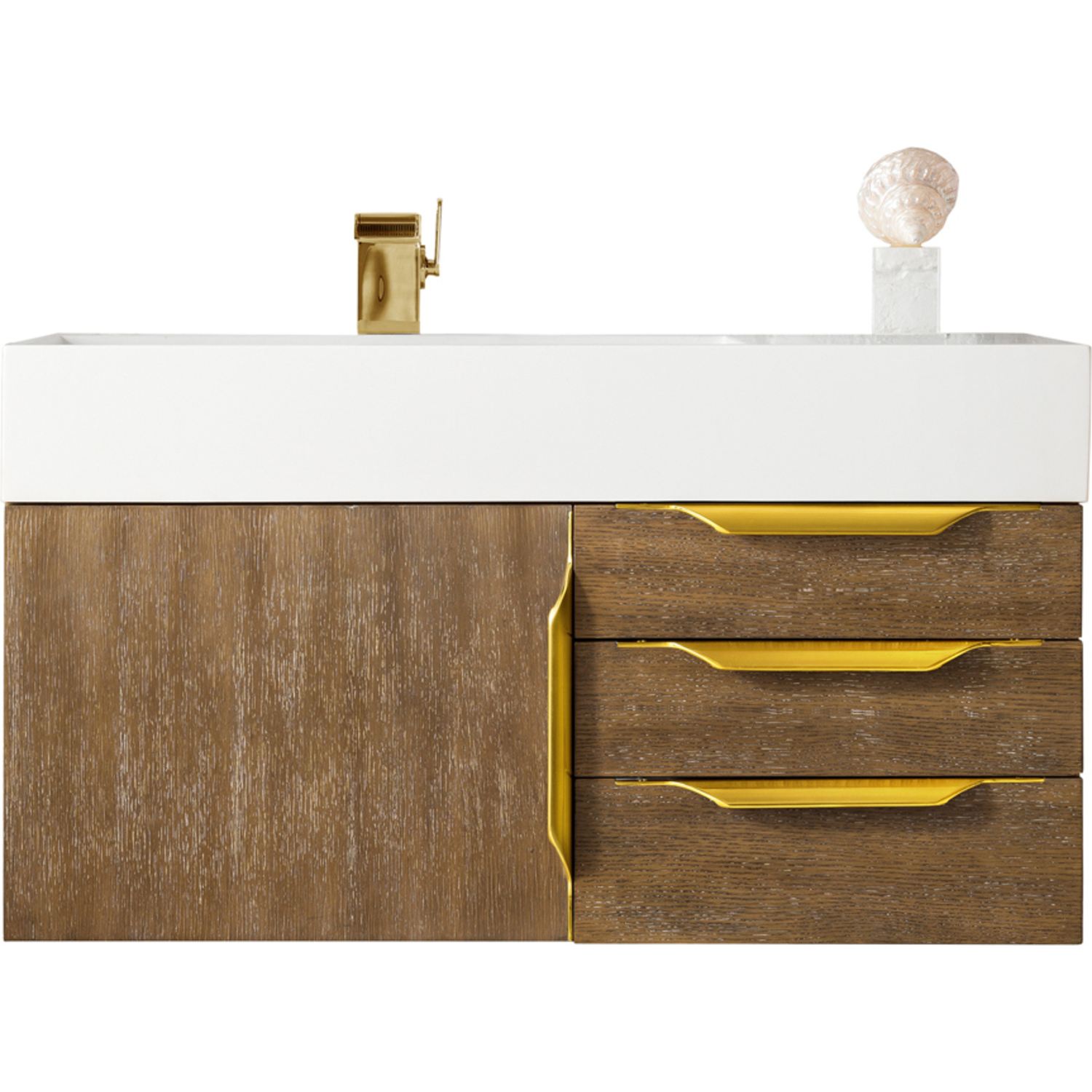 James Martin Columbia 36 inch Single Wall Mount Vanity, Latte Oak, Radiant Gold w/ Glossy White Composite Stone Top, 840108964671, 983-V36-W-LO-G-GW