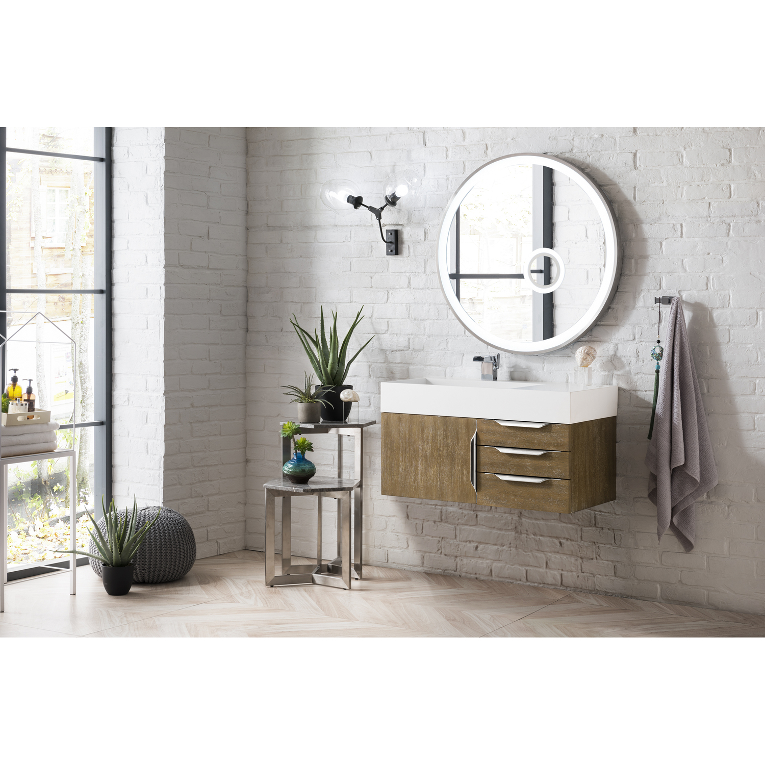 James Martin Columbia 36 inch Single Wall Mount Vanity, Latte Oak, Brushed Nickel w/ Glossy White Composite Stone Top, 840108964657, 983-V36-W-LO-N-GW