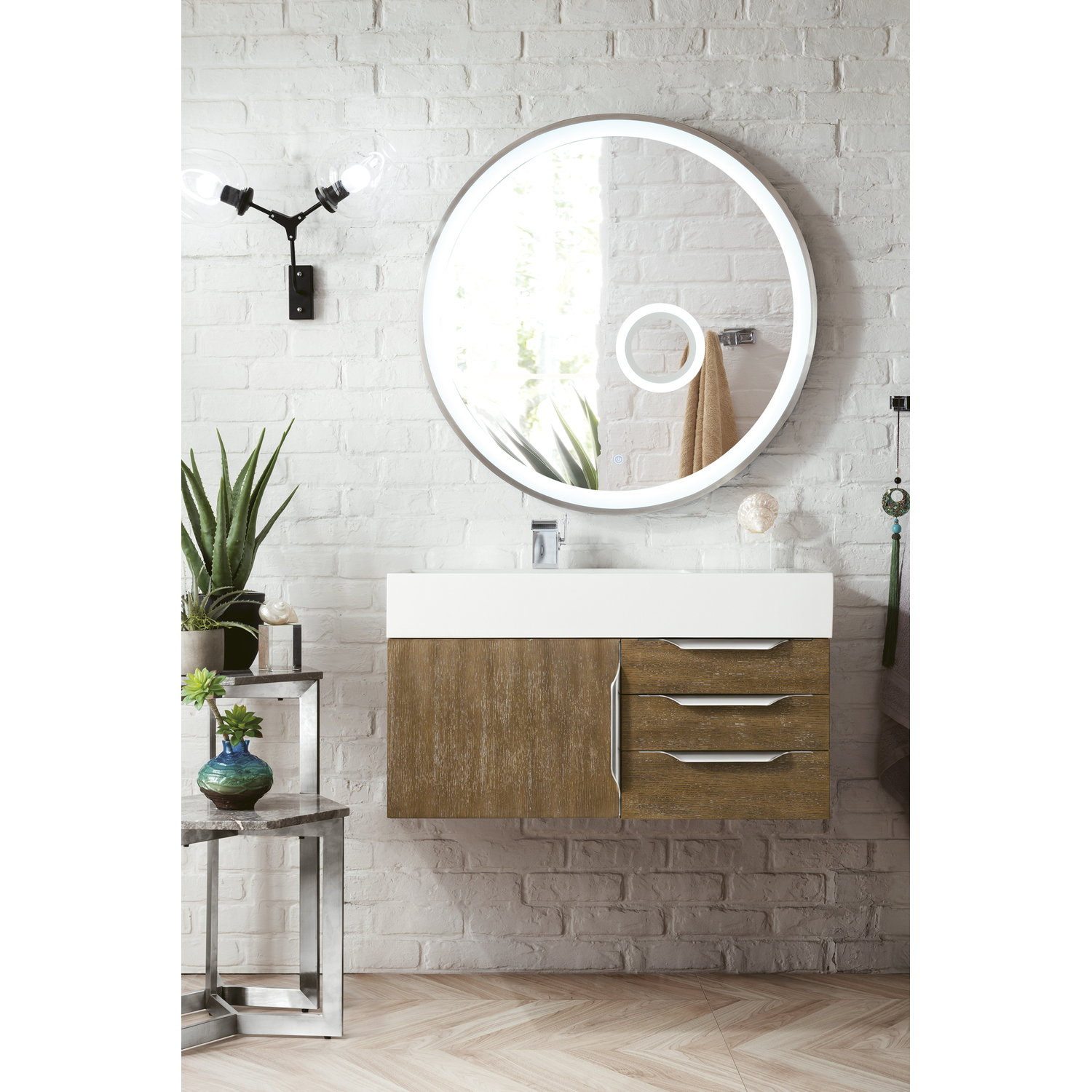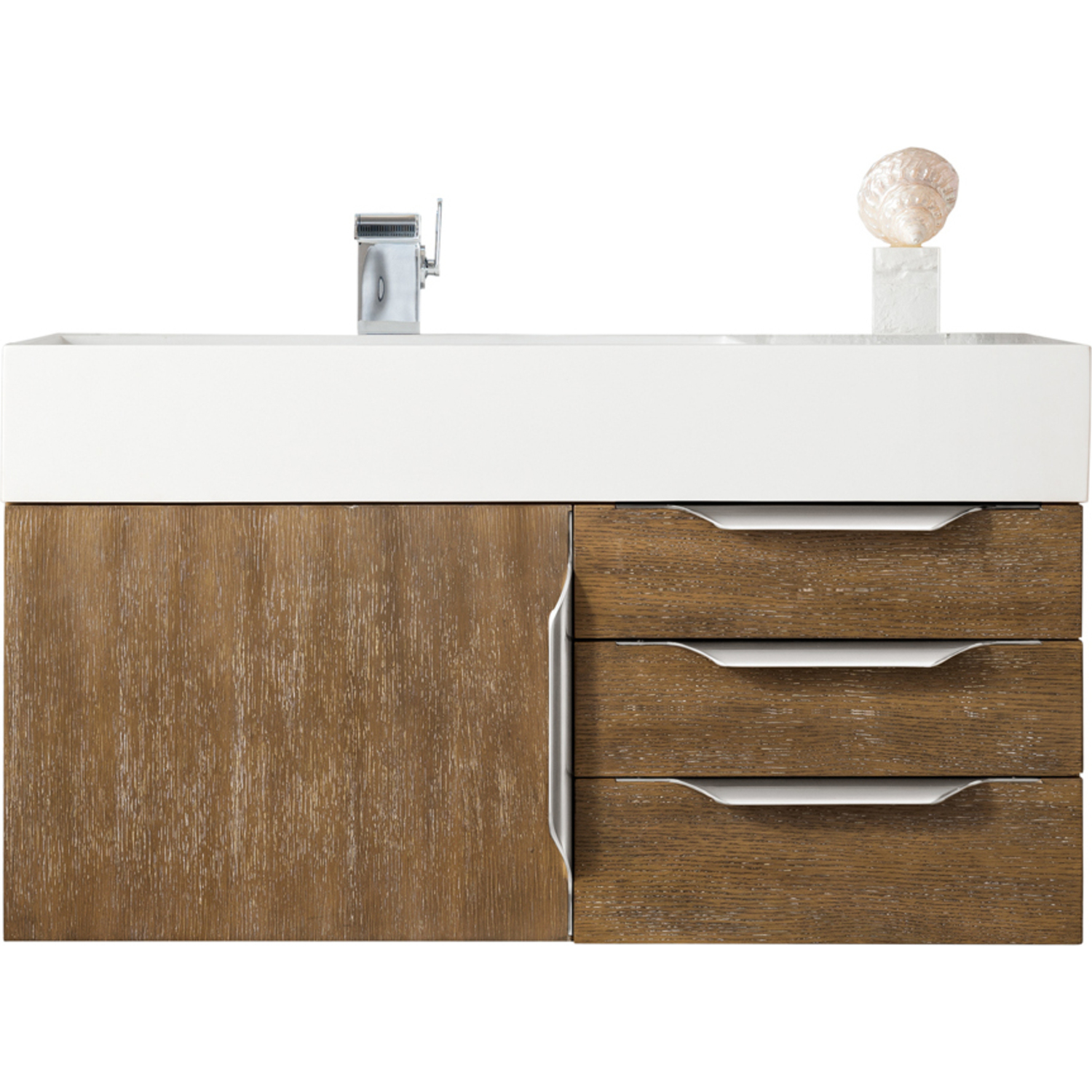 The Columbia 36" Latte Oak Single Vanity offers maximum storage with one soft-closing door and three soft-closing drawers. This cabinet includes premium features such as one solid bamboo drawer organizer and one 120 Volt UL Rated electrical component with two electrical and two USB outlets. Cabinet includes Matte Black door and drawer pulls. Glossy White Composite Stone countertop with integrated left side offset sink. This wall-mounted vanity includes heavy duty mounting brackets to create a modern look.Composite stone integrated sink top in Glossy WhiteSolid plywood with Red Oak Veneers120 Volt UL rated electrical component with two electrical and two USB (2.0) outletsOne door, three drawersDrawer bottoms are lined with our signature brushed aluminum laminate.Solid bamboo in-drawer organizerStainless Steel Hardware in Brushed NickelThis cabinet can be wall-mounted; mounting hardware includedDiscover elegance redefined with the Columbia Vanity Collection by James Martin Vanities. A testament to modern luxury, this collection brings a transformative touch to your bathroom space. With a choice of three cabinet finishes, each piece in the Columbia collection is a blend of minimalist aesthetics and functional brilliance, featuring sleek, clean lines and sculpted hardware in three metal finish options. Whether you prefer a striking, free-standing statement piece or a sleek, space-saving wall-mounted design, the Columbia collection caters to your unique style. Its innovative installation options, including an optional metal base, ensure a seamless fit into any bathroom layout. The beautiful yet durable composite stone integrated sinktop is impact-resistant with an antibacterial nano-coat surface."1 year warranty against manufacturer's defects. We will repair or replace any defective product, if the product is defective in material or workmanship at our discretion. No warranty is expressed or implied regarding damages resulting from consumer misuse.