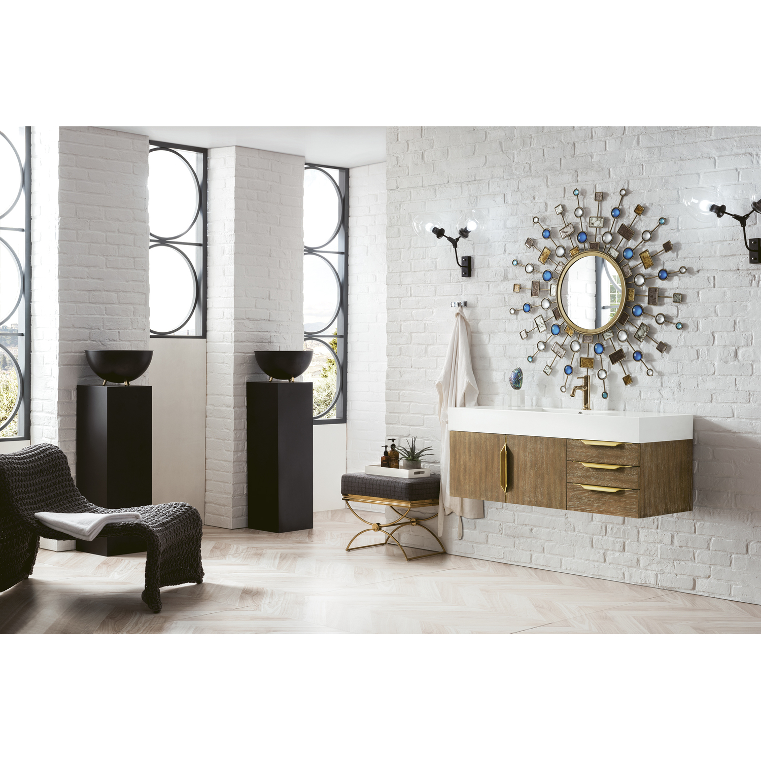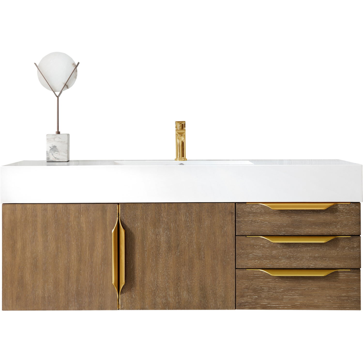 James Martin Columbia 48 inch Single Wall Mount Vanity, Latte Oak, Radiant Gold w/ Glossy White Composite Stone Top, 840108964824, 983-V48-W-LO-G-GW
