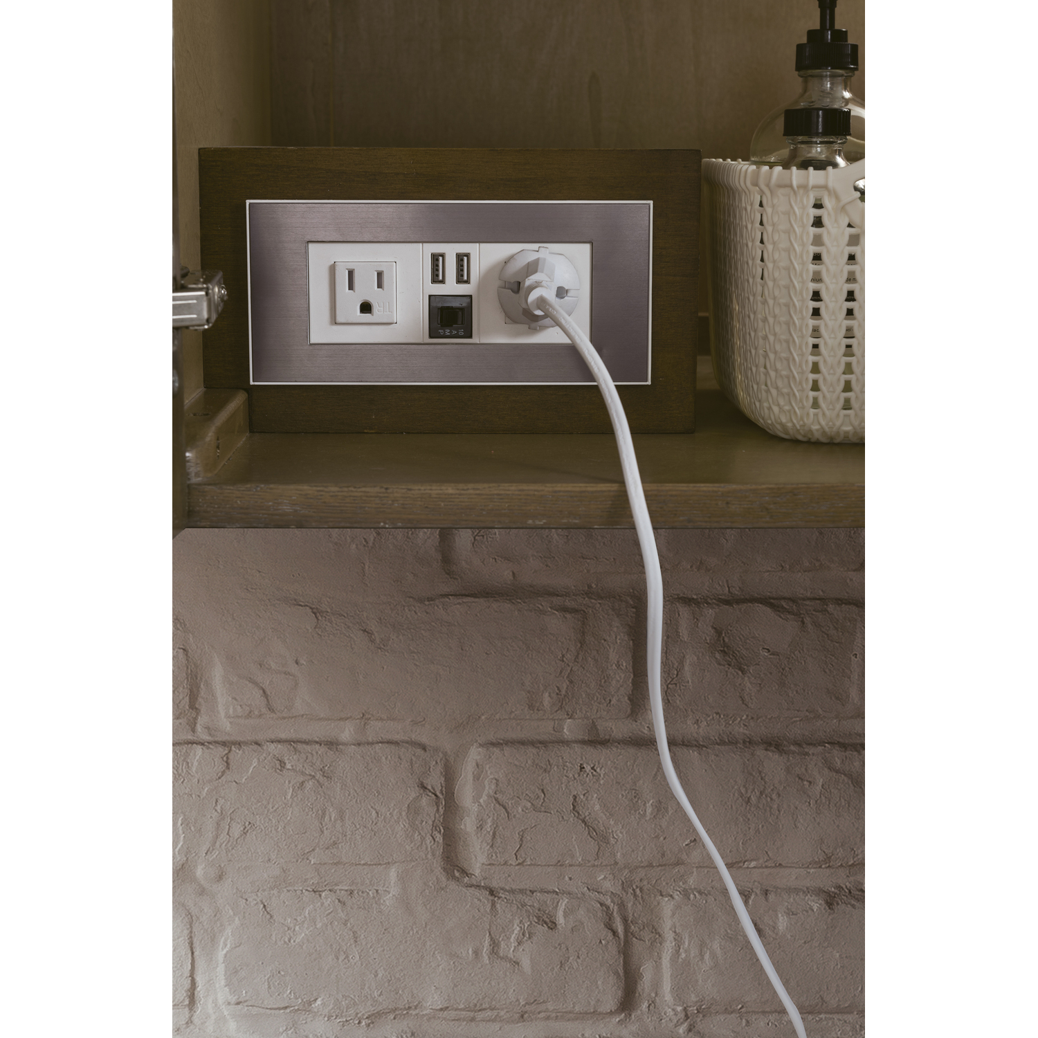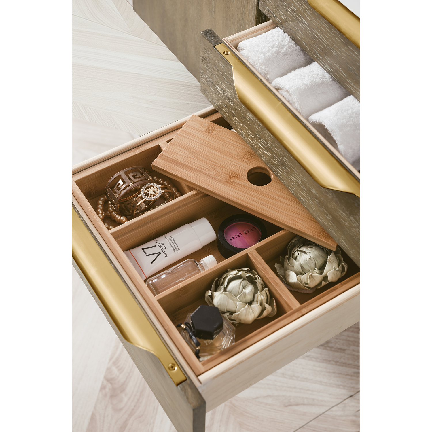 The Columbia 48" Latte Oak Single Vanity offers maximum storage with two soft-closing doors and three soft-closing drawers. This cabinet includes premium features such as one solid bamboo drawer organizer and one 120 Volt UL Rated electrical component with two electrical and two USB outlets. Cabinet includes Radiant Gold door and drawer pulls. Glossy White Composite Stone countertop with integrated sink included. This wall-mounted vanity includes heavy duty mounting brackets to create a modern look.Composite stone integrated sink top in Glossy WhiteSolid plywood with Red Oak Veneers120 Volt UL rated electrical component with two electrical and two USB (2.0) outletsTwo doors, three drawersDrawer bottoms are lined with our signature brushed aluminum laminate.Solid bamboo in-drawer organizerStainless Steel Hardware in Radiant Gold FinishThis cabinet can be wall-mounted; mounting hardware includedDiscover elegance redefined with the Columbia Vanity Collection by James Martin Vanities. A testament to modern luxury, this collection brings a transformative touch to your bathroom space. With a choice of three cabinet finishes, each piece in the Columbia collection is a blend of minimalist aesthetics and functional brilliance, featuring sleek, clean lines and sculpted hardware in three metal finish options. Whether you prefer a striking, free-standing statement piece or a sleek, space-saving wall-mounted design, the Columbia collection caters to your unique style. Its innovative installation options, including an optional metal base, ensure a seamless fit into any bathroom layout. The beautiful yet durable composite stone integrated sinktop is impact-resistant with an antibacterial nano-coat surface."1 year warranty against manufacturer's defects. We will repair or replace any defective product, if the product is defective in material or workmanship at our discretion. No warranty is expressed or implied regarding damages resulting from consumer misuse.