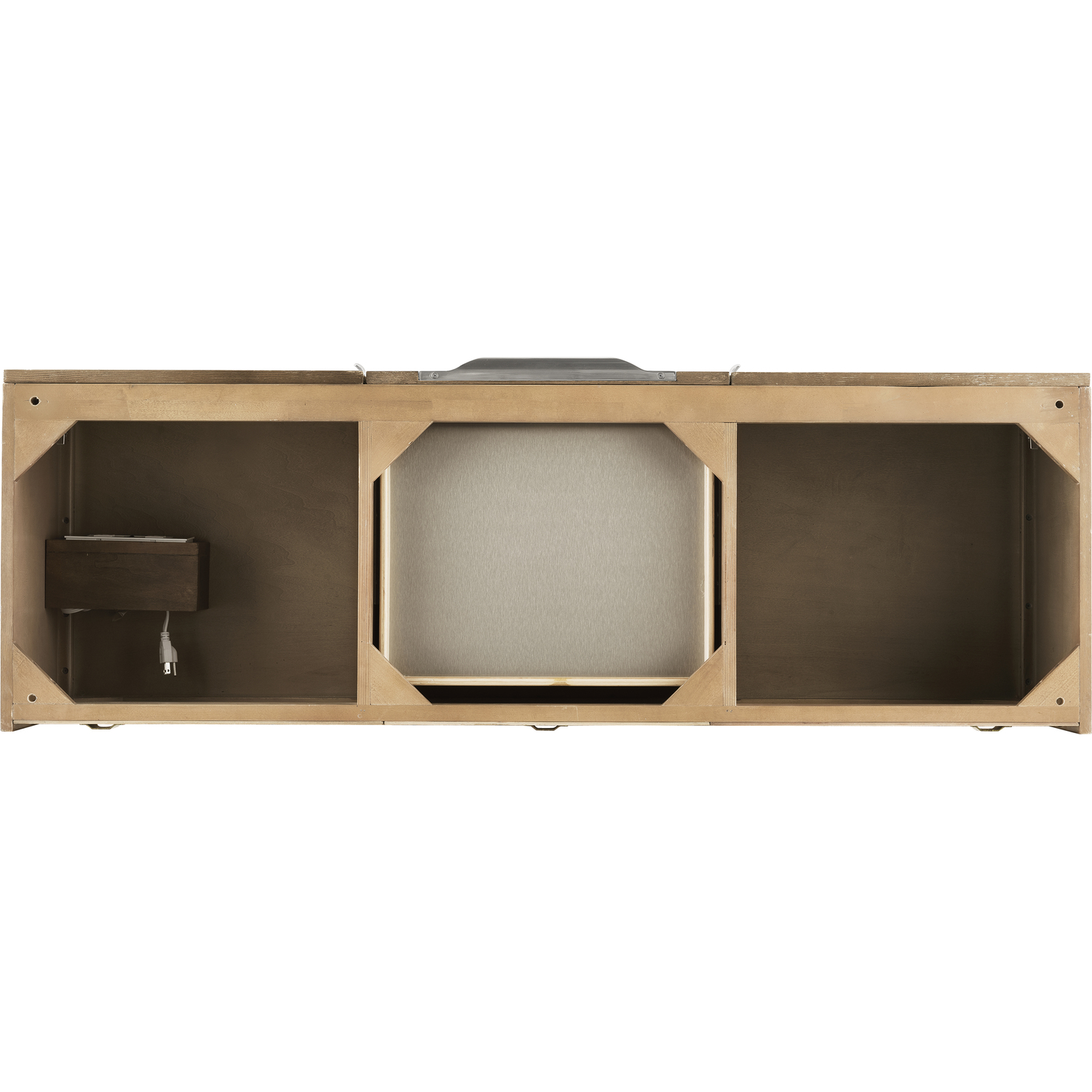 The Columbia 59" Latte Oak Double Vanity Cabinet offers maximum storage with two soft-closing doors and three soft-closing drawers. This cabinet includes premium features such as one solid bamboo drawer organizer and one 120 Volt UL Rated electrical component with two electrical and two USB outlets. Cabinet includes Brushed Nickel door and drawer pulls. This wall-mounted vanity includes heavy duty mounting brackets to create a modern look.Solid plywood with Red Oak Veneers120 Volt UL rated electrical component with two electrical and two USB (2.0) outletsTwo doors, three drawers, and two exterior shelvesDrawer bottoms are lined with our signature brushed aluminum laminate.Solid bamboo in-drawer organizerDiscover elegance redefined with the Columbia Vanity Collection by James Martin Vanities. A testament to modern luxury, this collection brings a transformative touch to your bathroom space. With a choice of three cabinet finishes, each piece in the Columbia collection is a blend of minimalist aesthetics and functional brilliance, featuring sleek, clean lines and sculpted hardware in three metal finish options. Whether you prefer a striking, free-standing statement piece or a sleek, space-saving wall-mounted design, the Columbia collection caters to your unique style. Its innovative installation options, including an optional metal base, ensure a seamless fit into any bathroom layout. The beautiful yet durable composite stone integrated sinktop is impact-resistant with an antibacterial nano-coat surface."1 year warranty against manufacturer's defects. We will repair or replace any defective product, if the product is defective in material or workmanship at our discretion. No warranty is expressed or implied regarding damages resulting from consumer misuse.