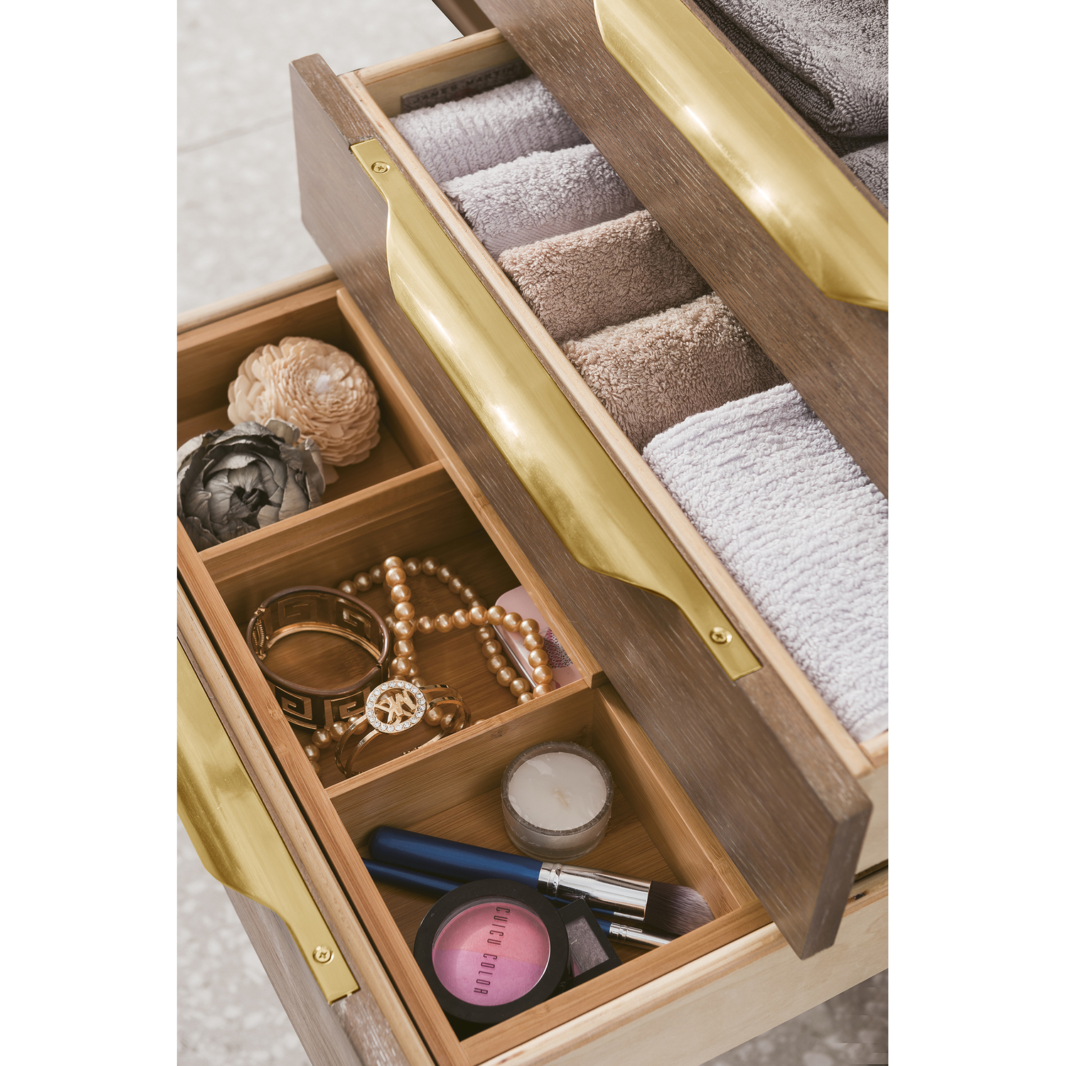 The Columbia 59" Latte Oak Double Vanity offers maximum storage with two soft-closing doors and three soft-closing drawers. This cabinet includes premium features such as one solid bamboo drawer organizer and one 120 Volt UL Rated electrical component with two electrical and two USB outlets. Cabinet includes Radiant Gold door and drawer pulls. Glossy White Composite Stone countertop with integrated sink included. This wall-mounted vanity includes heavy duty mounting brackets to create a modern look.58-7/8" L x 19-5/8" W x 19-1/8"HComposite stone integrated sinktop in Glossy WhiteSolid plywood with Red Oak Veneers120 Volt UL rated electrical component with two electrical and two USB (2.0) outletsTwo doors, three drawersDrawer bottoms are lined with our signature brushed aluminum laminate.Solid bamboo in-drawer organizerStainless Steel Hardware in Radiant Gold FinishSoft-close, undermount drawer glides and soft-close door hinges.Faucet sold separatelySuperior Moisture and UV resistanceThis cabinet can be wall-mounted; mounting hardware includedDiscover elegance redefined with the Columbia Vanity Collection by James Martin Vanities. A testament to modern luxury, this collection brings a transformative touch to your bathroom space. With a choice of three cabinet finishes, each piece in the Columbia collection is a blend of minimalist aesthetics and functional brilliance, featuring sleek, clean lines and sculpted hardware in three metal finish options. Whether you prefer a striking, free-standing statement piece or a sleek, space-saving wall-mounted design, the Columbia collection caters to your unique style. Its innovative installation options, including an optional metal base, ensure a seamless fit into any bathroom layout. The beautiful yet durable composite stone integrated sinktop is impact-resistant with an antibacterial nano-coat surface."1 year warranty against manufacturer's defects. We will repair or replace any defective product, if the product is defective in material or workmanship at our discretion. No warranty is expressed or implied regarding damages resulting from consumer misuse.