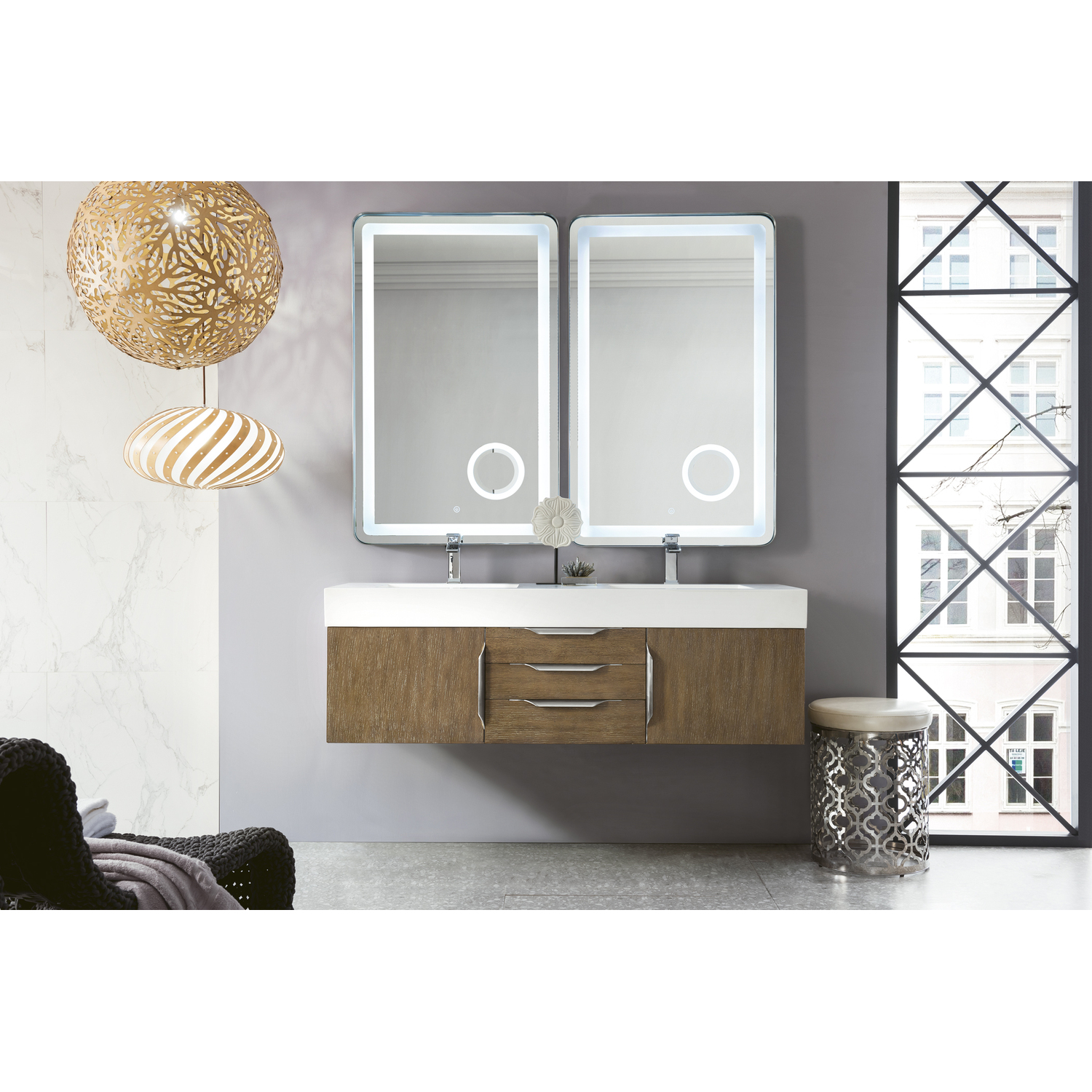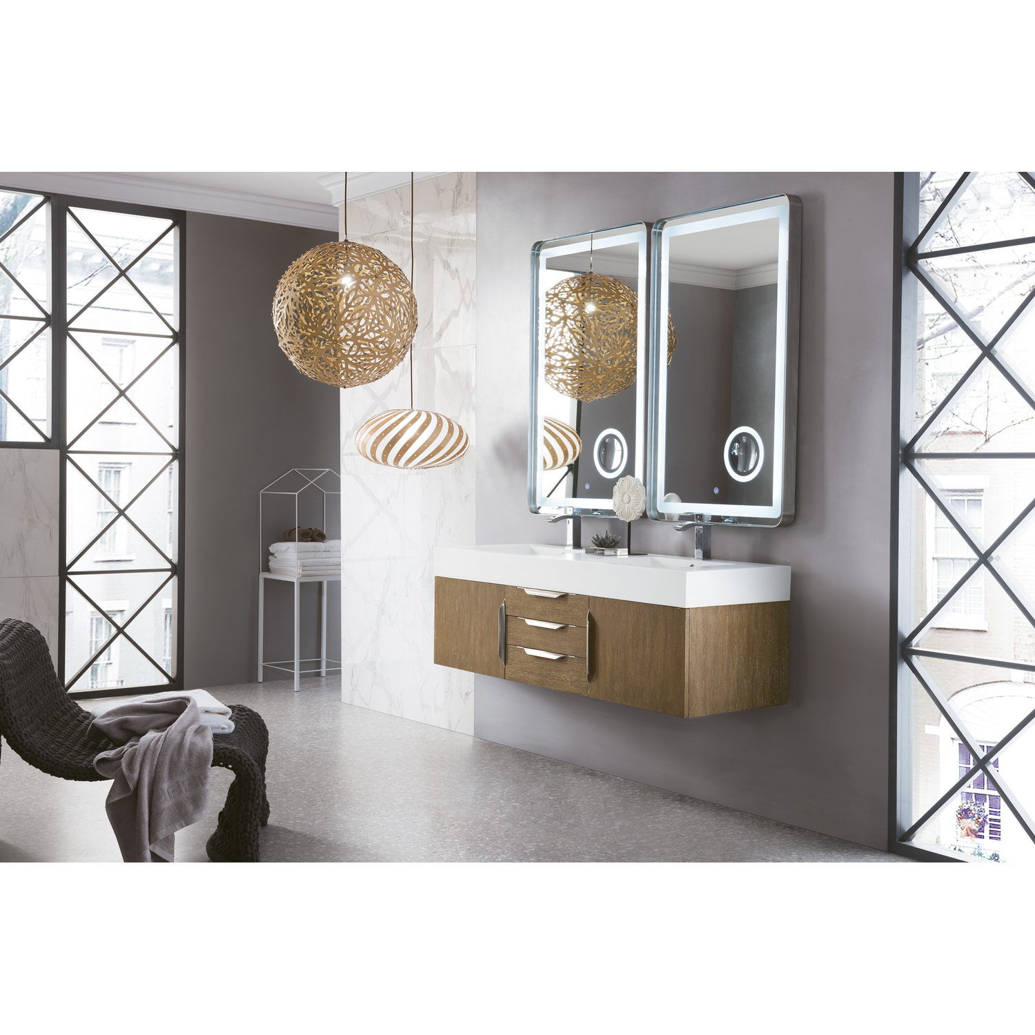 James Martin Columbia 59 inch Double Wall Mount Vanity, Latte Oak, Brushed Nickel w/ Glossy White Composite Stone Top, 840108964954, 983-V59D-W-LO-N-GW