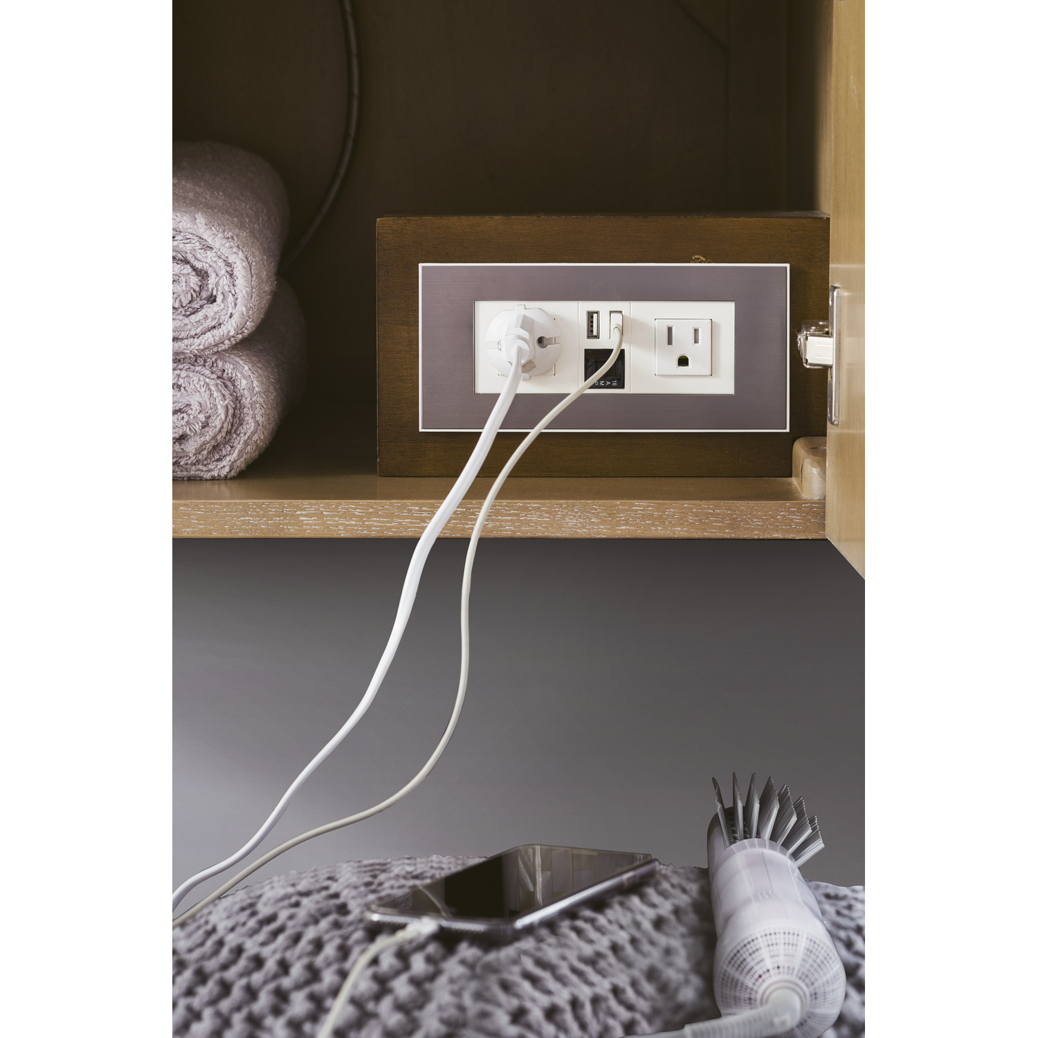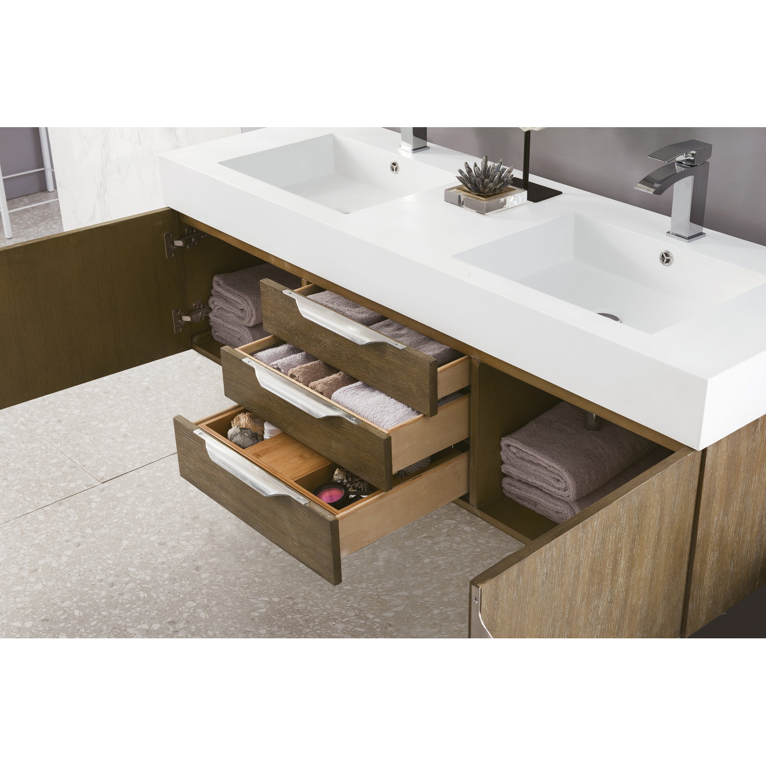The Columbia 59" Latte Oak Double Vanity offers maximum storage with two soft-closing doors and three soft-closing drawers. This cabinet includes premium features such as one solid bamboo drawer organizer and one 120 Volt UL Rated electrical component with two electrical and two USB outlets. Cabinet includes Brushed Nickel door and drawer pulls. Glossy White Composite Stone countertop with integrated sink included. This wall-mounted vanity includes heavy duty mounting brackets to create a modern look.58-7/8" L x 19-5/8" W x 19-1/8"HComposite stone integrated sinktop in Glossy WhiteSolid plywood with Red Oak Veneers120 Volt UL rated electrical component with two electrical and two USB (2.0) outletsTwo doors, three drawersDrawer bottoms are lined with our signature brushed aluminum laminate.Solid bamboo in-drawer organizerStainless Steel Hardware in Brushed NickelSoft-close, undermount drawer glides and soft-close door hinges.Faucet sold separatelySuperior Moisture and UV resistanceThis cabinet can be wall-mounted; mounting hardware includedDiscover elegance redefined with the Columbia Vanity Collection by James Martin Vanities. A testament to modern luxury, this collection brings a transformative touch to your bathroom space. With a choice of three cabinet finishes, each piece in the Columbia collection is a blend of minimalist aesthetics and functional brilliance, featuring sleek, clean lines and sculpted hardware in three metal finish options. Whether you prefer a striking, free-standing statement piece or a sleek, space-saving wall-mounted design, the Columbia collection caters to your unique style. Its innovative installation options, including an optional metal base, ensure a seamless fit into any bathroom layout. The beautiful yet durable composite stone integrated sinktop is impact-resistant with an antibacterial nano-coat surface."1 year warranty against manufacturer's defects. We will repair or replace any defective product, if the product is defective in material or workmanship at our discretion. No warranty is expressed or implied regarding damages resulting from consumer misuse.