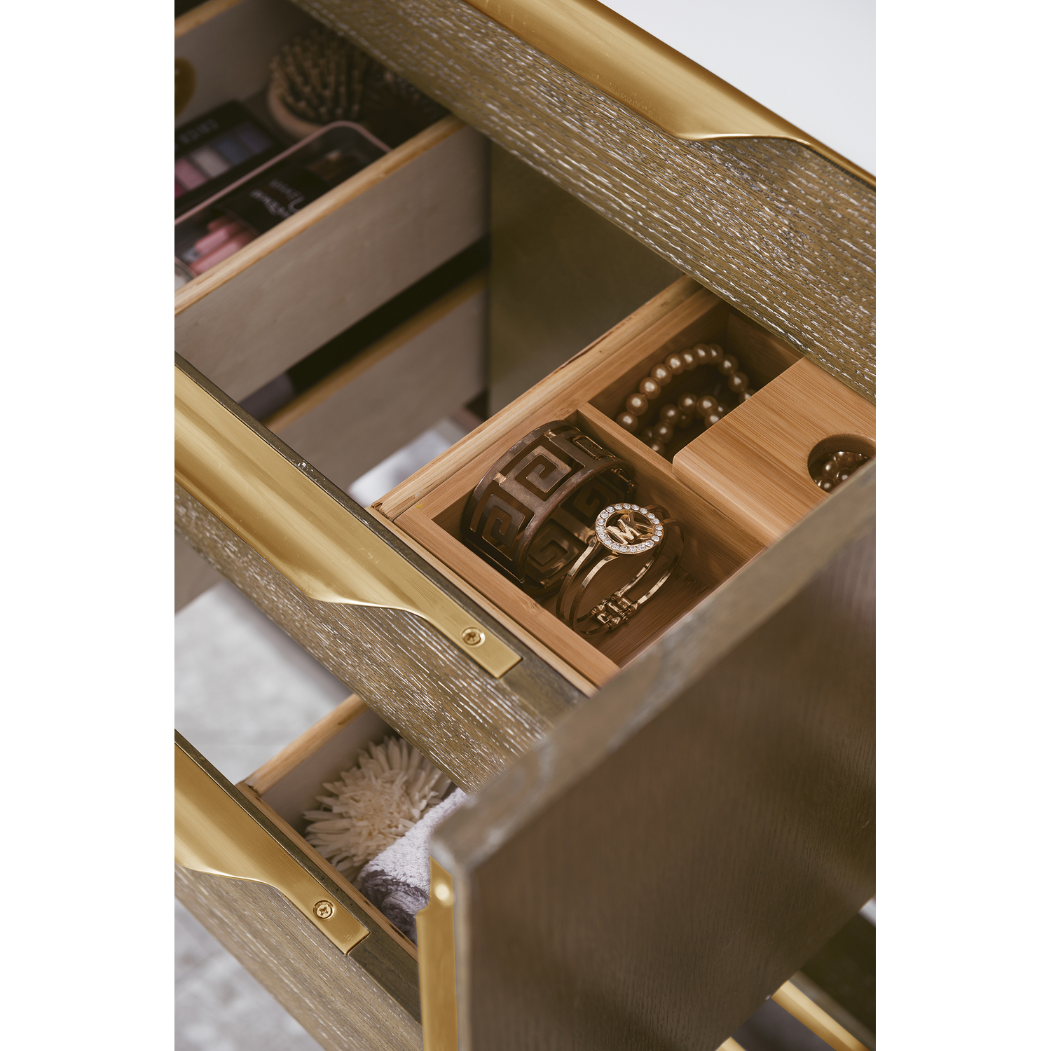 The Columbia 72" Latte Oak Double Vanity offers maximum storage with two soft-closing doors, three soft-closing drawers, and lower shelf space. This cabinet includes premium features such as one solid bamboo drawer organizer and one 120 Volt UL Rated electrical component with two electrical and two USB outlets. The Radiant Gold finished base coordinates with the pulls. Glossy White Composite Stone countertop with integrated wide, angled trough-style sink.Composite stone integrated sink top in Glossy WhiteSolid plywood with Red Oak Veneers120 Volt UL rated electrical component with two electrical and two USB (2.0) outletsFour doors, three drawers, and two exterior shelvesDrawer bottoms are lined with our signature brushed aluminum laminate.Solid bamboo in-drawer organizerStainless Steel Hardware in Radiant Gold FinishDiscover elegance redefined with the Columbia Vanity Collection by James Martin Vanities. A testament to modern luxury, this collection brings a transformative touch to your bathroom space. With a choice of three cabinet finishes, each piece in the Columbia collection is a blend of minimalist aesthetics and functional brilliance, featuring sleek, clean lines and sculpted hardware in three metal finish options. Whether you prefer a striking, free-standing statement piece or a sleek, space-saving wall-mounted design, the Columbia collection caters to your unique style. Its innovative installation options, including an optional metal base, ensure a seamless fit into any bathroom layout. The beautiful yet durable composite stone integrated sinktop is impact-resistant with an antibacterial nano-coat surface."1 year warranty against manufacturer's defects. We will repair or replace any defective product, if the product is defective in material or workmanship at our discretion. No warranty is expressed or implied regarding damages resulting from consumer misuse.