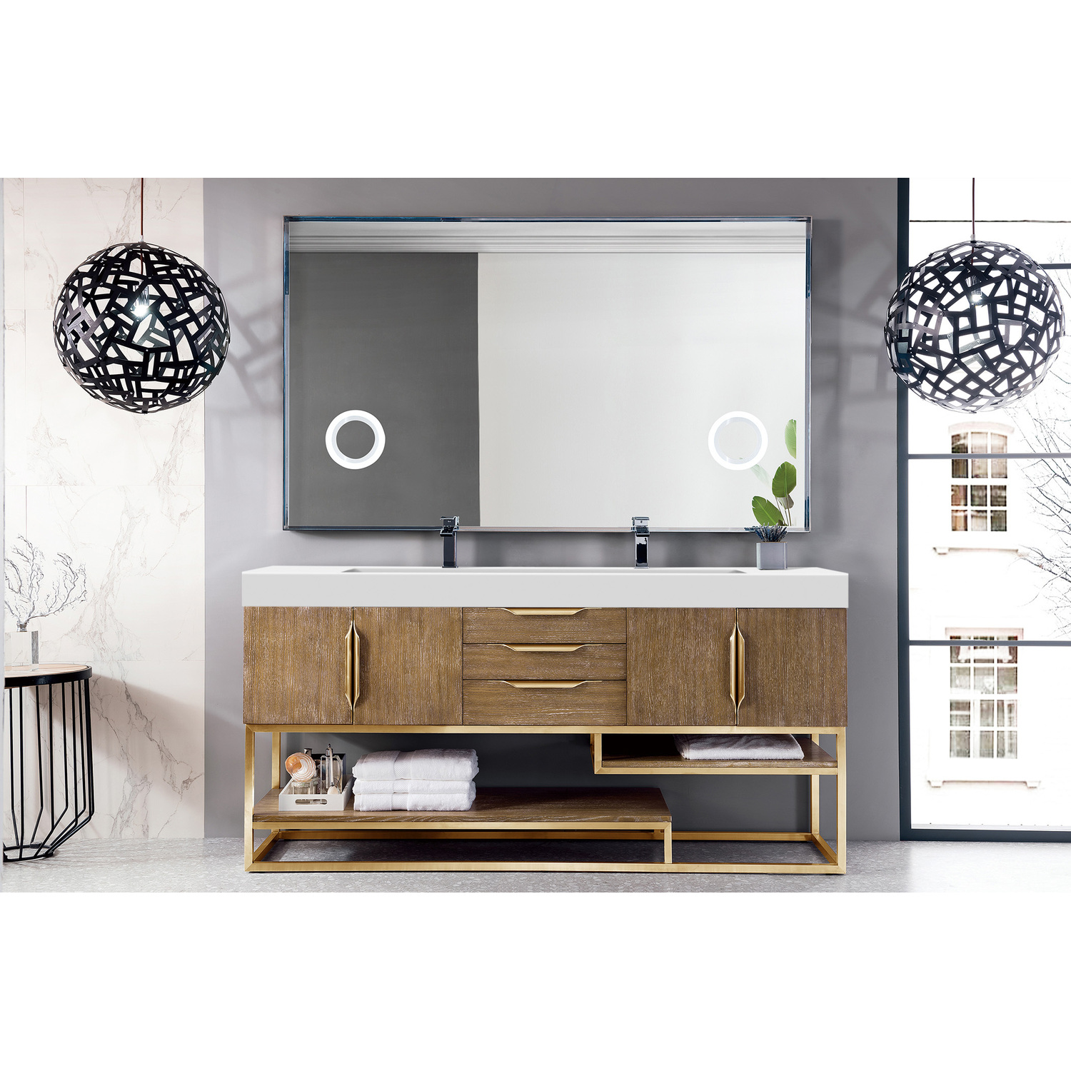 James Martin Columbia 72 inch Double Vanity, Latte Oak, Radiant Gold w/ Glossy White Composite Stone Top, 840108964367, 983-V72D-LTO-RG-GW