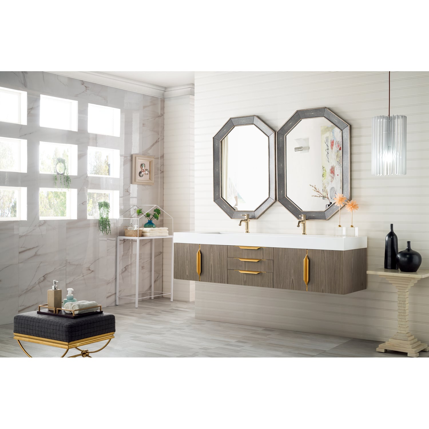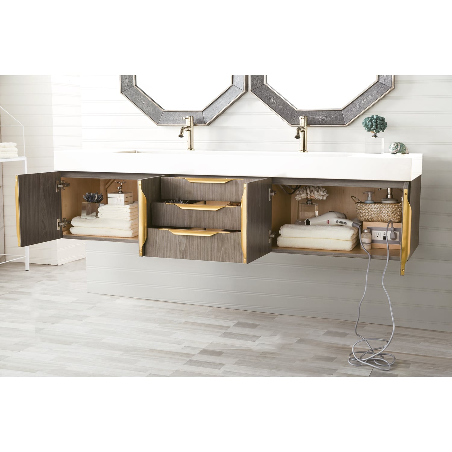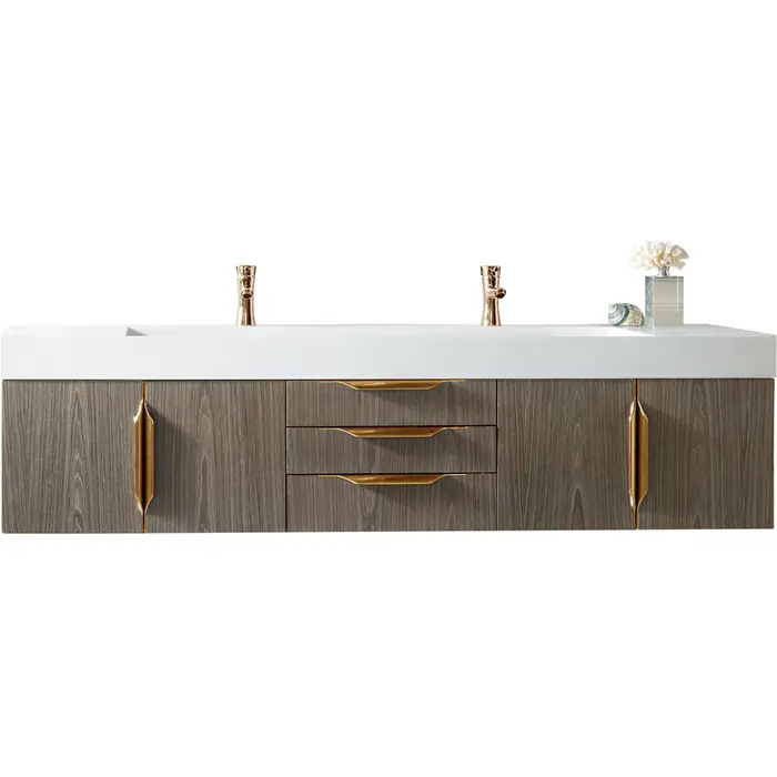 James Martin Columbia 72 inch Double Wall Mount Vanity, Ash Gray, Radiant Gold w/ Glossy White Composite Stone Top, 840108965036, 983-V72D-W-AG-G-GW