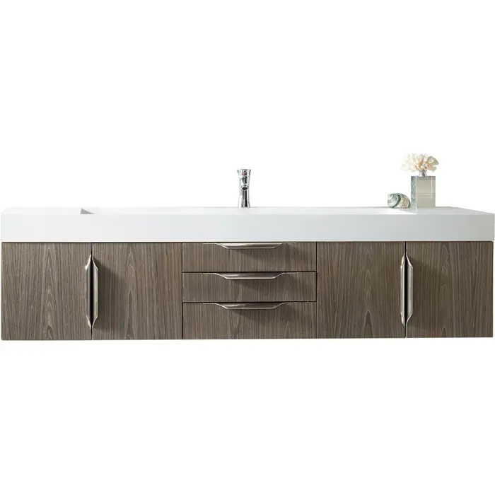 James Martin Columbia 72 inch Single Wall Mount Vanity, Ash Gray, Brushed Nickel w/ Glossy White Composite Stone Top, 840108965197, 983-V72S-W-AG-N-GW