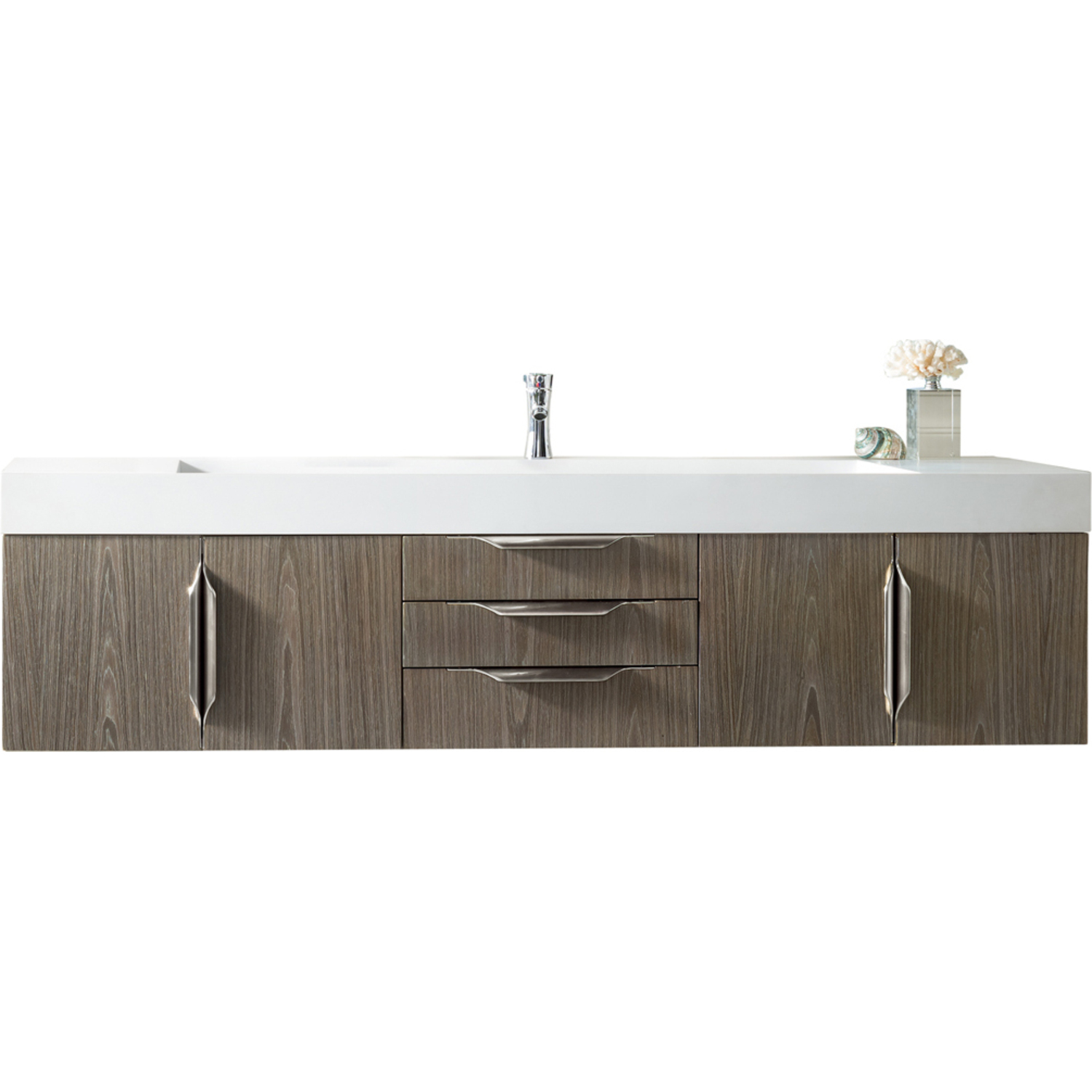 The Columbia 72" Ash Gray Single Vanity offers maximum storage with four soft-closing doors and three soft-closing drawers. This cabinet includes premium features such as one solid bamboo drawer organizer and one 120 Volt UL Rated electrical component with two electrical and two USB outlets. Cabinet includes Brushed Nickel door and drawer pulls. Glossy White Composite Stone countertop with integrated wide, angled trough-style sink. This wall-mounted vanity includes heavy duty mounting brackets to create a modern look.Composite stone integrated sink top in Glossy WhiteSolid plywood with engineered veneer meticulously created using real wood fibers carefully selected and dyed to create this unique pattern and warm gray color combination120 Volt UL rated electrical component with two electrical and two USB (2.0) outletsFour doors, three drawersDrawer bottoms are lined with our signature brushed aluminum laminate.Solid bamboo in-drawer organizerStainless Steel Hardware in Brushed NickelThis cabinet can be wall-mounted; mounting hardware includedDiscover elegance redefined with the Columbia Vanity Collection by James Martin Vanities. A testament to modern luxury, this collection brings a transformative touch to your bathroom space. With a choice of three cabinet finishes, each piece in the Columbia collection is a blend of minimalist aesthetics and functional brilliance, featuring sleek, clean lines and sculpted hardware in three metal finish options. Whether you prefer a striking, free-standing statement piece or a sleek, space-saving wall-mounted design, the Columbia collection caters to your unique style. Its innovative installation options, including an optional metal base, ensure a seamless fit into any bathroom layout. The beautiful yet durable composite stone integrated sinktop is impact-resistant with an antibacterial nano-coat surface."1 year warranty against manufacturer's defects. We will repair or replace any defective product, if the product is defective in material or workmanship at our discretion. No warranty is expressed or implied regarding damages resulting from consumer misuse.