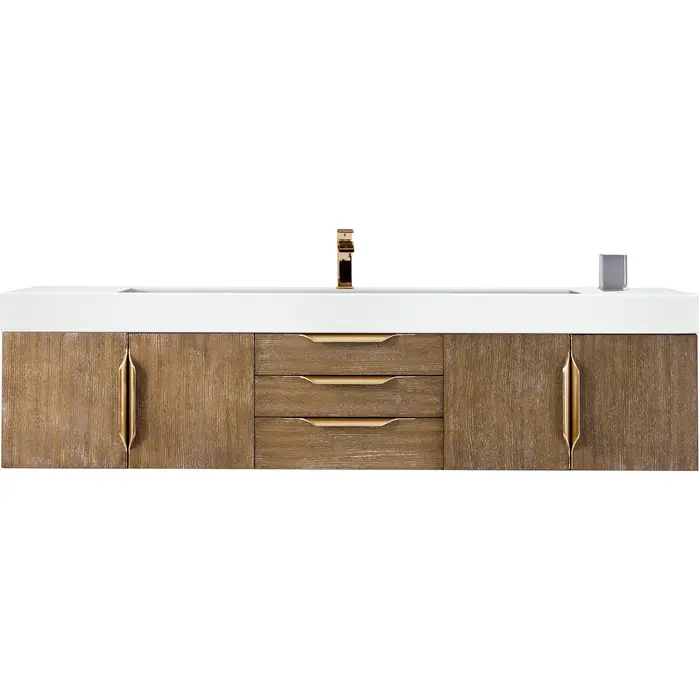 James Martin Columbia 72 inch Single Wall Mount Vanity, Latte Oak, Radiant Gold w/ Glossy White Composite Stone Top, 840108965333, 983-V72S-W-LO-G-GW